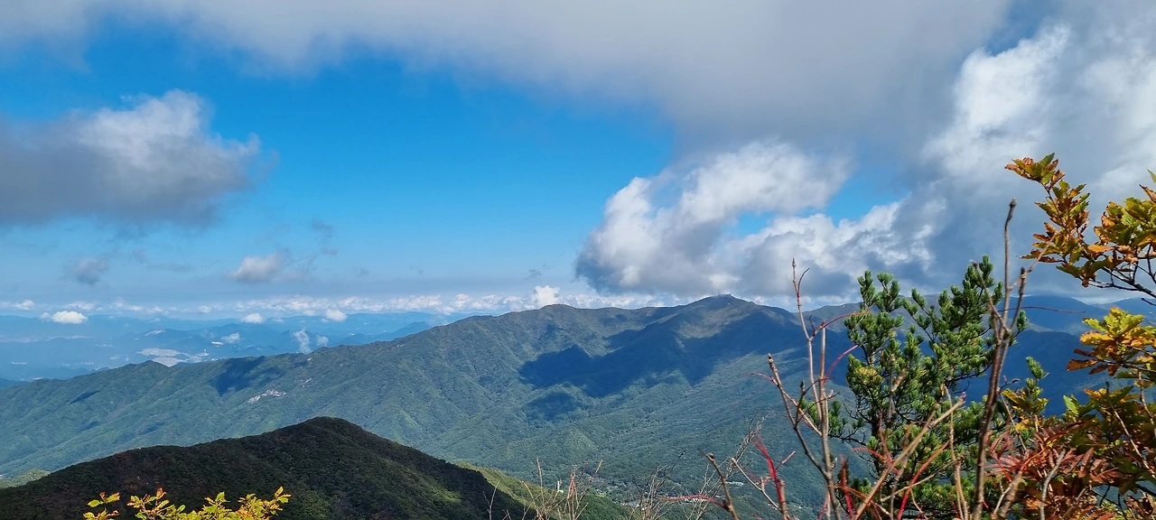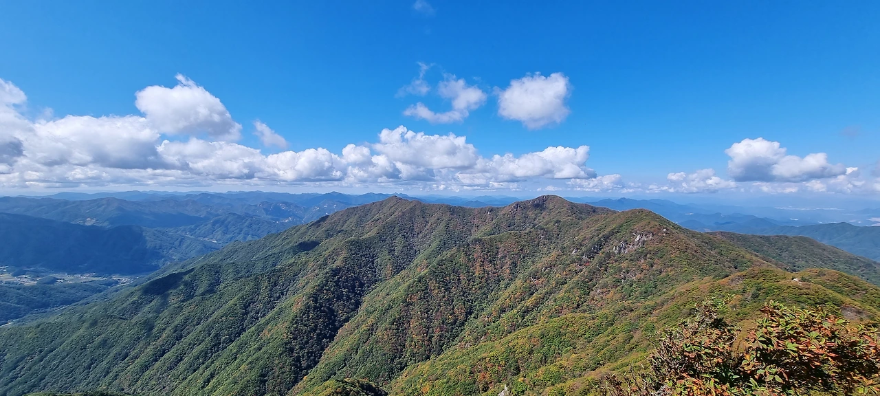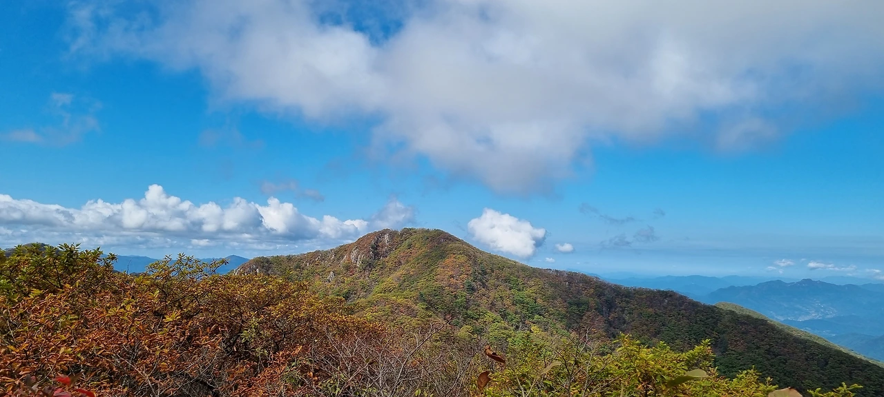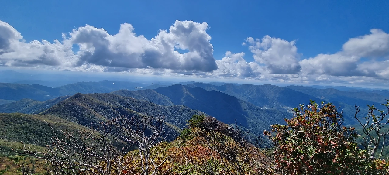 산을 오른다. 산행길은 너무 좋다. 흙산의 연속이다. 도솔봉까지 가는 길에 바위를 넘는 것은 거의 드물다. 처음은 흰봉산을 오른다고 보아야 할 것이다. 재미있는 것은 소백산의 줄기인데 흰봉산이라고 표기되어 있다. 그리고 조금 더 가면 도솔봉이다. 도솔봉의 높이가 1315m이고 흰봉산은 1,261m이다. 그리고 흰봉산 정상으로 가는 길은 입산 통제되어 있다. 흰봉산을 지나고 도솔봉으로 간다. 흰봉산을 가면서 산죽이 모든 것을 장악하고 있다. 산죽 사이에 난 길을 걸는다. 흰봉산에서 도솔봉으로 가면서 처음으로 아래로 내려가면서 도솔봉으로 가는데 흰봉산과 멀리 연하봉이 보인다. 이를 담아본다.