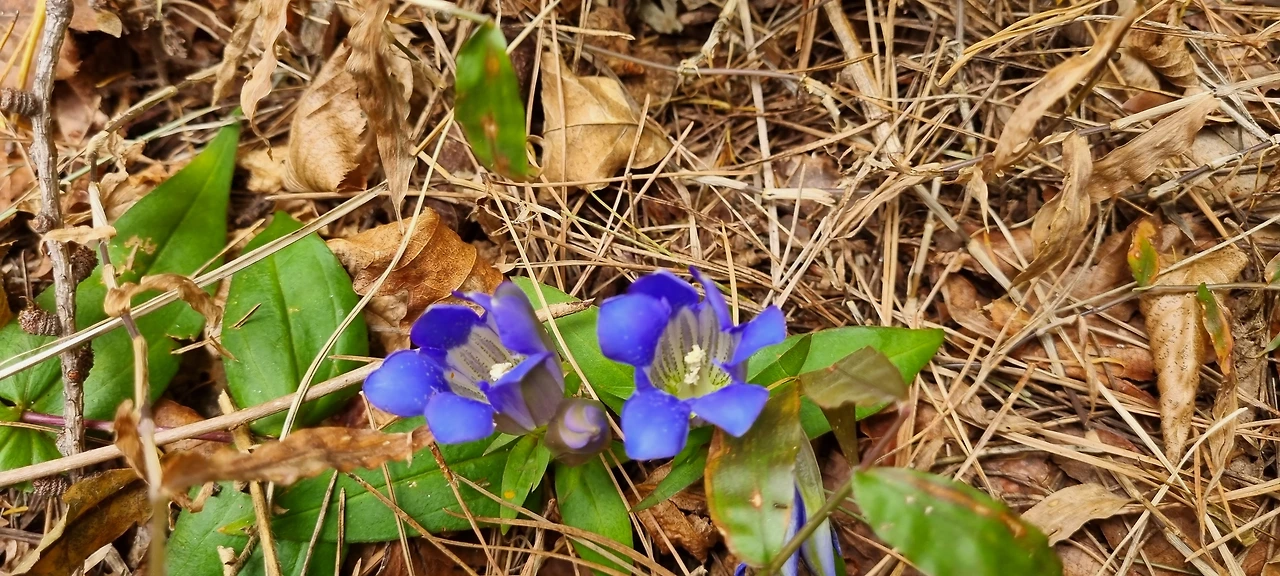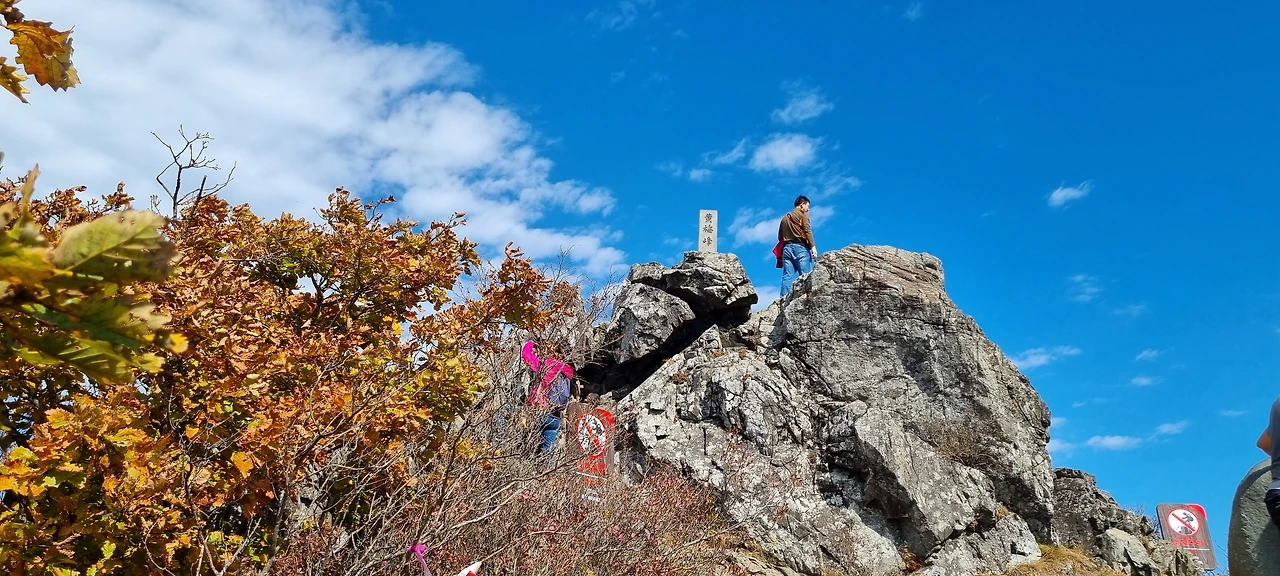 하늘계단이 있는 곳에서 황매산 정상을 돌아보면서 억새와 단풍과 산이 조화를 이룬 장소에서 너도나도 사진을 담을 뿐이다. 억새 군락지의 끝이라고 보아야 할 것이다. 철쭉 군락지의 시작이다. 철쭉 군락지를 지난다. 봄철이면 꽃이 만발하였겠지만 가을이 깊어가는 이 시점에 계절을 잊은 녀석이 몇 송이 피어 있다. 양지바른 곳에서 계절을 잊어버린 것이다.