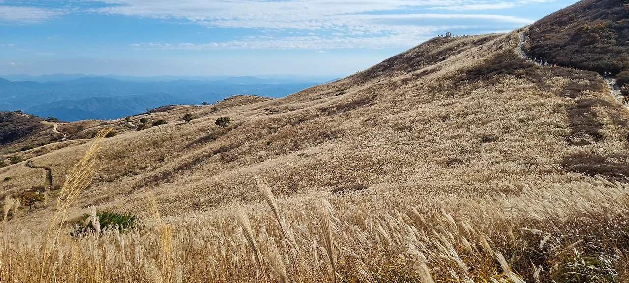지리산이라는 영화를 촬영하기 위하여 설치해 놓은 누각도 어쩌면 하나의 소품으로 그대로 남아 있을 수 있다. 억새를 배경으로 사진도 담고 하늘계단까지 걷는다. 어르신들도 걷고 어린이들도 걷는다. 연인들도 걷는다. 산꾼들도 걷는다. 산청 쪽에서 올라오신 분들이 힘겹게 올라와서 억새를 즐긴다. 그리고 황매산 정산을 바라보고 고민을 한다. 고민을 하면서 오른쪽, 왼쪽을 고민하다가 정면으로 가신다. 억새 사이로 들어가는 것이다. 억새 사이에 난 길에 사진을 담는 사람이 많다. 우리도 동참해 본다.