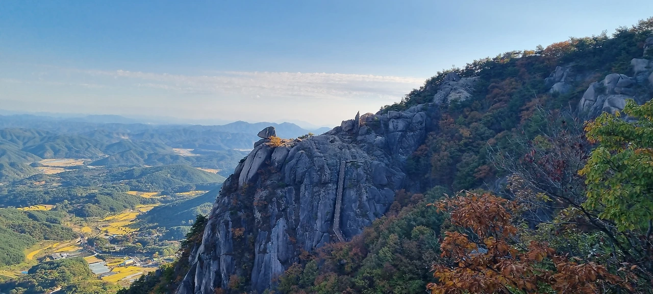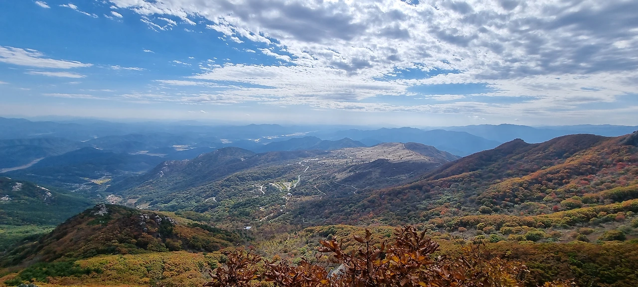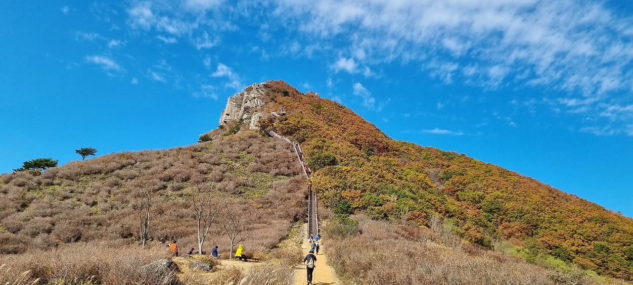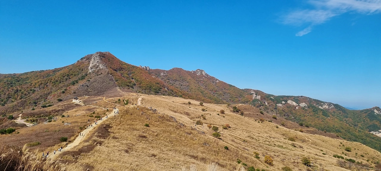 중봉을 지나고 상봉을 지나고 삼봉을 바로 앞에 두고 우회하라고 한다. 중봉에서 앞으로 돌아보고 뒤를 돌아보고 사진을 담고 정자에 앉아서 점심을 해결하는 사람을 쳐다보면서 황매산 정상과 황매산 아래의 억새밭을 동시에 담아본다. 사진을 찍으면서 하늘이 너무 아름답다. 하늘과 억새와 산이 어우러져 있다. 1년 전에 이곳에 왔을 때 이곳을 오지 않고 내려간 것이 후회스럽다. 이렇게 멋진 곳을 보지 않고 그냥 지나친 것이다. 오르고 내리고 다시 오른다. 삼봉은 위험하여 우회하라고 한다. 하지만 그냥 오르는 사람도 있다. 오늘은 내 몸상태가 그곳을 오를 수 있는 상태가 아니기에 안전을 찾아서 우회를 한다. 어떤 단체 산행객들이 즐겁게 떠들고 있다. 그 무리들을 피하여 지나친다. 그들은 이곳에서 바로 억새밭이 있는 곳으로 하산을 한다고 한다. 가파르게 내려갈 것이다.