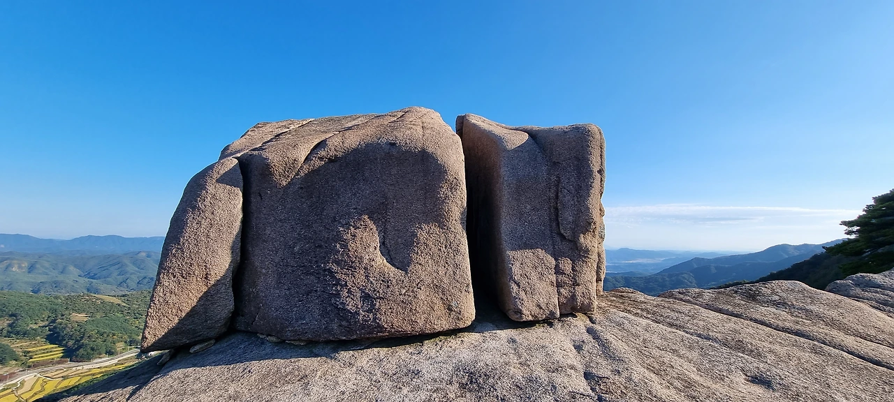 모산재를 바로 앞에 두고 영암사지로 내려가는 길을 따라 돛대바위로 내려간다. 가까이서 보면 그것이 잘 보이지 않는다. 100m 지점에서 보면 그것이 보이지 않는다. 내려갔다가 다시 올라와서 모산재에 도착하여 돛대바위를 본다. 이곳에서 보면 돛대가 보인다. 사실 돛대바위가 있는 곳에서 모산재가 있는 능선을 바라보면 기암괴석이 그대로 보이는 절경이 있다고 보아야 할 것이다. 그것을 보려고 갔다고 해야 될 것이다. 서로를 멀리서 보고 감상을 해야 될 것 같다. 득도바위가 있고 순결바위가 있다.
