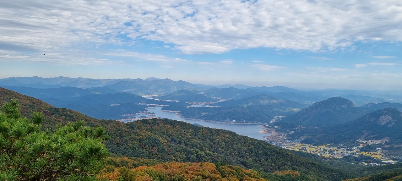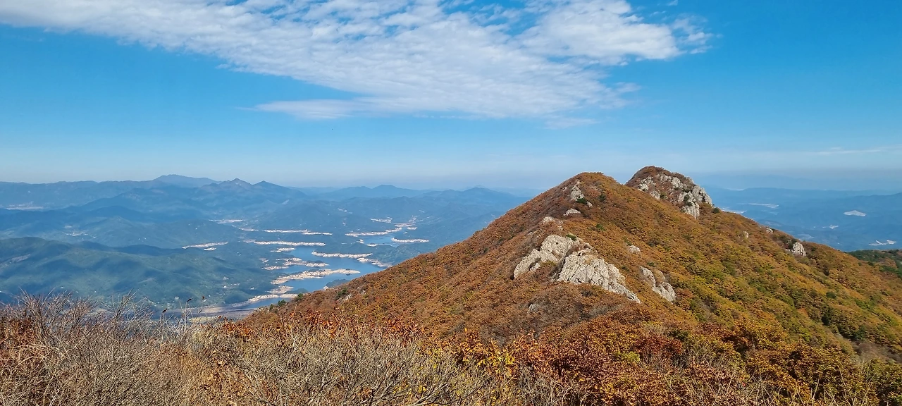 육산에서 서서히 암산으로 바뀌었다가 다시 육산으로 변모한다. 암산으로 변모하였을 때 그렇게 험악하지 않고 그냥 즐길 수 있고 주변을 둘러볼 수 있다. 할미산성과 치마덤을 알리는 이정표가 있는 봉우리에 누군가가 돌 탑을 쌓아 놓았다. 이제는 황매산 정상이 얼마 남았다고 이정표가 보인다. 지금까지는 삼거리라는 이정표가 주류였는데 황매산 정상이 얼마라는 이정표가 반가울 뿐이다. 좌우가 절경이다. 이런 곳을 그냥 지나가면 상도의가 아니다. 너도나도 사진을 담는다 좌측과 우측을 모두 담는다. 합천호가 굽이굽이 물을 품고 있고 만수위를 이루었다가 이제는 물을 조금씩 줄이면서 하얀 이마를 드러내고 있다. 우측은 황매산 정상과 삼봉이 모습을 드러내고 있고 아래에는 억새밭이 장관을 이루고 있다. 그리고 돌탑 위로 펼쳐지는 하늘은 전형적인 가을 날씨다. 하늘은 높고 말이 살찐다고 해야 될 것이다.