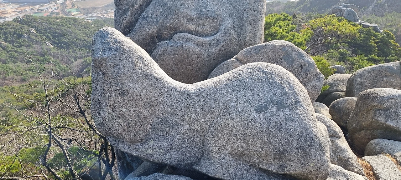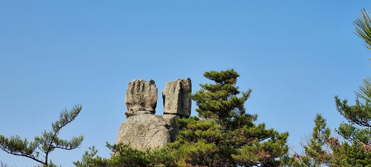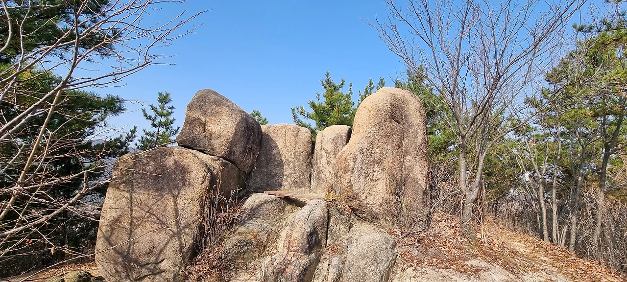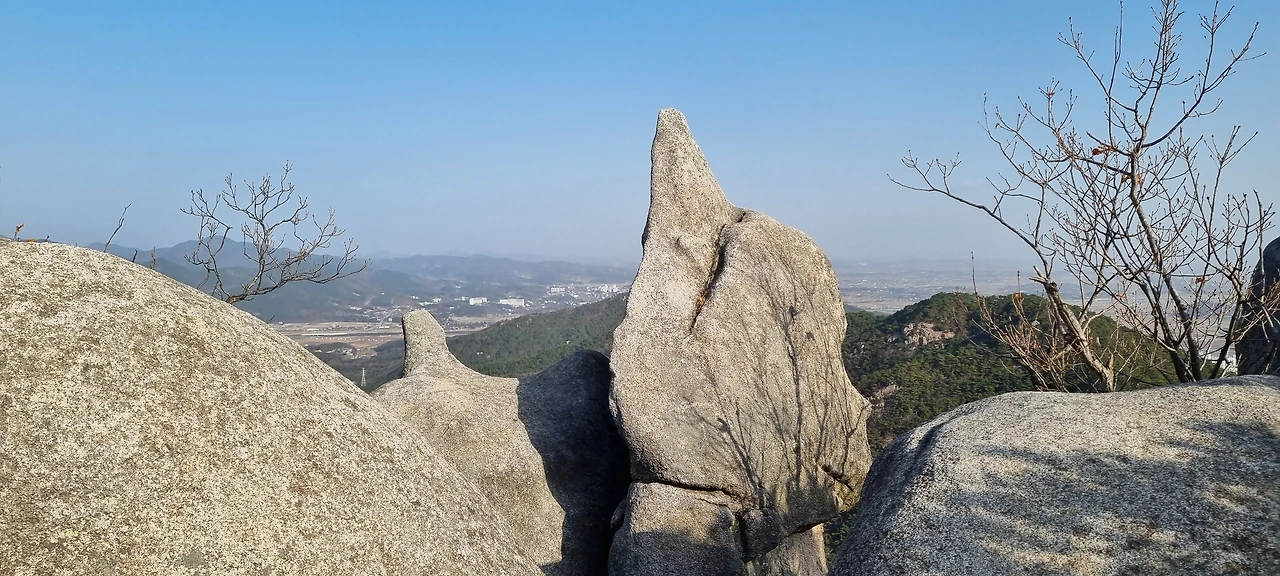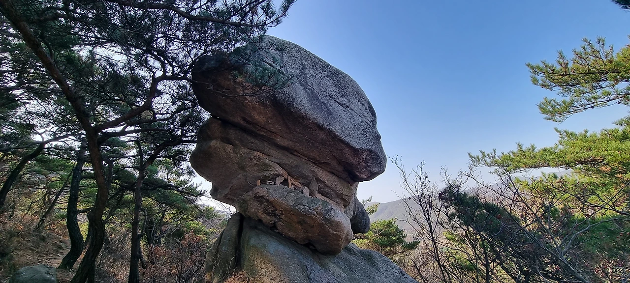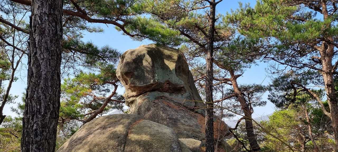 장군바위가 있는 지점이 정상이라고 할 수 있지만 정상석은 이곳에서 2km 이상 더 가야 한다. 가는 길에 의자 바위도 있고 강아지 바위도 있고 오 형제 바위도 있다. 사실 지나가면서 할매바위도 있고 합장바위도 있고 하는데 그렇게 감흥이 없다. 다만, 오형제 바위는 그것에 대한 유래도 있고 그것에 감흥이 있다. 강아지 바위는 이름도 없다. 하지만, 그것을 쳐다보면 강아지 얼굴을 하고 있다. 또한, 지나가면서 자기가 생각하는 것 자체가 그 모양이 되는 것이다.