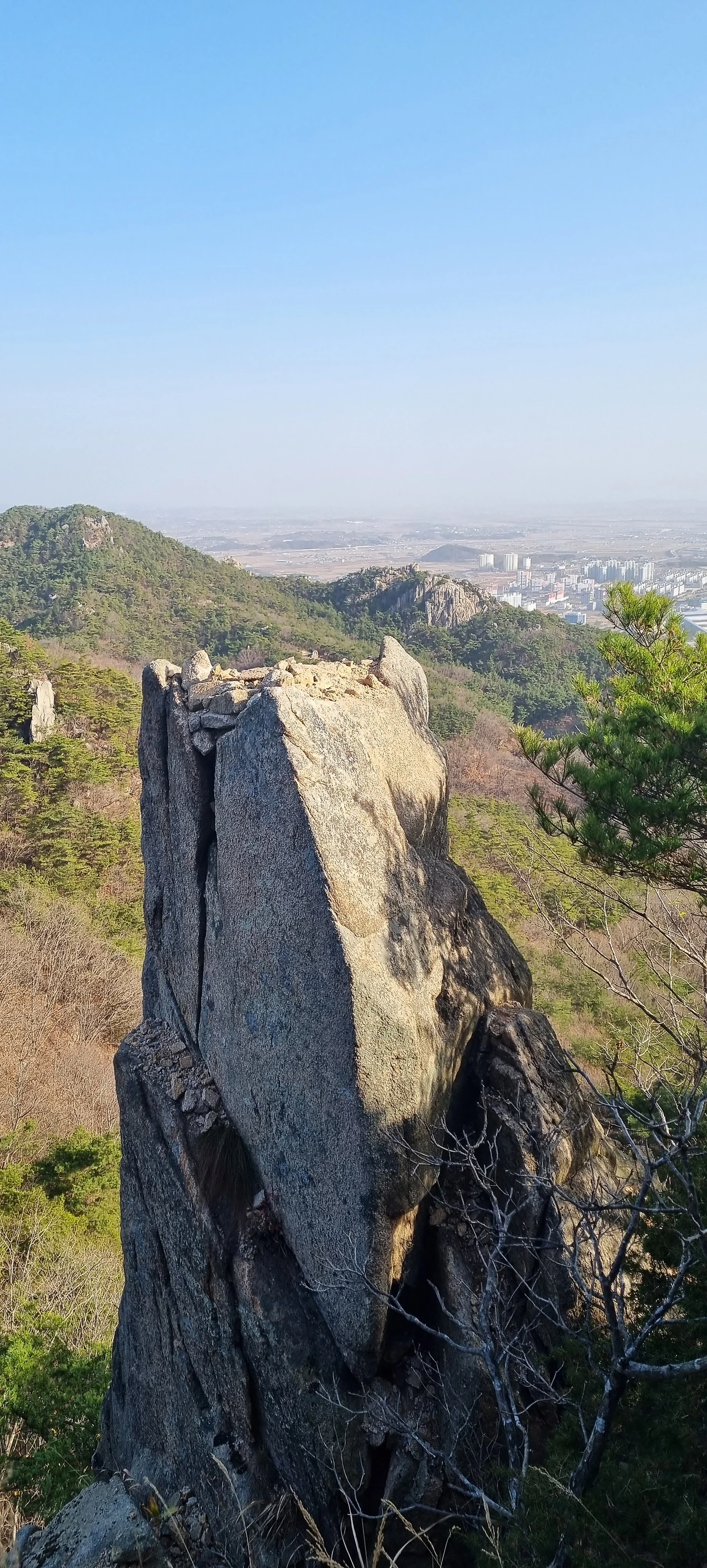 용바위가 있는 봉우리를 오르고 홍성과 예산의 경계선인 전망대에 서 본다. 내포신도시가 보인다. 그리고 이제는 수암산으로 간다. 수암산 어디까지 갈 것인지 고민이지만 정상석이 있는 곳까지 가보기로 한다. 옛날에는 가루실 고개였는데 지금은 이정표가 있다. 뫼 고개라고 한다. 그래도 이름을 변경하였지만 한글로 이름을 변경한 것에 감사를 한다. 수암산까지 2km라고 한다. 장군바위까지 거리라고 생각을 한다. 장군바위까지 오르는 것이 힘들지도 않다. 장군바위를 오르는 길에 연인 바위가 있다. 그 사진을 담을려고 노력을 하고 있다.
