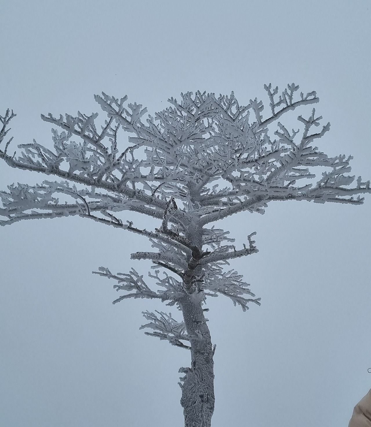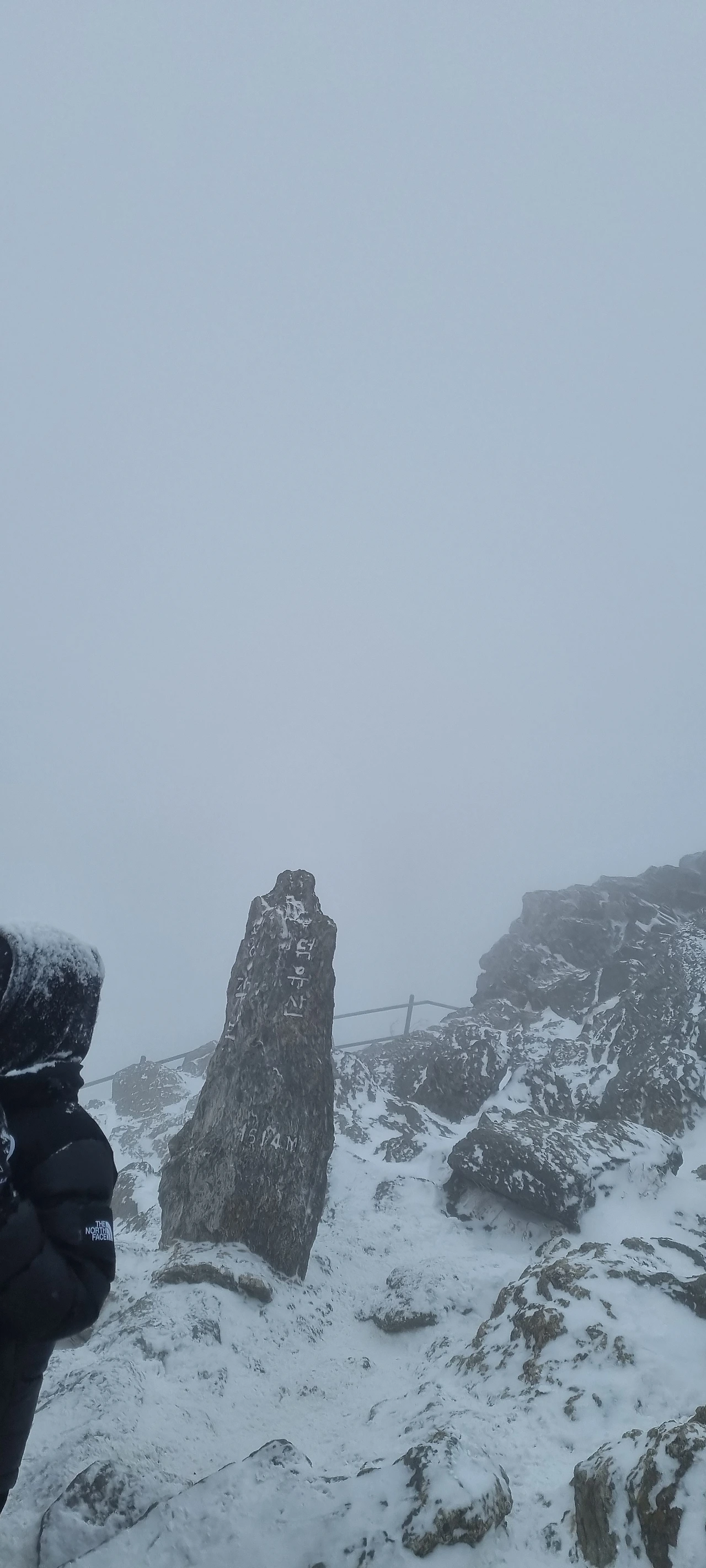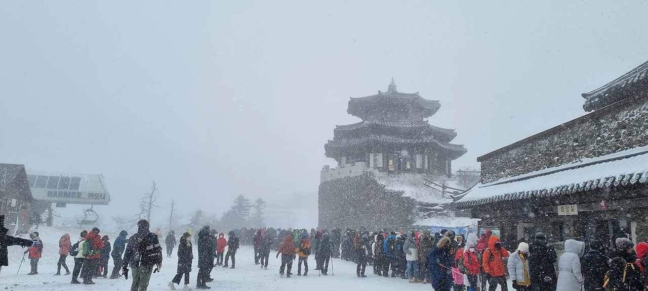 줄을 서고 기다리면서 털모자들이 상고대를 만들고 있다. 발을 동동 구르면서 이웃한 사람의 머리 위의 상고대를 즐긴다.