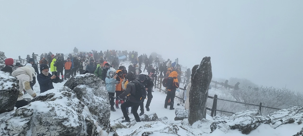 나무 하나가 있다. 모두가 그 나무 앞에 서 있다. 그 나무를 배경으로 인증샷을 남긴다. 이제 정상이다. 정상에 사람들로 가득하다. 아래에 있는 대피소에도 사람들이 가득하다. 그 대피소에서 간식을 먹기 위하여 너도나도 내려간다. 이웃한 주목 군락으로 사람들이 갈 수 있는지 내려가 본다. 하지만, 주목 군락 입구에 국립공원 직원들이 안전을 위하여 지키고 있다. 최근에 일어난 사건 이후 모두가 안전, 안전이다. 오늘의 국립공원 통제도 그렇다고 보아야 할 것이다.