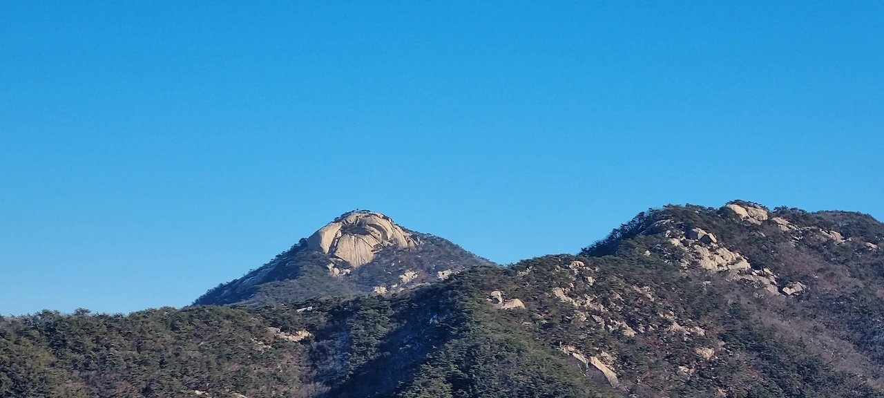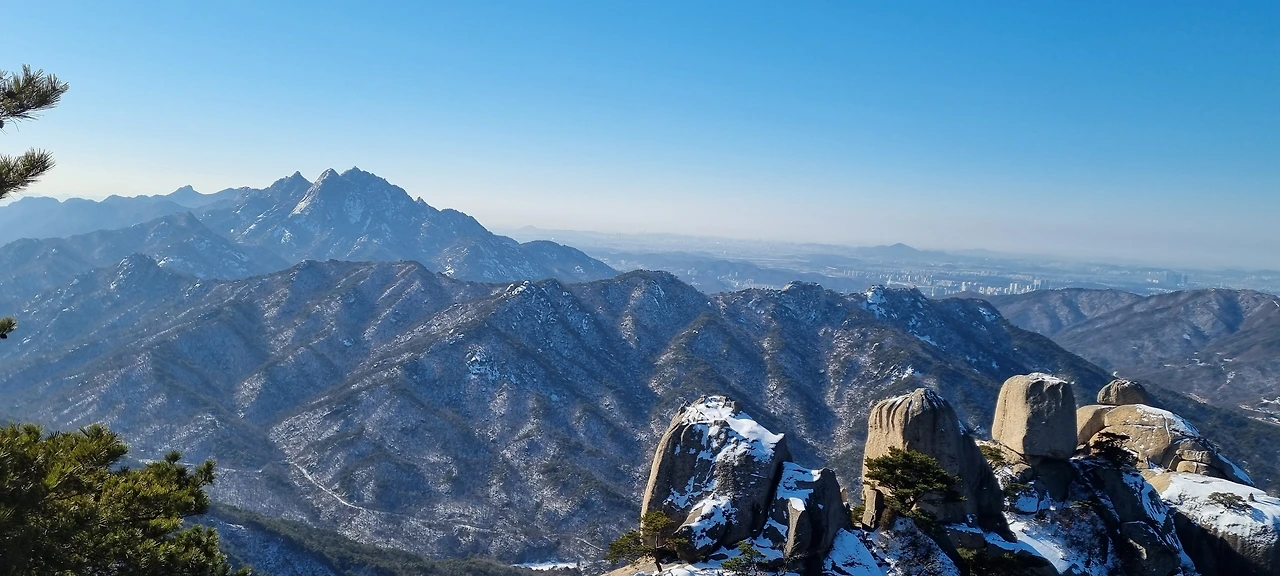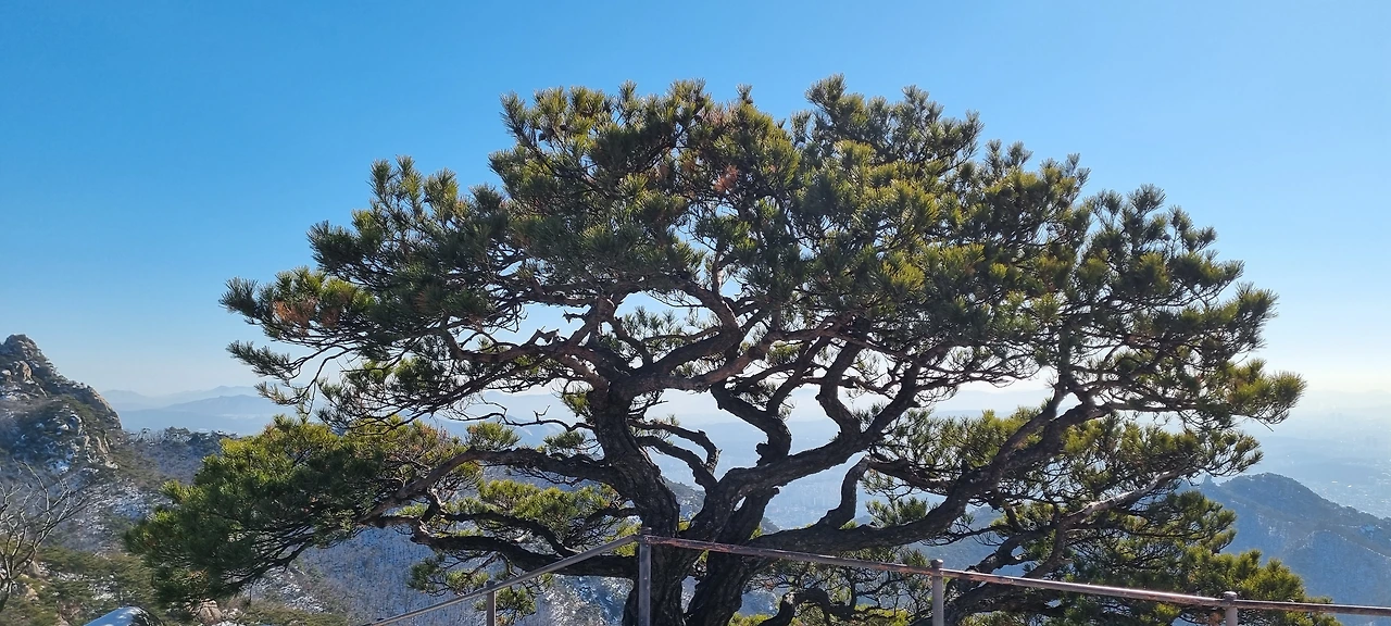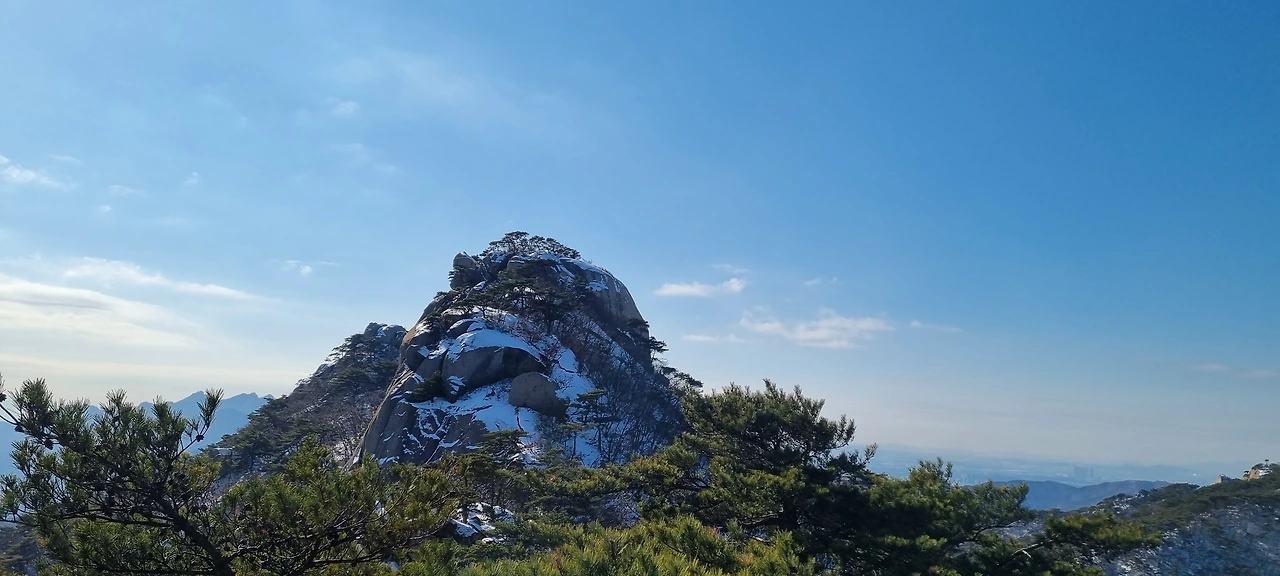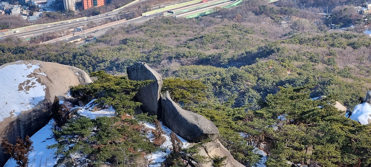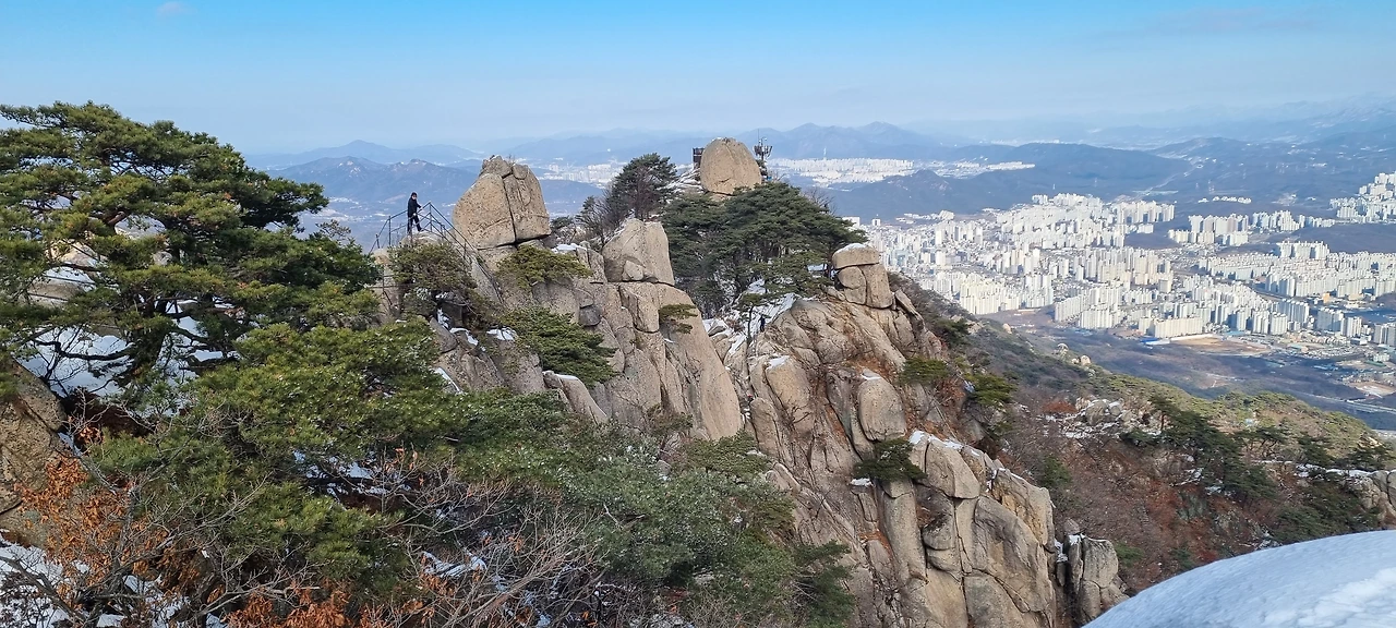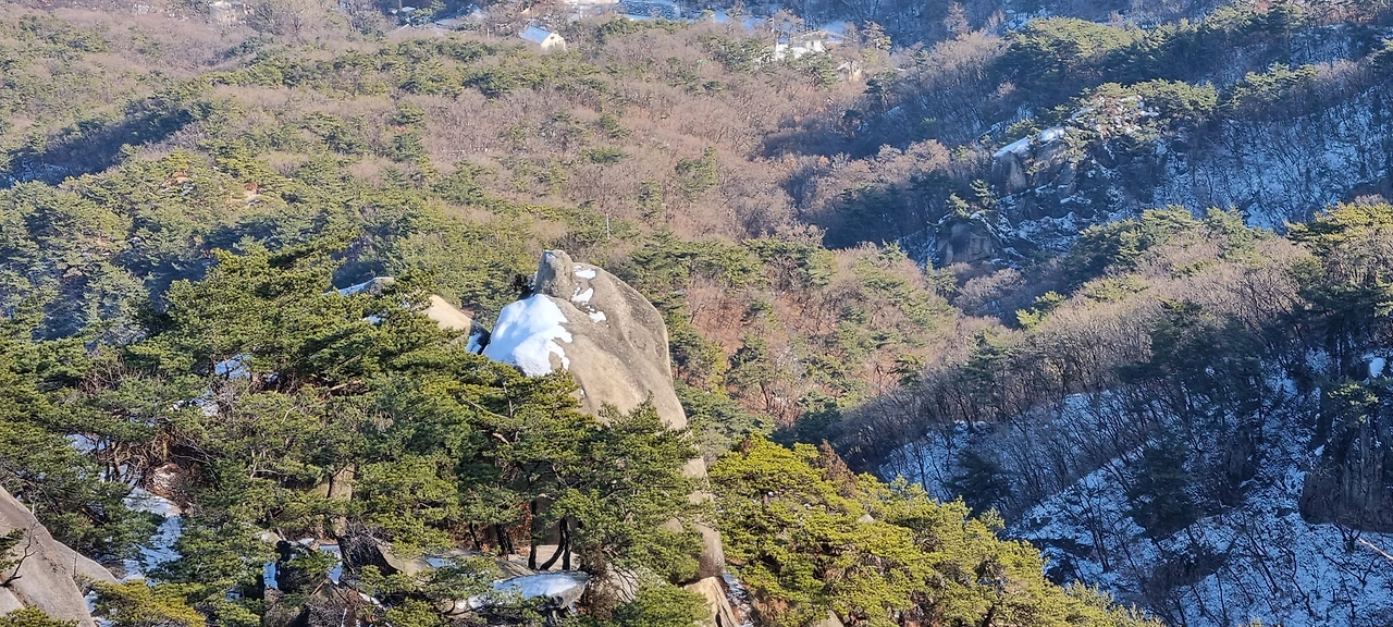 오늘은 한산한 등산이다. 그렇게 많은 사람이 없다. 평상시 같으면 길이 메워졌을 것인데 오늘은 그렇지 않다. 섣달그믐날의 산행이 그렇다고 보아야 할 것이다. 오봉이다. 오봉에서 아래로 사진을 담고 멀리 북한산을 다시 한번 담는다. 그리고 오봉에 있는 반송처럼 자라고 있는 소나무 한그루를 담아본다. 말썽을 부리든 스틱이 기억코 완벽하게 말썽을 부린다. 스틱이 돌틈에 끼였는지 똑 부러진다. 이제 스틱 한 개로 오늘의 산행을 종료하여야 한다. 겨울날 추위에 스틱도 얼어서 그렇게 부러진 것으로 생각한다.