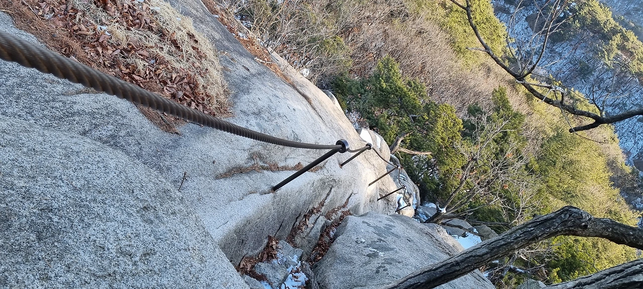 이런 얘기 저런 얘기를 하면서 산을 오를 뿐이다. 갑자기 스틱이 말썽을 부린다. 겨울산은 장비가 매우 중요한 역할을 한다. 아이젠은 눈과 얼음길을 문제없이 걸을 수 있게 걷게 하고, 스패츠는 눈길에도 신발 속에 눈이 들어가지 않도록 방어해 주고 안면마스크는 찬바람을 막아준다. 여성봉을 오르는 암릉에서 바닥이 미끄러워 아이젠을 착용을 한다. 오를 때는 아이젠이 없어도 문제가 없는데 암릉에 눈이 녹았다 얼었다 하면서 얼음이 되어 있다. 안전봉을 잡고서도 온몸에 힘이 들어갈 뿐이다. 발이 안정되는 것이 무엇보다 중요한 만큼 아이젠을 착용하고 걷는다. 이렇게 편한 걸 하면서 걷는다.