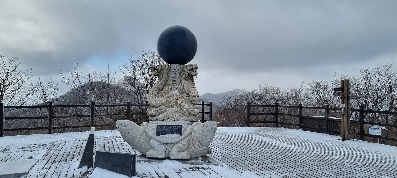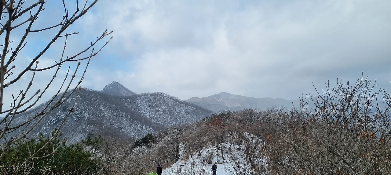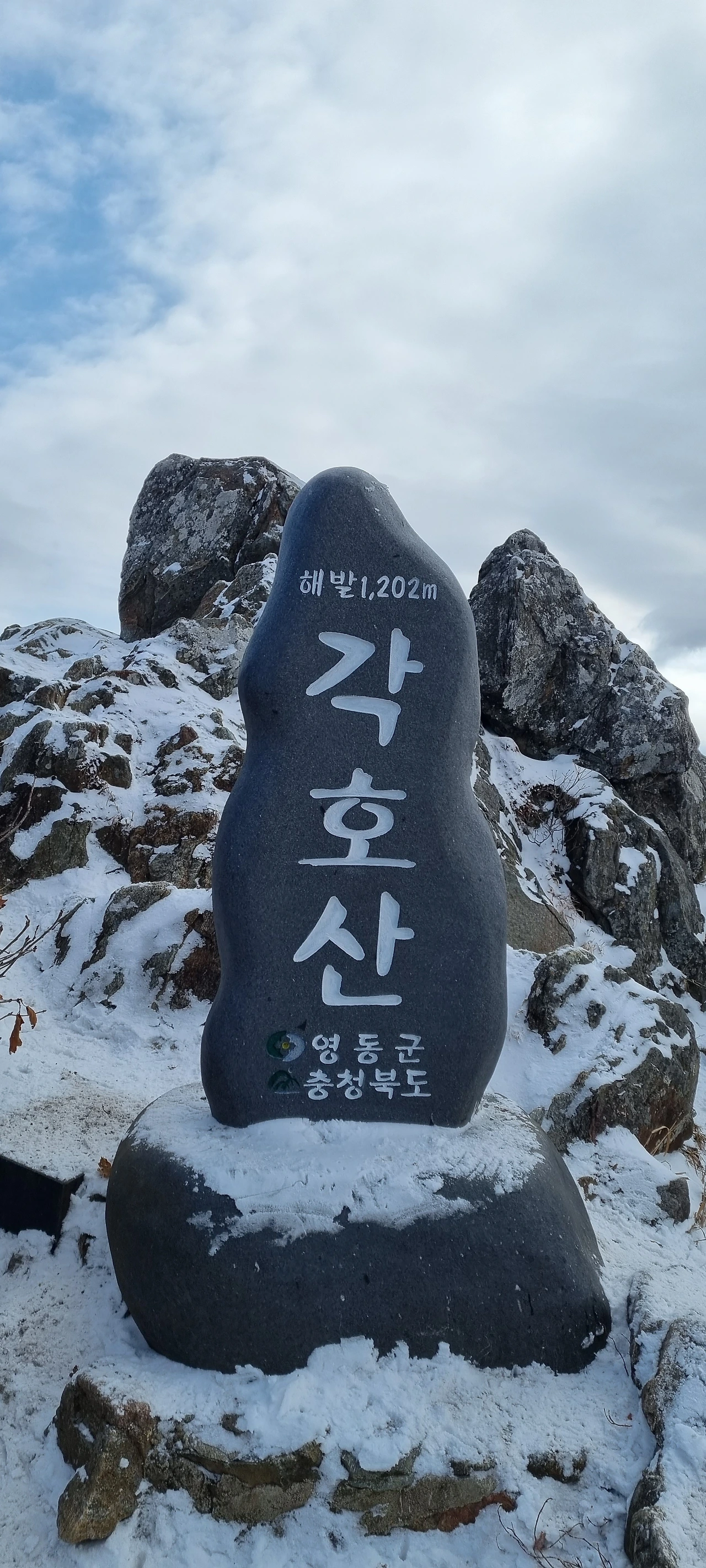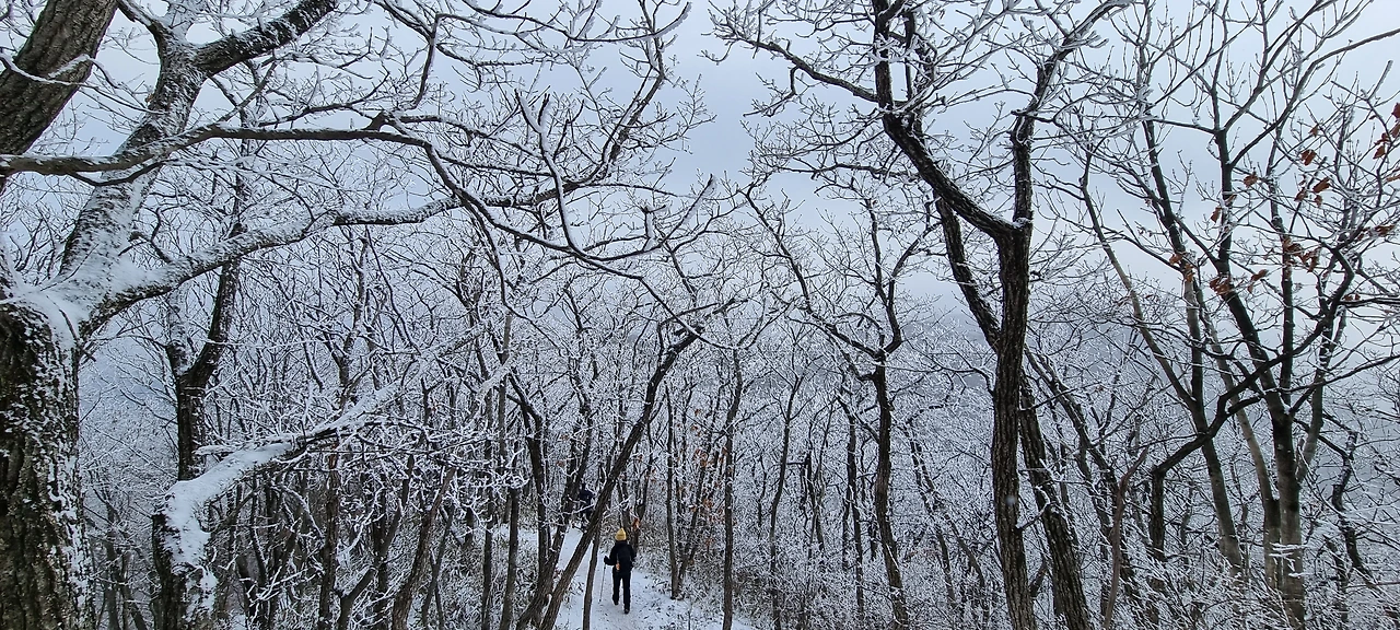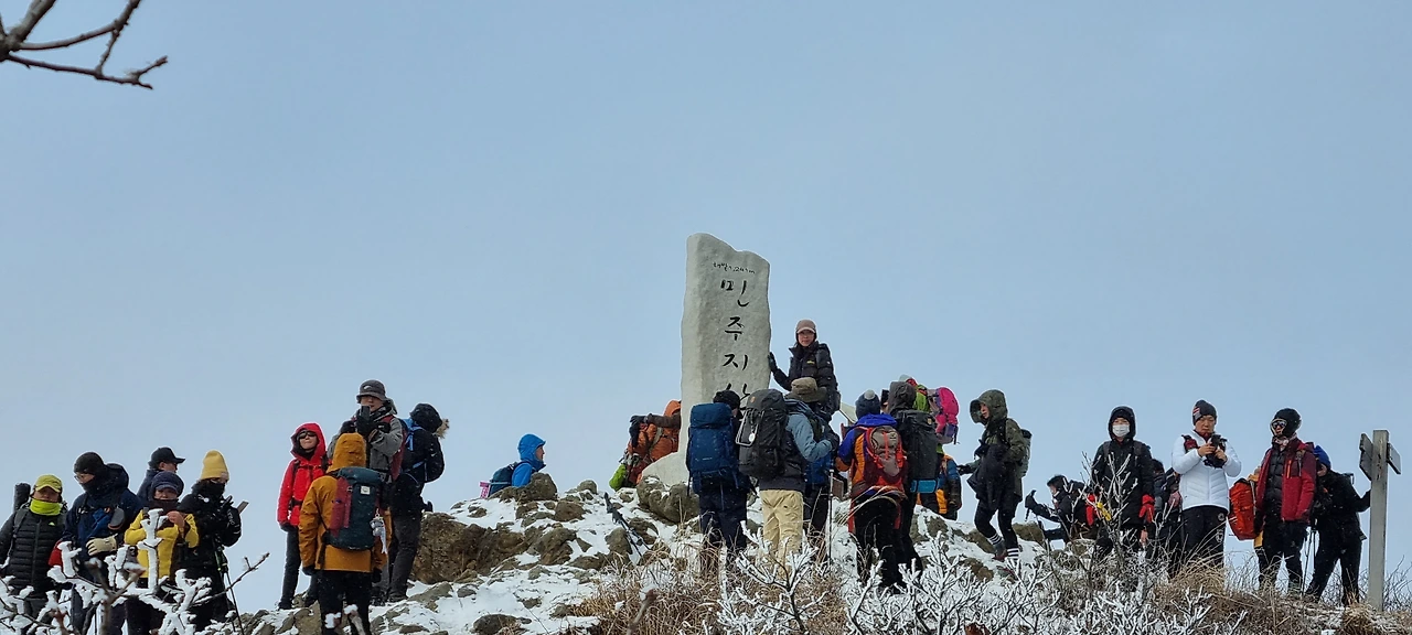 각호산을 오른다. 숨도 쉬지 않고 오르는 사람들도 있지만 도마령 표지석도 사진으로 담고 예전의 전망대에 서서 경치를 감상을 한다. 간이 화장실에서 급한 볼일을 해결하는 사람들이 줄을 서고 있다. 그것에 동참도 해본다. 부산과 서울에서 온 안내산악회 버스들이 비슷한 시간에 동시에 도착하여 등산로를 가득 메우고 있다. 등산로에 들어서고 바로 오르니 정자가 하나 있다. 저 정자가 전망대를 가름할 것 같은데 전망대를 세우고 있다. 정자 앞에 사람들이 옹기종기 앉아서 겨울장비를 착용하고 있다. 조금 오르고 나니 장비 없이 오르는 것은 무리라고 생각하는 사람, 안전을 우선시하는 사람들이 옹기종기 앉아 있는 것이다. 그렇지 않은 사람들은 그냥 오른다. 비슷한 시간에 도착한 버스로 인하여 등산로는 가득하고 눈길로 인하여 등산로는 단순하여 빠르게 진행하지는 못한다. 다만, 각호산을 오르는 등산로가 가파른 만큼 어느 정도 오르면 잠시 비껴 서서 숨을 고르고 있는 등산객들이 있어 뭉쳐져 있든 산행길이 길게 늘어진다.