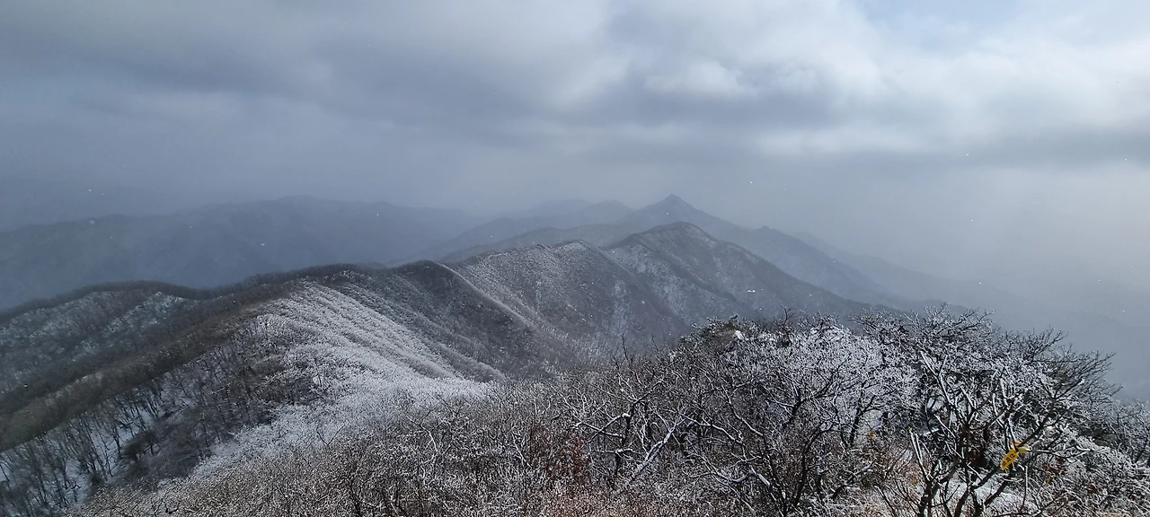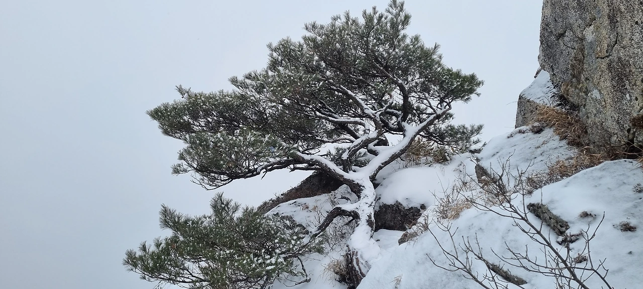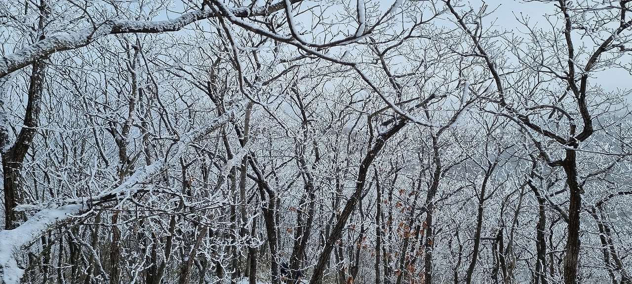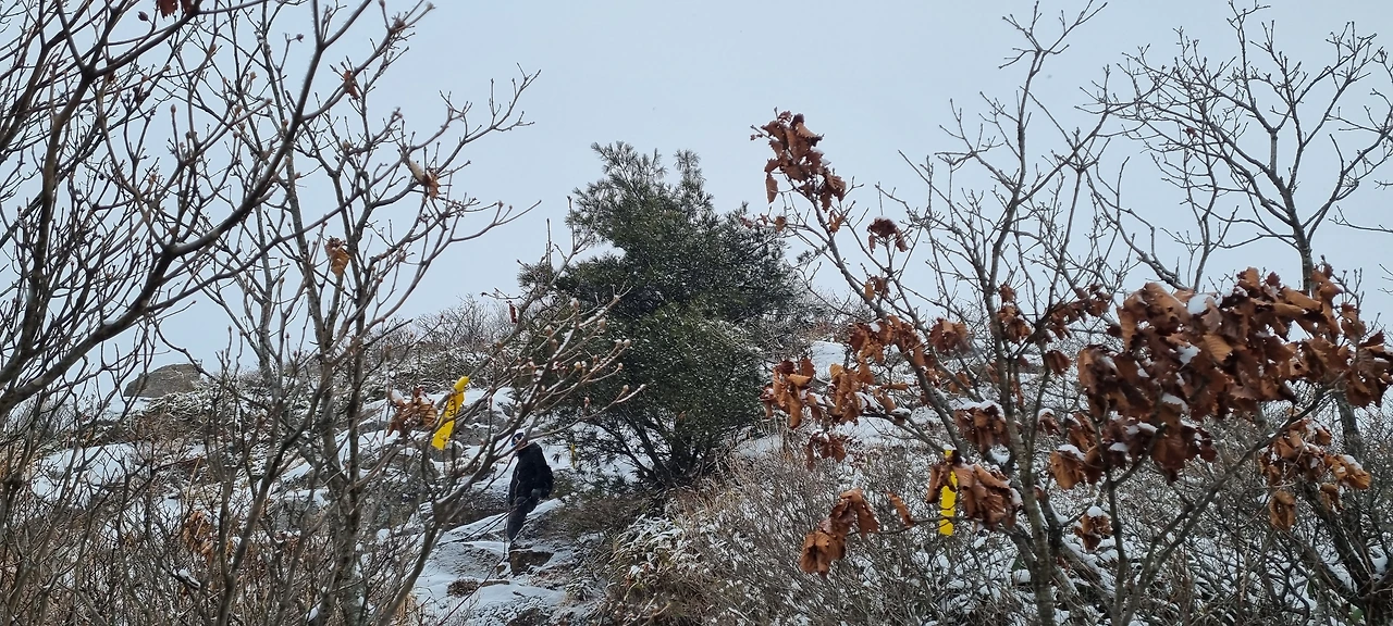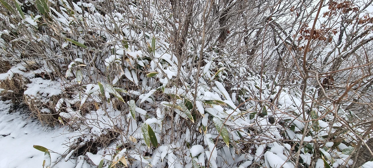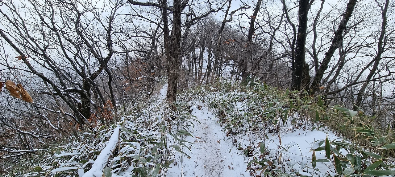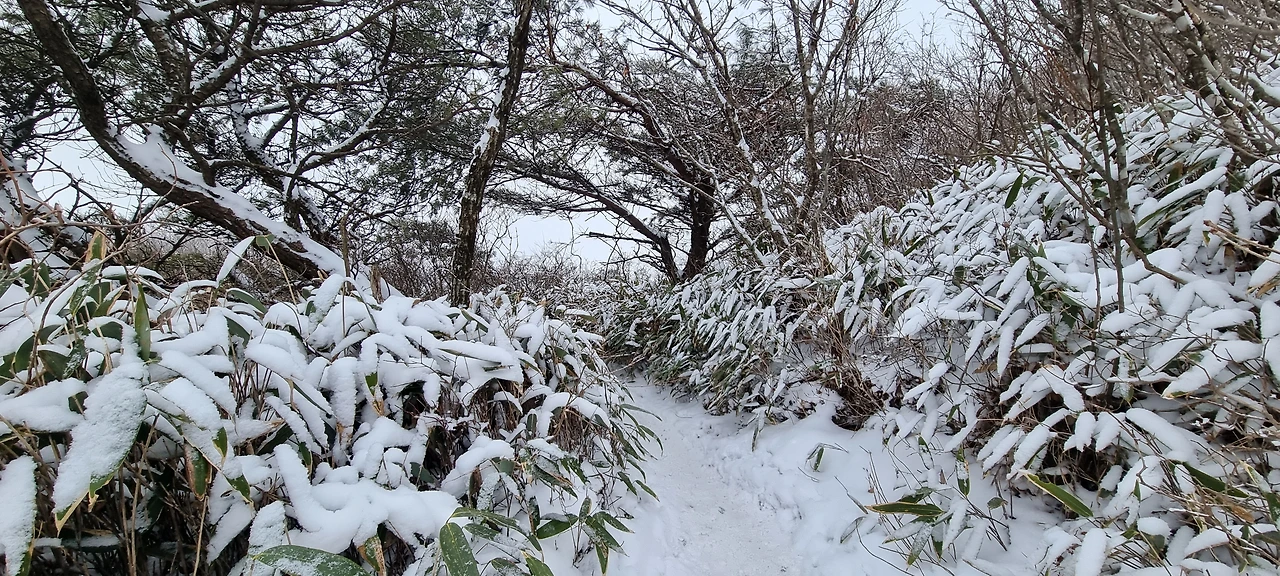 눈이 내린다. 눈 구름이 가까이 있었는데 벌써 도착했다. 앞에 있는 사람 배낭에 눈이 내리고 있다. 내 배낭에도 눈이 있겠지만 그냥 걸을 뿐이다. 비가 왔다면 벌써 준비를 하였을 것인데 눈은 맞고 간다. 눈사람이 될 것인지 아닌지는 모르겠지만 그래도 열심히 걸을 뿐이다. 나도 열심히 걷는다고 걷는데 건각들이 다가오더니 지나간다. 산죽에 눈이 쌓여만 간다. 그 모습을 담는다.