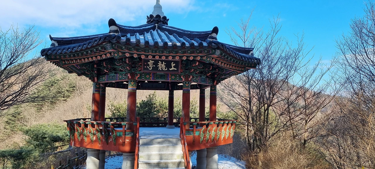 계곡에 폭포가 있으면 길은 가파르게 내려가고 올라가지만 이곳은 예외다. 동행이 말하기를 걷는 길 따로 물길 따로라고 하였다. 중간중간에 얼음이 있다. 계곡을 가로지르는 길에 물이 살짝 흐르면서 그 물이 얼음길을 만들어 놓았다. 눈이 살짝 와서 그 얼음이 보이지 않아 위험하지만 어려움 없이 옆으로 옆으로 이동하면서 걷는다. 4km를 그렇게 걸으면 황룡사라는 사찰이 보이고 지나가는 구름다리가 있다. 구름다리 위에서 계곡을 보지만 얼음만 있다. 이제는 끝이다. 주차장에 있는 화장실에서 뒷정리를 하고 이제 집으로 간다.