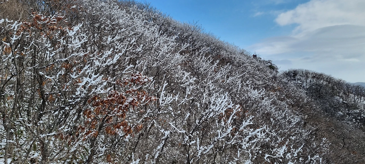 이제는 능선을 따라 오르고 내려가고 오르고 내려가고 오르면 민주지산의 정상이다. 그리고 한 번쯤을 뒤돌아본다. 각호산에서 민주지산으로 가는 능선에서 맨 처음 만나는 능선은 내려간다. 이렇게 내려가면 또 올라갈 것인데 걱정을 하면서 내려간다. 그렇게 내려갔다가 올라가면 힘든 것이 사실이기 때문이다. 그러만큼 내려간다. 그리고 오르고 내려가고 오르고 내려간다. 여름날 이곳을 지날 때는 야생화가 힘든 것을 위로하였는데 오늘은 찬바람이 친구가 되었고 북서풍이 휘몰아치고 있다. 멀리 있던 민주지산 정상이 가까워지고 있다. 그리고 가까이 있던 각호산 정상이 멀어져 간다. 그리고 갑자기 가까워지던 민주지산 정상이 숨는다. 이제 눈구름이 가까워지고 있다. 민주지산 정상이나 석기봉 정상에서 눈을 만날 것 같다. 그래도 정상에 구름이 그렇게 많지는 않다. 정상에 도착하여 석기봉 정상이 보이는 것을 보고 그것을 담는다. 바로 아래에 있는 설경을 담는다. 상고대 햇빛을 받아 반짝거리고 있다. 도마령에서 2시간 30분에 도착하였다.