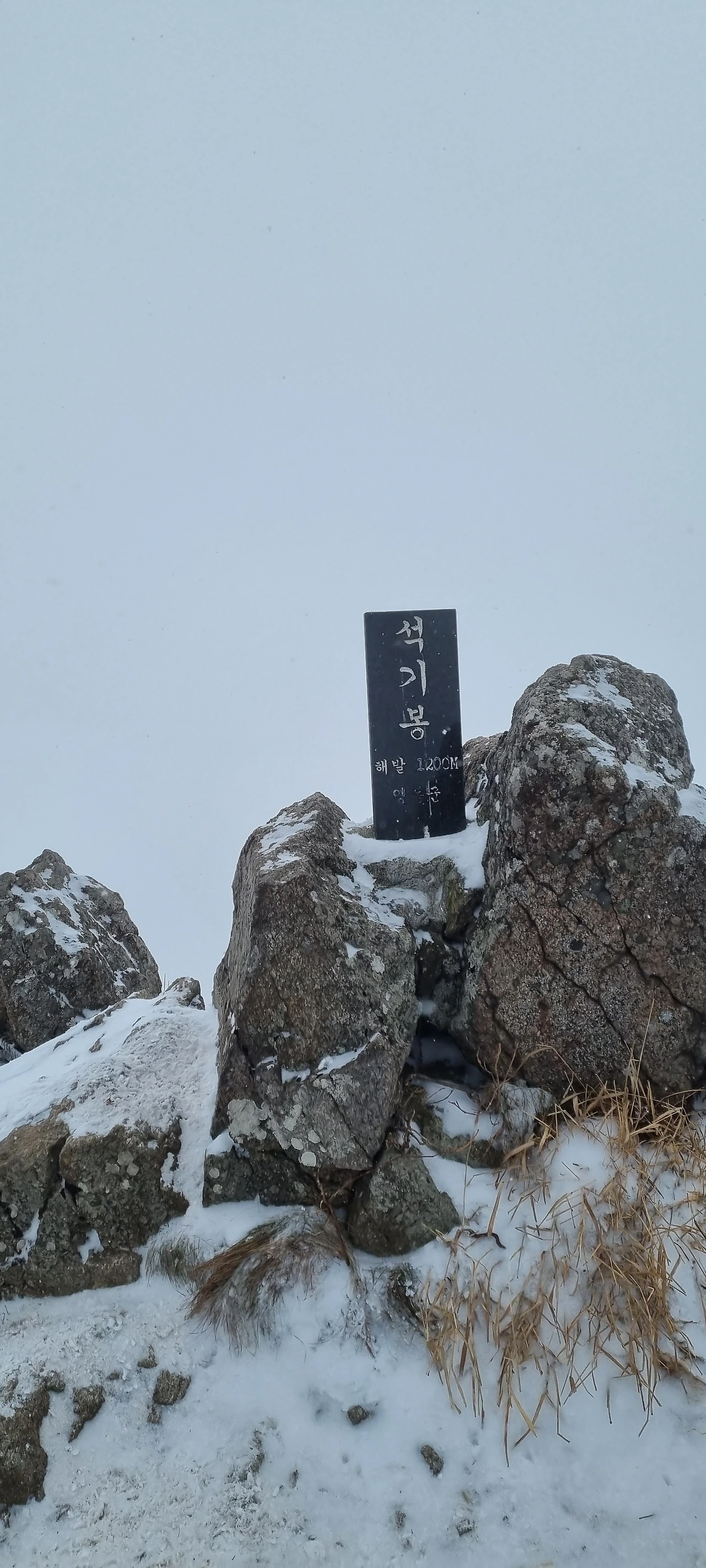 석기봉을 앞에 두고 고민에 빠진다. 바로 올라가는 길이 있고 우회하는 구간이 있다. 여름철이면 바로 올라가겠지만 겨울인 만큼 안전을 최우선으로 삼고 우회를 한다. 그런데 우회하는 길이 더 힘든 것 같다. 그렇게 내려가고 올라가다가 석기봉을 올라가는 길과 삼도봉을 바로 가는 길이 삼거리에서 석기봉을 가지 않고 바로 삼도봉으로 가는 사람도 있다. 바로 앞에 정상이 있는데 이를 지나친다는 것은 재미가 없다. 100m도 안 되는 거리인데 이를 지나친다는 것은 말이 안 된다. 오른다. 바람이 들이치고 있다. 눈이 오고 있다. 조망은 없다. 눈구름 때문에 아무것도 보이지 않는다.