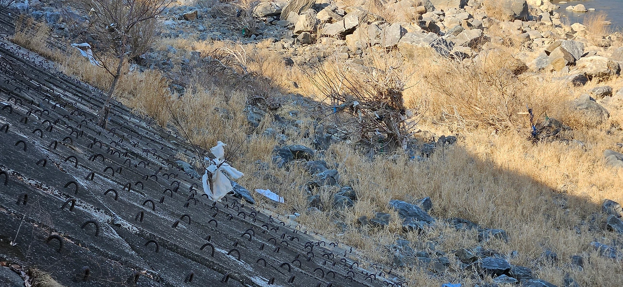 팔당댐을 만나기까지 3km를 어렵게 어렵게 걸었다. 팔당댐은 자동차만 건널 수 있다는 이정표를 보고 아쉬워한다. 우리는 여기서 건너면 팔당역으로 건너보리라고 하였는데 그것이 안되었다. 이제부터는 위례사랑길이라는 둘레길을 걷는 것이다. 하남시에서 만든 둘레길을 걸어본다. 어떤 곳은 도로 옆을 지나가고 어떤 곳은 강둑밑으로 걷는다. 그리고 한강을 바라다본다. 한강을 걸으면서 홍수에 쓸려온 비닐이 걸려서 허수아비를 만든 모습을 본다. 배알미동으로 들어간 둘레길은 갑자기 어디로 가야 할지 모르게 좁을 길을 따라 아래로 내려간다. 수자원공사 담장 밑으로 길이 만들어져 있다. 그 담장에 담쟁이덩굴이 생명을 이어가고 있다.