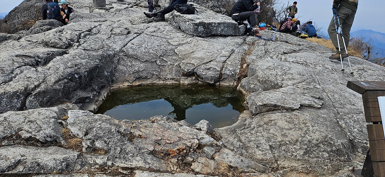 그리고 우두정을 배경으로 사진을 담는다. 우두봉 정상의 우두정에 이 가뭄에도 물이 있다. 일주일 전에 비가 온후 그 비가 아직 마르지 않았다는 것이다. 이제 내려간다. 해인사가 보인다. 멀리서 담고 이제 하산을 한다. 가파르게 내려간다. 서성제에서 만물상 능선이 아닌 백운동계곡으로 내려간다. 하산코스다. 백운사지가 있고 가야산성 흔적이 있다.