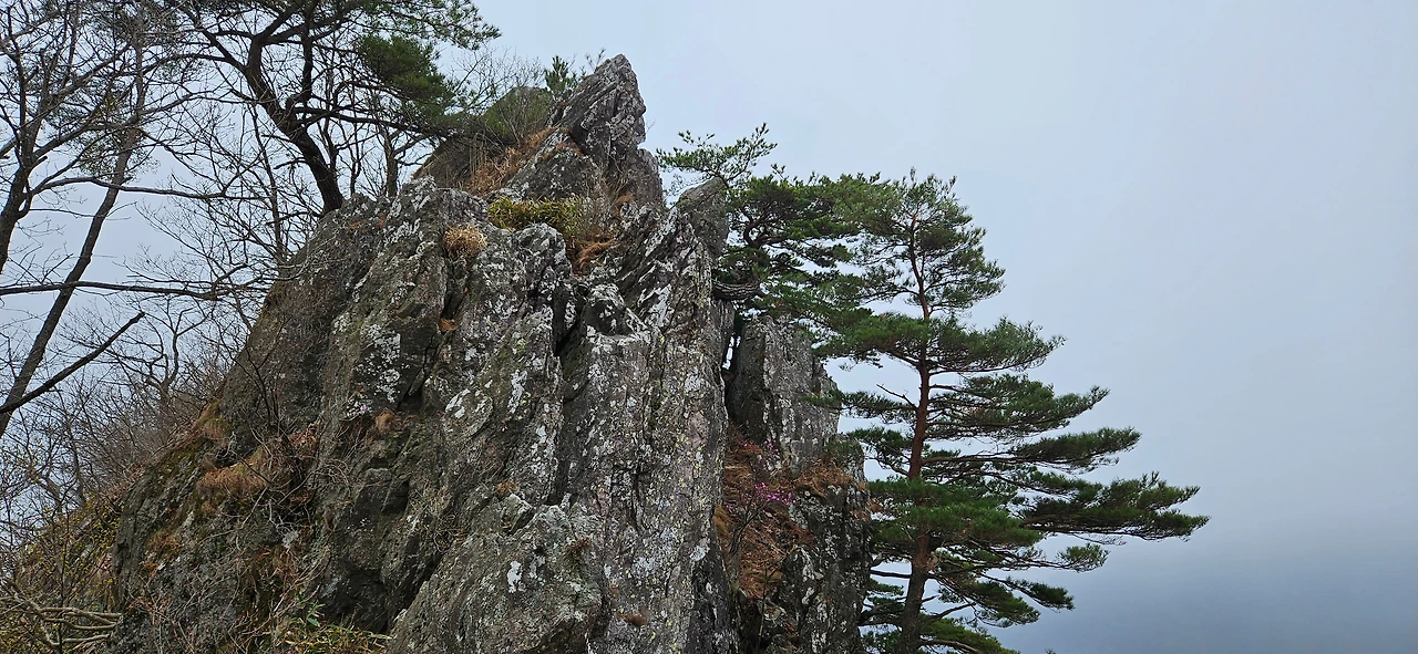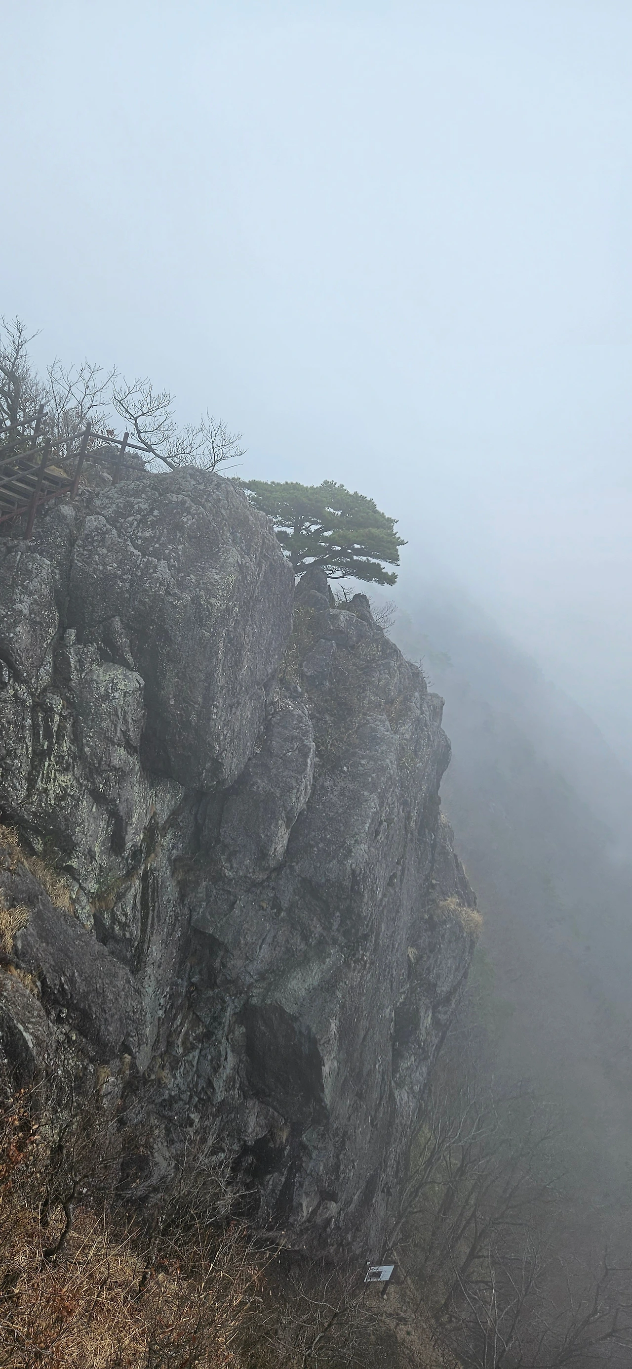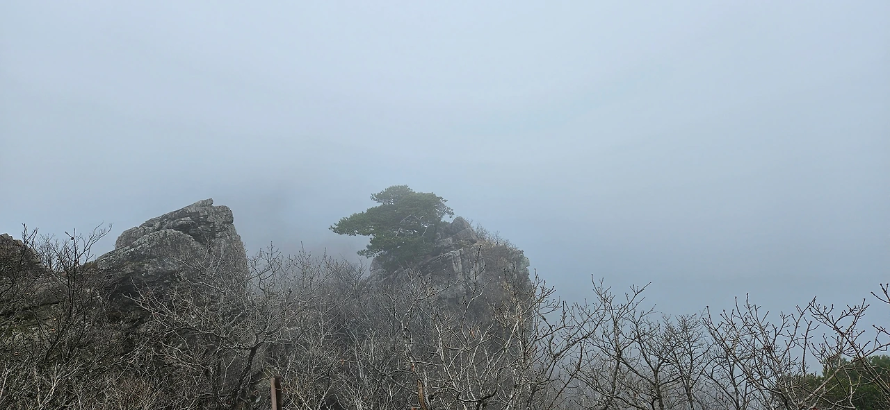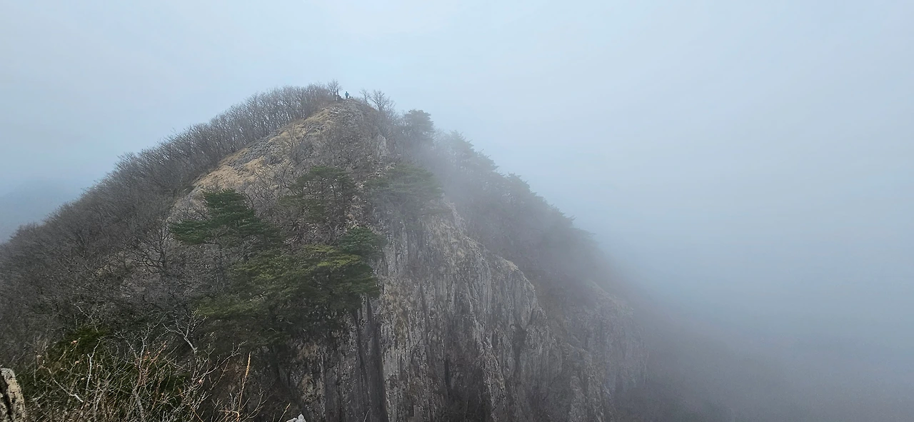 이제 불출봉이다. 서래삼거리에서 능선을 오르면 너무 멋진 등산로이다. 푹신한 낙엽이 썩어서 등산로를 만들어서 걷는 자체가 좋다. 한 순간 내려섰다가 올라가는 구간에서부터 힘든 구간이 시작된다. 암릉의 연속이다. 멋진 풍광이 있을 것인데 우리는 구름 속으로 들어왔다. 구름 속에서 암릉이 모습을 드러내었다가 숨었다가 한다. 불충봉을 오르는 계단이 신비스럽게 모습을 드러내고 있다. 지인들을 다 앞세우고 뒤에서 담아본다. 그 모습도 괜찮다. 불충봉까지 와서 내려가는 사람들이 많다. 그 이유는 망해봉, 연지봉, 까치봉까지 가는 거리가 1시간 이상 소요되고 그 사이에는 탈출할 수 있는 길이 없기 때문이다.