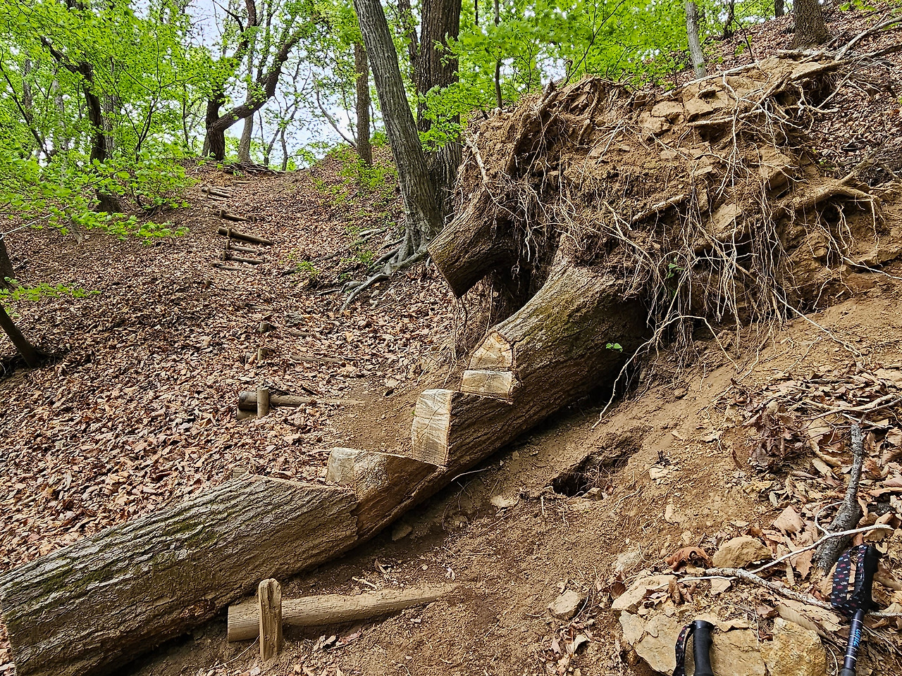 나는 오늘 친구들과 함께 내려온 길을 추억으로 삼고 이 길을 거슬려 올라가는 것이다. 절골고개로 가는 길을 만났다. 오른다. 그런데 이 길을 내려올 때는 몰랐는데 이 길이 이렇게 험악하게 생겼다는 것을 알게 되었다. 절골고개 마루를 바로 앞에 두고 너무나 가파르다. 하지만, 쓰러진 나무를 재미있게 정리한 것으로 보고 그것을 사진으로 담았다. 쓰러진 나무를 기계톱으로 잘라서 없애버리는 것이 다반사이지만, 이곳은 그것을 그대로 둔 상태에서 사람들이 지나갈 수 있도록 만들어 놓았다.