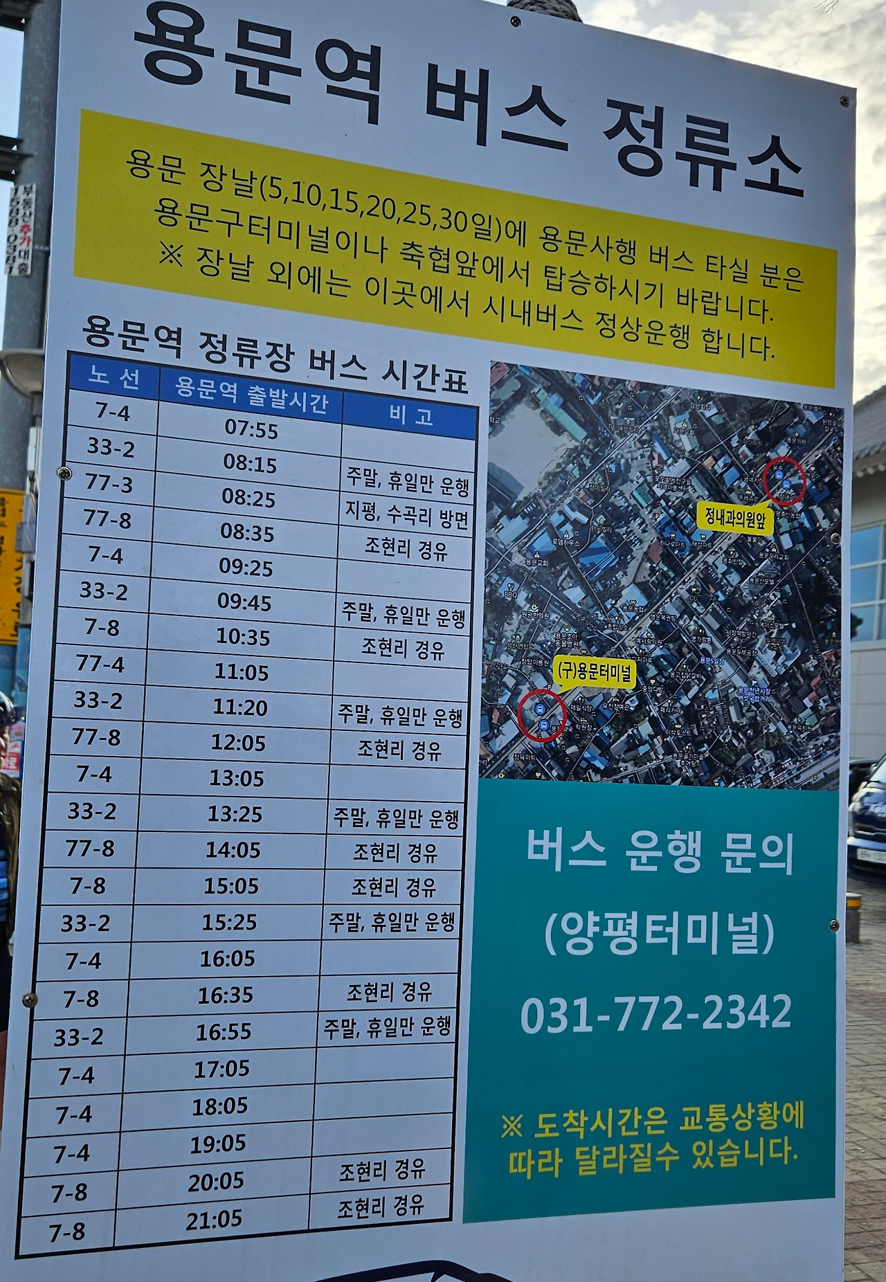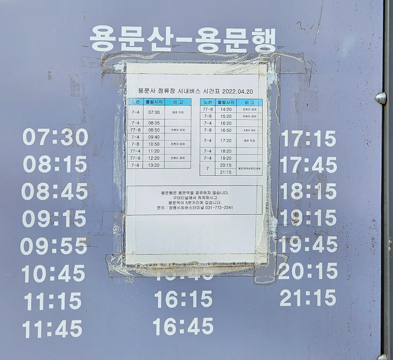 용문사로 가는 버스는 용문역 1번 출구로 나오면 시내버스 정류장이 있다. 이 정류장에 보면 용문장날을 제외하고 이곳에서 탑승할 수 있다고 안내되어 있다. 용문장날(5일, 10일 15일, 20일, 25일, 30일)은 이곳에 장터가 되어서 이곳으로 버스가 들어오지 않고 용문사로 가려면 용문축협 앞에 가서 탑승하여야 한다. 첫 버스가 7시 55분이다. 같은 기차를 타고 온 할머니들이 버스를 기다리고 있다. 용문사에서 오늘 무슨 제를 연다고 한다. 그 제에 참석하기 위하여 서울에서 왔다고 한다. 용문사로 가는 버스는 7시 55분, 8시 15분(주말과 휴일만 운행), 8시 35분, 9시 25분, 9시 45분(주말과 휴일만 운행) 등으로 안내되어 있다.
