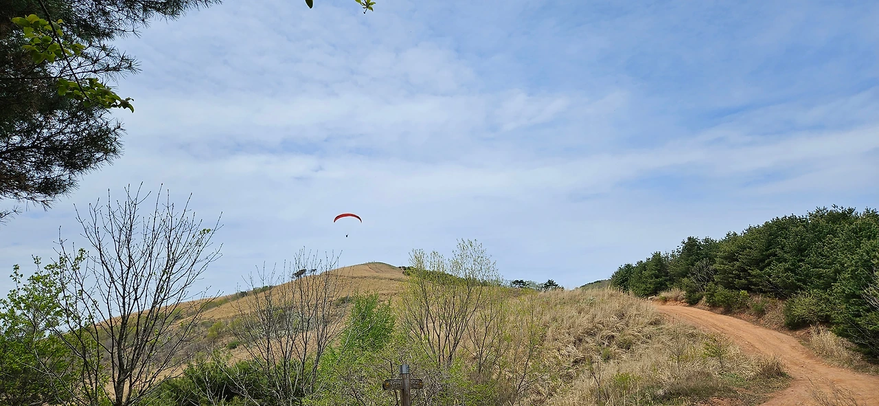 ATV체험장 입구에는 등산객과 ATV가 부딪히지 않도록 등산로는 능선을 따라 걷도록 되어 있다. 어느 정도 걸으면 길이 합쳐지지만 그것도 한 재미다. 길을 걸으면서 등산로가 어느 것인지 모르겠지만 ATV가 다닌 길을 계속 걷다 보면 끝이 보인다. 그 끝을 따라 걷다 보면 잣나무 숲길이 나타난다. 그 길에서 시원한 음을 맛본다. 걷다 보면 ATV길이 아닌 등산로를 알려주는 표지기가 달려있다. 그 길을 따라가면 된다. 패러글라이딩 활공장을 바로 앞에 두고 등산로를 알려주는 표지기가 있으나 활공장을 올라본다. 그리고 그 활공장에 올라 활공하는 패러글라이딩을 쳐다본다. 그리고 멀리 용문산을 담아본다. 앞에 아무것도 없이 활공장에서 내려다본다. 멀리 양평시내도 보인다.