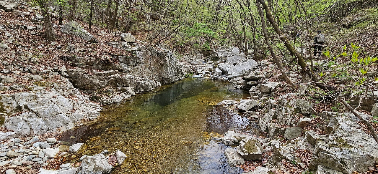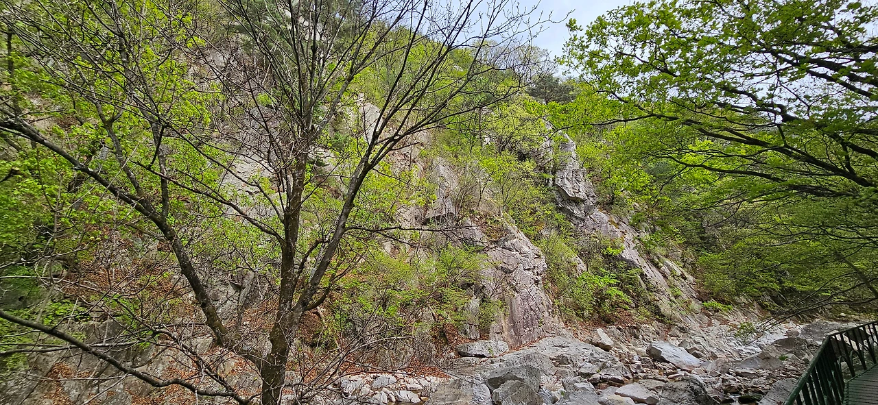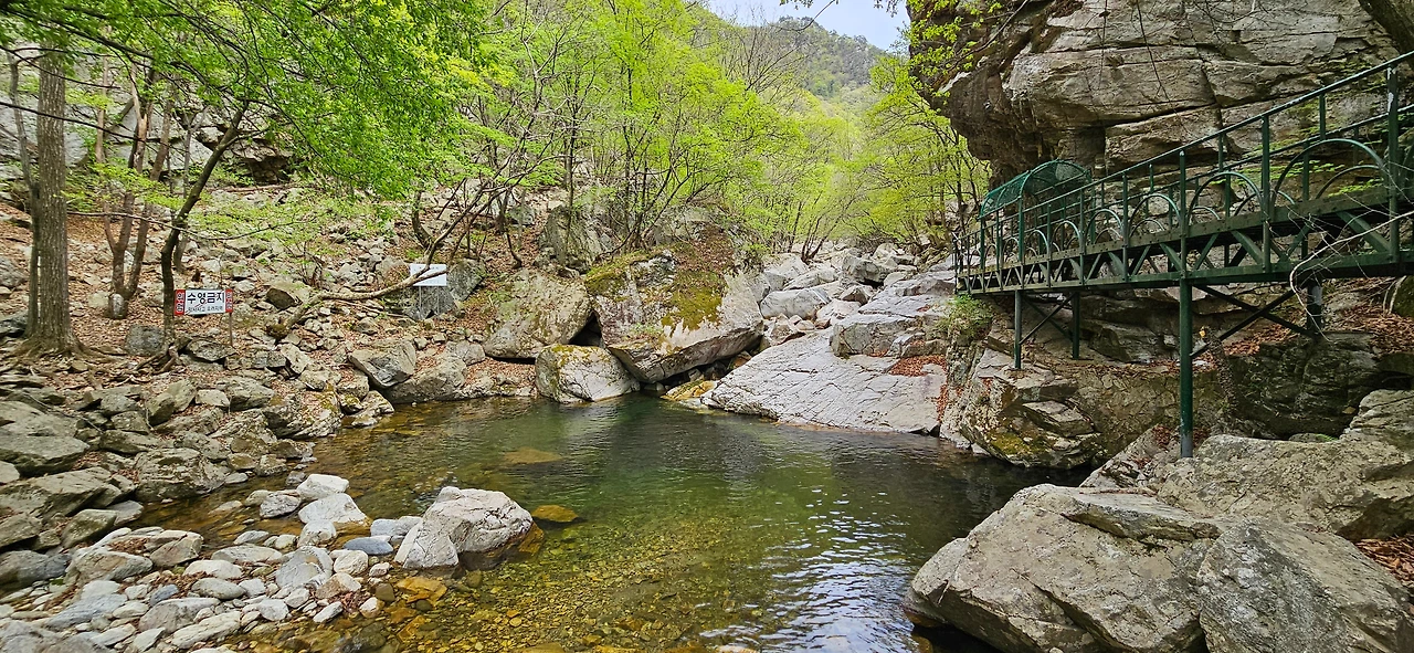 계곡 중간중간에 소가 있다. 마당소가 있고 용소가 있고 박쥐소가 있다. 박쥐소 근처에서는 산을 다시 오를 수가 있다. 소마다 물놀이 금지라는 표시가 되어 있다. 그렇게 깊은 곳에 누가 들어가서 물놀이를 하겠나 하겠지만 그래도 깊은 물속은 깊게만 보인다. 등산객들이 개울에 앉아서 발을 담그고 있다. 개울에 발을 담그지 않고 세수하고 머리를 감고 내려간다.