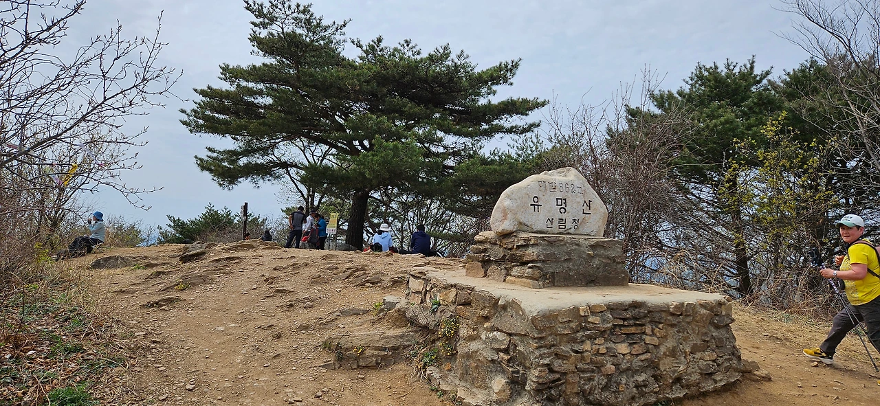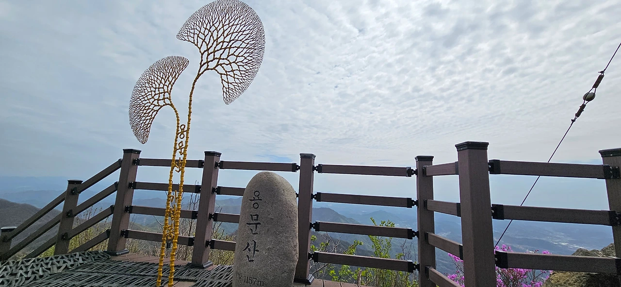 용문산 정상인 가섭봉을 오른다. 가섭봉이 용문산 정상이다. 예전에는 군부대가 장악하고 있어 가섭봉을 오를 수 없었지만 이제는 문제가 없다. 정상을 개방을 하고 있기 때문이다. 가섭봉 정상석 옆에는 용문산의 상징적인 은행잎이 있다. 은행잎이 있고 그것을 배경으로 정상석을 담는다. 그리고 아래로 내려다본다. 연초록이 있고 정상은 아무것도 없다. 아직 정상은 초봄이다. 정상을 올라오기 전에는 철쭉이 피어 있으나 900m 이상을 올라오니 진달래가 만발하다. 옛날 정상석이 있던 위치에 이제는 시멘트 받침만이 남아 있다.