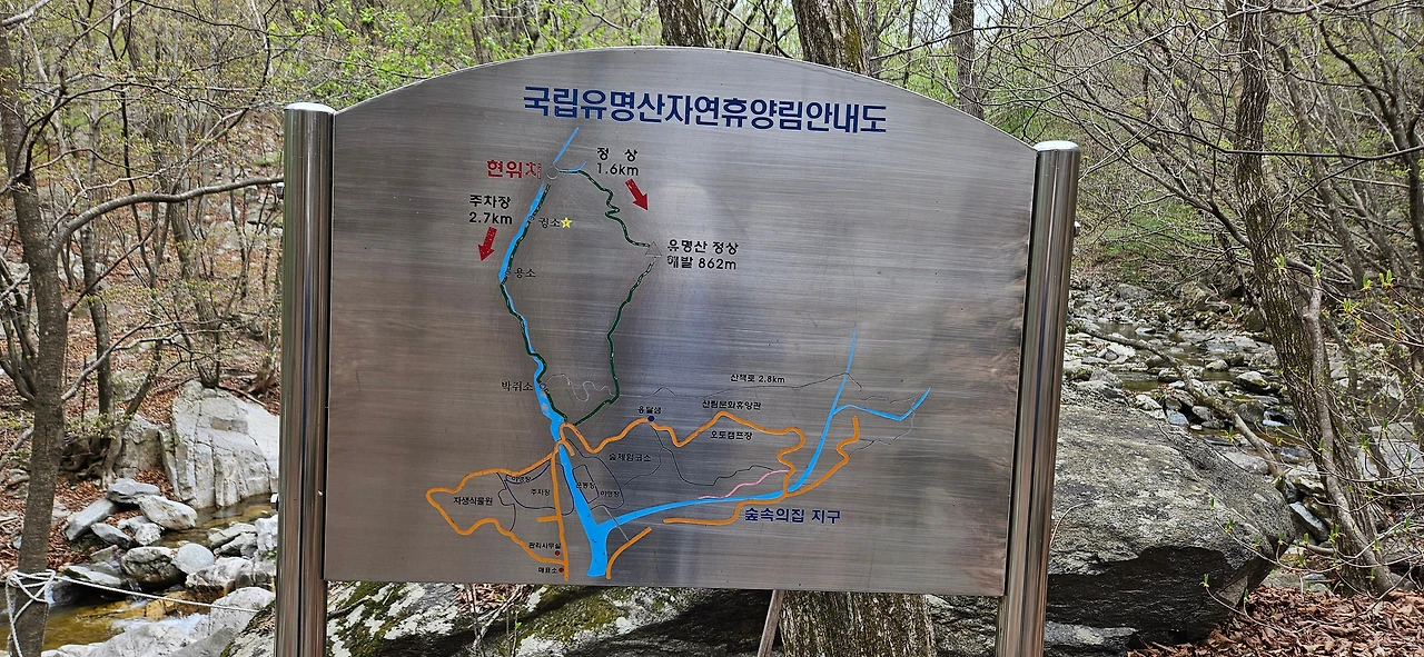 한강기맥을 알리는 이정표가 있고 유명산 정상을 알리는 이정표는 300m 남았다고 안내되어 있다. 유명산 정상은 한강기맥에서 300m 정도 떨어져 있다. 오르막을 오르는 것이 아니다. 유명산 자연휴양림에서 올라온 등산객들이 유명산 정상을 점령하고 있다. 그곳에서 바라보는 경치는 좋다. 하산하는 코스는 2코스다 바로 유명산 자연휴양림으로 바로 내려가는 코스로 2km 정도다. 계곡을 거쳐서 내려가는 길이 있다. 많은 사람들이 계곡으로 내려가는 길을 선택한다. 이 길이 4km가 넘어도 계곡을 즐기면서 갈 수 있기 때문이다. 그리고 가파름이 덜하다고 할 수 있다.