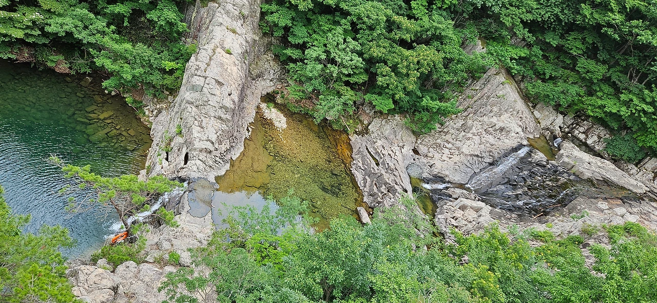제백이제에서 직소폭포까지 왕복거리가 3km 정도 되는데 너무 좋은 길이다. 그 길은 그렇게 걸어도 좋다고 본다. 혹! 누군가가 직소폭포를 올라와서 걸어본다면 제백이 다리까지 걸어보는 것을 권고하고 싶다. 숲 속의 산책길을 걷는다고 보면 될 것이다. 힘들면 개울옆에 있는 바위 위에 앉아서 피라미가 노는 모습을 볼 수도 있고 깨끗한 물이 흐르는 곳에 손을 담글 수도 있다고 보면 된다. 우리는 개울옆에 넓은 바위에 앉아서 점심을 알리는 알람을 Off 시켰다.