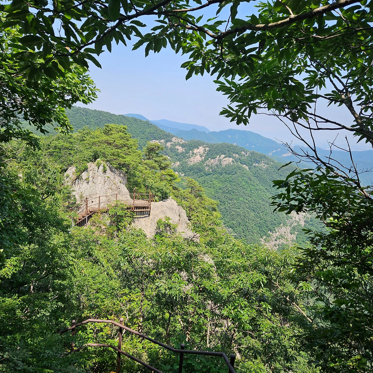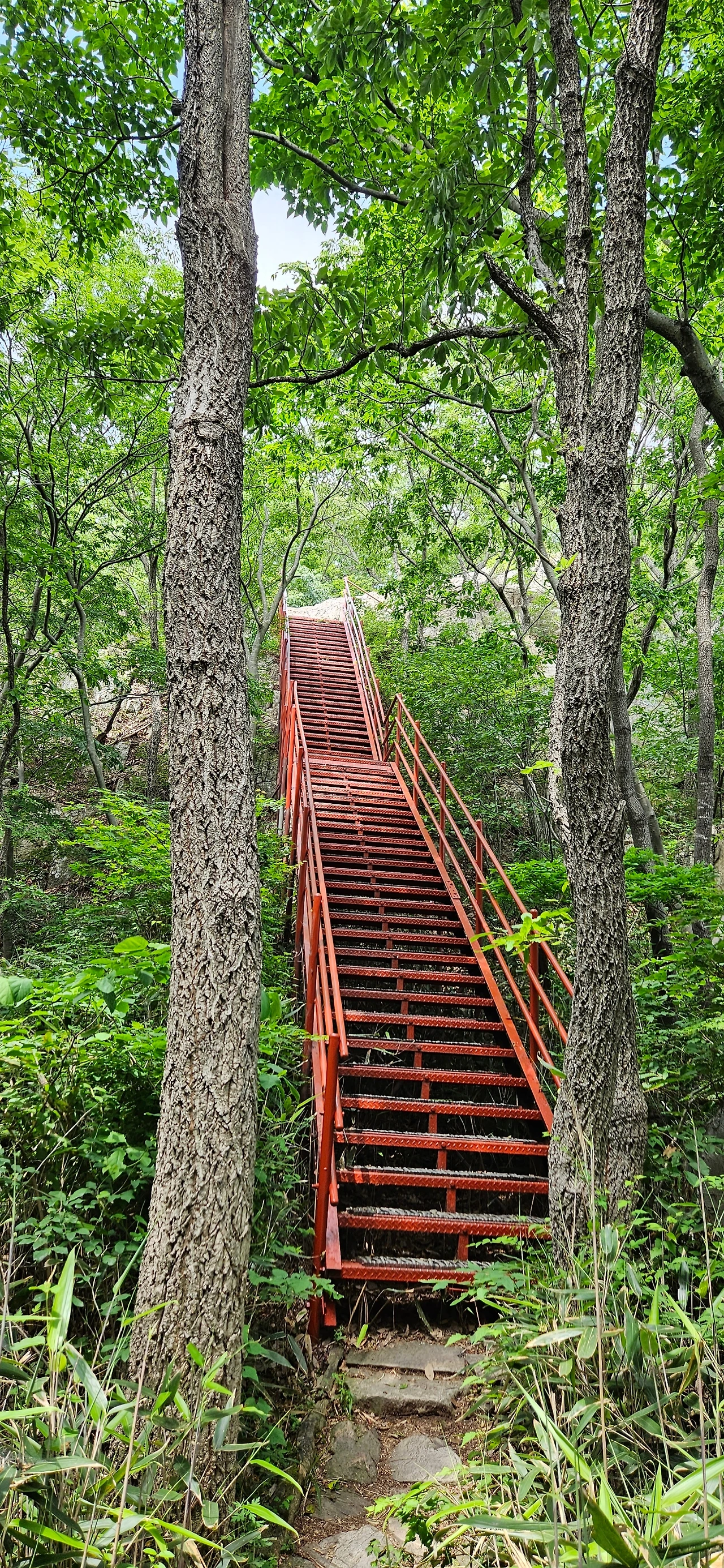관음봉삼거리에 도착하니 재백이제를 거쳐서 올라오는 산객들이 있다. 여기에서 직소폭포까지 얼마가 걸리는지 물어보니 갸우뚱한다. 왜 여기에서 직소폭포를 가는 것인지 모르겠다는 표정이다. 원암에서 출발하여 제백이제로 가던지 내소사 오른쪽에 있는 등산로를 이용하여 관음봉을 오른 후 관음봉 삼거리에서 제백이제로 간 후 직소폭포를 보고 다시 제백이제로 이동한 후 원암으로 하산을 하면 힘이 덜 들것인데 어렵게 산행한다고 생각하는 것 같다. 결론적으로 그것이 맞는 것 같다. 하지만, 이미 시작한 것을 어떡하나 그대로 제백이제로 내려간다. 내려가는 길이 가파르다. 다시 이 길을 올라와야 한다는 것이 부담스러운지 지인이 한숨을 쉰다. 이 길을 다시 올라와야 한다고 하면서 어려움을 사전에 알리고 있다. 그래도 내려간다. 그리고 마당바위가 있는 봉우리를 오르기 전 뒤를 돌아보니 관음봉의 모습이 멋있다. 그리고 마당바위를 오르는 붉은색 철계단이 우리 앞에 장애물처럼 드러난다. 그래도 그 모습이 이채로워 담는다.