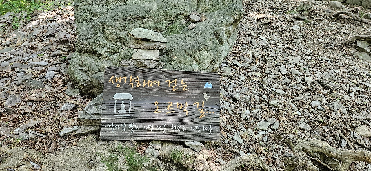 비자나무 숲 속을 들어가는 등산로를 따라 걸어간다. 운문암까지 자동차가 올라가는 만큼 약사암으로 올라가는 갈림길 즉, 등산로로 들어서는 갈림길에 들어서기 전까지 도로를 따라 걷는다고 보아야 할 것이다. 예전에 내가 그렇게 힘들게 내려온 구간 입구에 도착하였다. 그때도 이랬는지 모르겠지만 약사암으로 가는 길이라고 한다. 약사암을 오르는 길이 지그재그 갈지로 등산로 있다. 우리 뒤에 따라오는 등산객이 있다. 혹! 이 길을 모를 수 있어 이 길이 가파르다고 이야기하였지만 따라온다. 약사암을 가는 길에 이 길이 힘들다는 것을 보여주는 문구가 있다. "생각하며 걷는 오르막길 - 약사암 빨리 가면 30분 천천히 가면 10분" 그렇게 빠르게 올라가도 30분이 소요되고 이 생각 저 생각을 하면서 천천히 오르면 10분 같다는 얘기다.