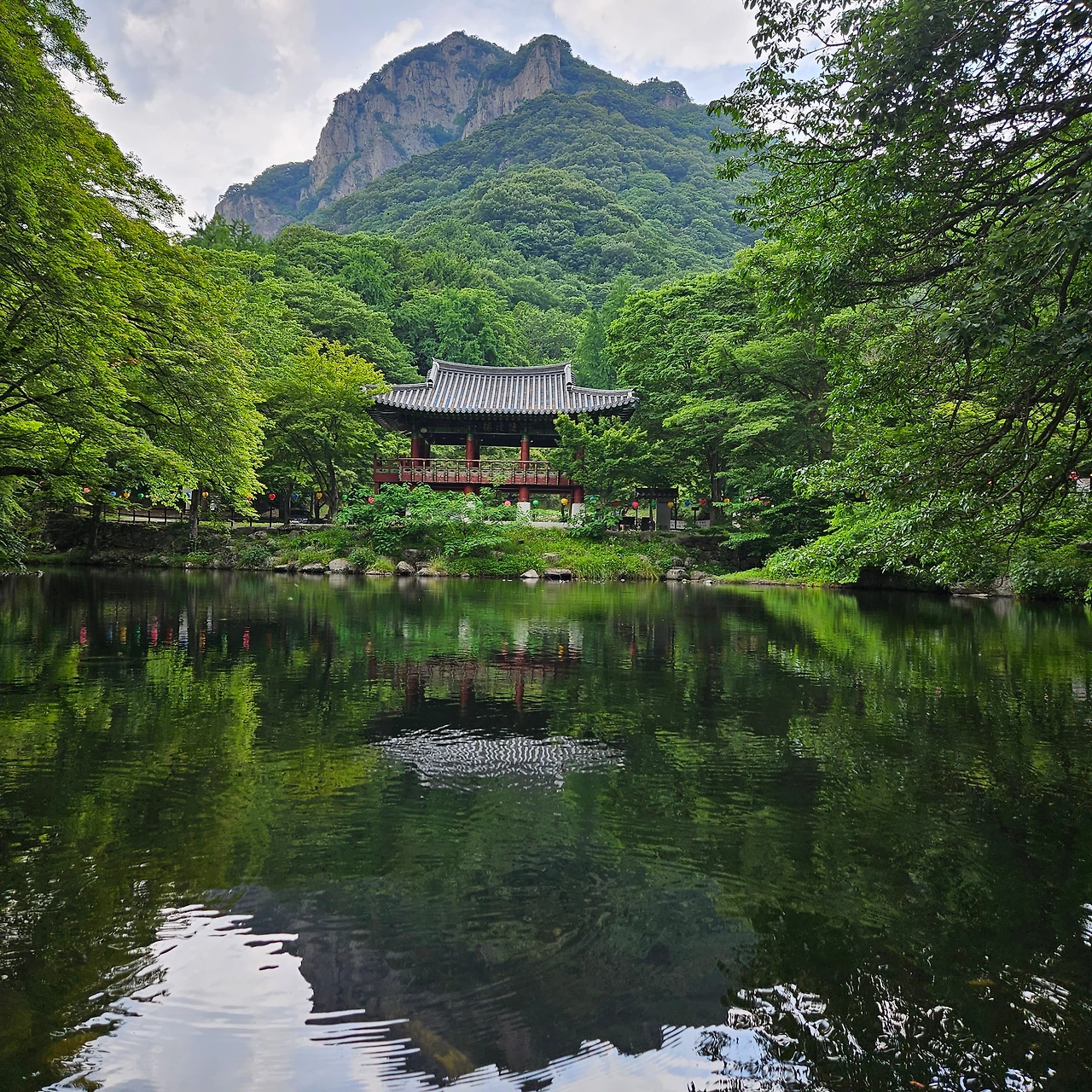 길을 지나면서 예전에는 주차장으로 사용되었을 공간에서 백학봉을 보고 그대로 담는다. 하지만, 그것보다는 쌍계루 바로 전에 있는 연못에서 쌍계루와 백학봉을 동시에 담는 것이 더 아름다웠다. 아침에는 그것이 보이지 않지만 오후가 되면 백학봉이 쌍계루 바로 앞의 연못에 쌍계루와 함께 얼굴을 담그고 있다.
