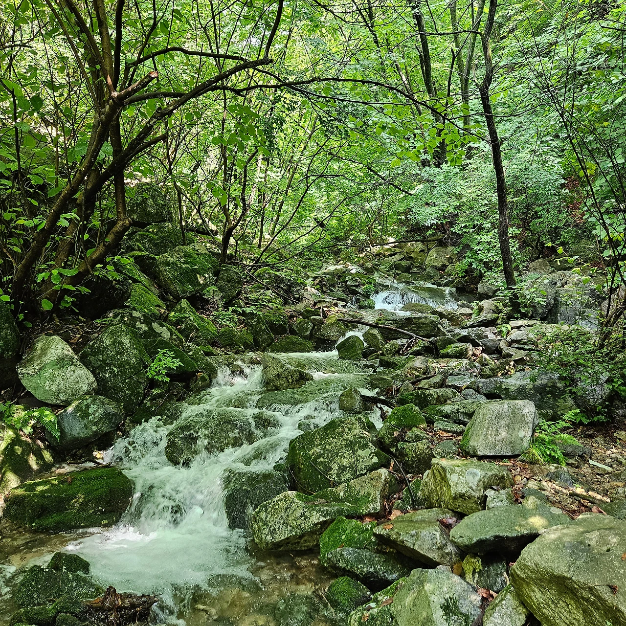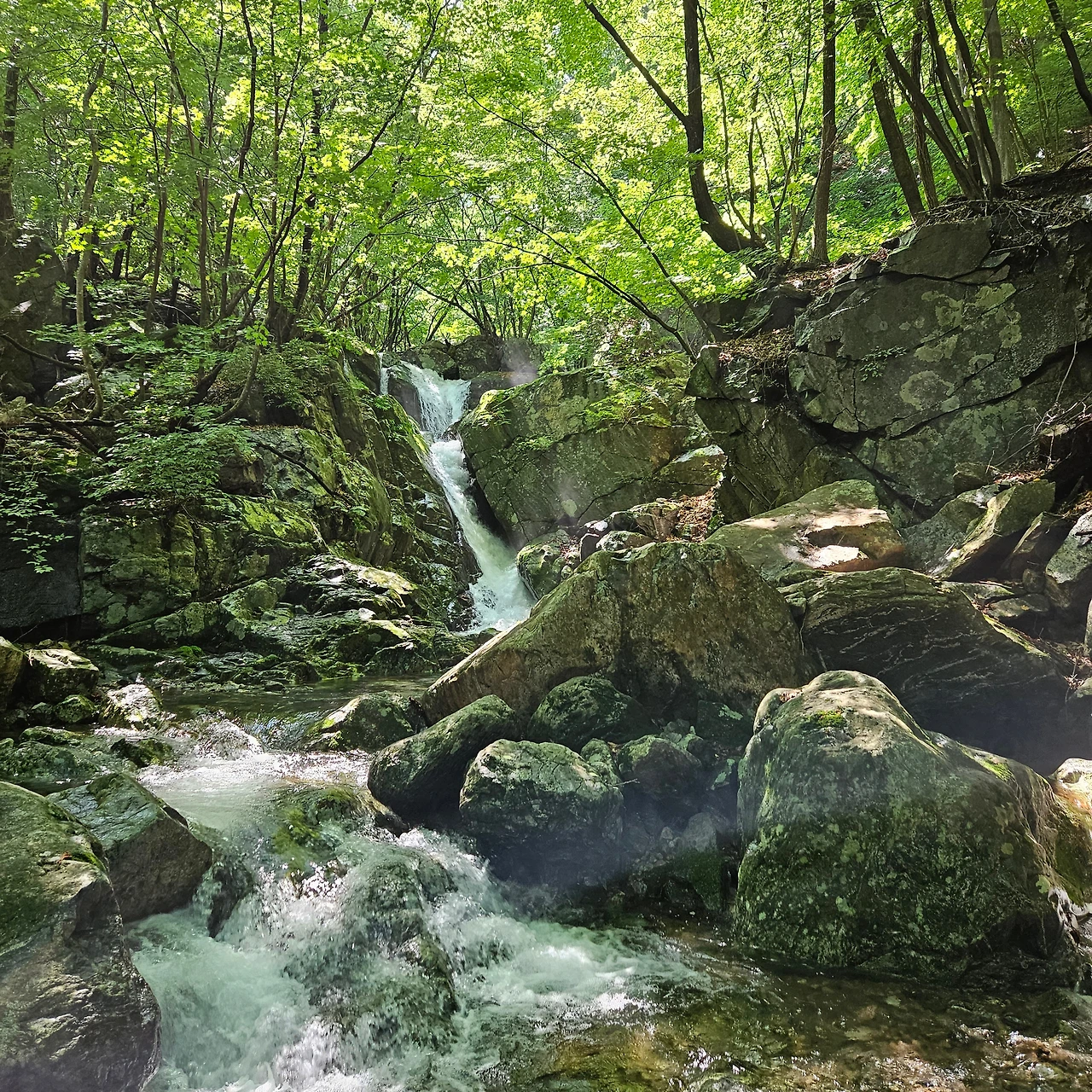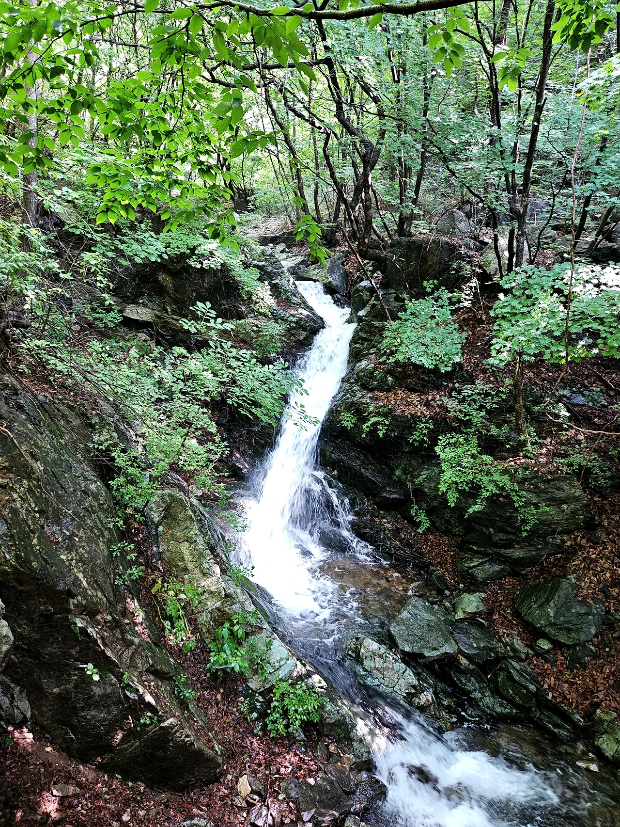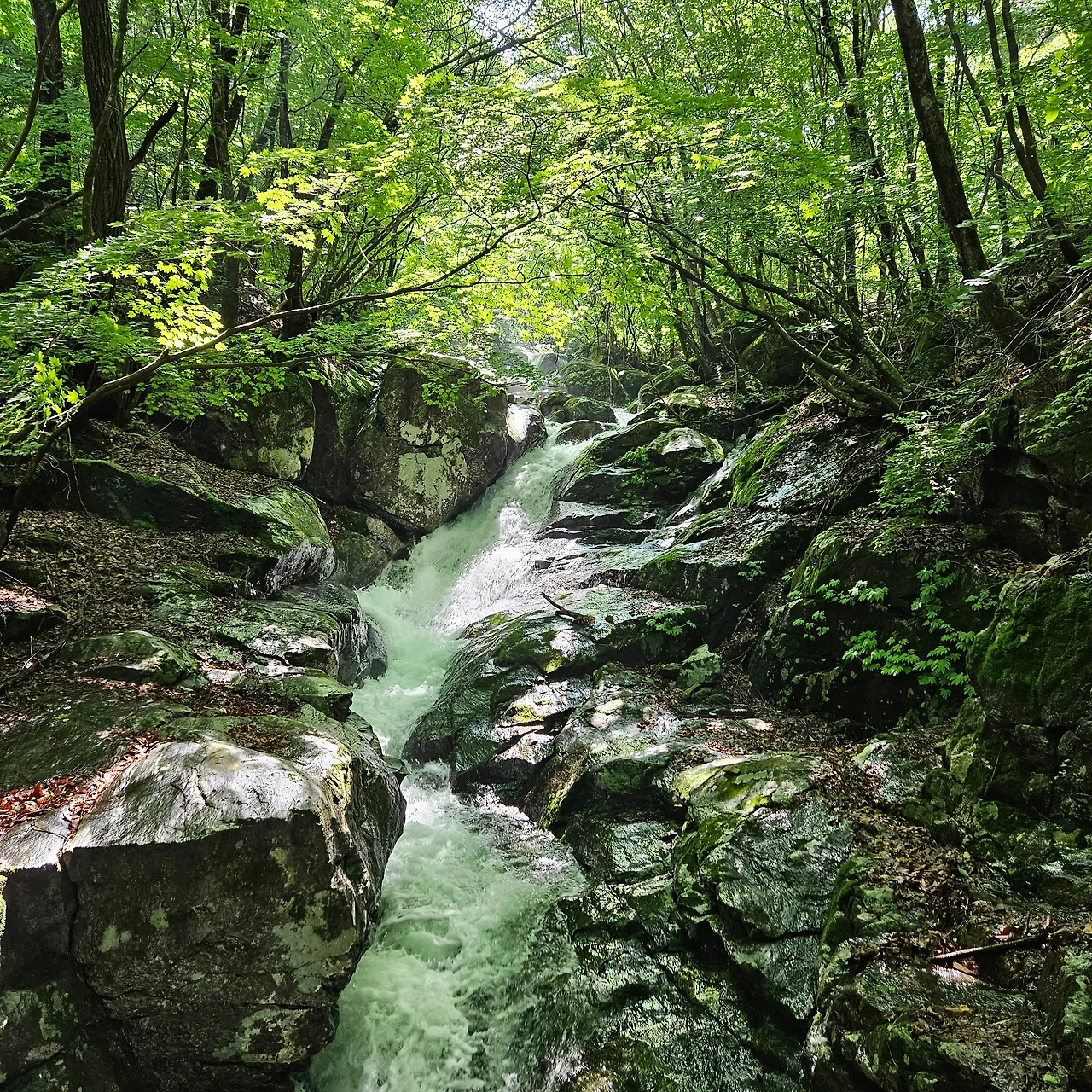 계곡에 물이 넘친다. 며칠 전 내린 비가 넘쳐서 등산로를 덮고 있는 경우도 있지만, 계곡에 폭포를 만들고 있다. 그 계곡물에 손을 담그고 휴식을 취하기도 하면서 올라간다. 중간중간에 앉아 휴식하면서 그 정경을 담는다. 계곡을 넘는데 물이 넘쳐서 징검다리가 있는 곳을 찾아 넘는다. 예전에 이웃한 용추계곡은 징검다리가 없어서 등산화를 벗고 넘었는데 이곳은 그래도 징검다리가 있어서 쉽게 넘어간다.