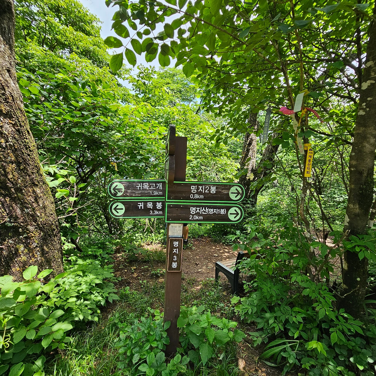 이곳의 이정표상 거리는 제 맘대로 다. 똑같은 곳에 세워져 있는데 다르다. 이제 여기에서 에너지를 충천하고 명지봉으로 방향을 잡고 오른다. 안부의 길이 좋다고 H가 사진으로 담는다. 방화선을 구축하기 위하여 고갯마루를 정리하여 놓은 결과다. 그 길이 또 평탄하다. 이제 명지 3봉까지는 즐기차게 오른다.