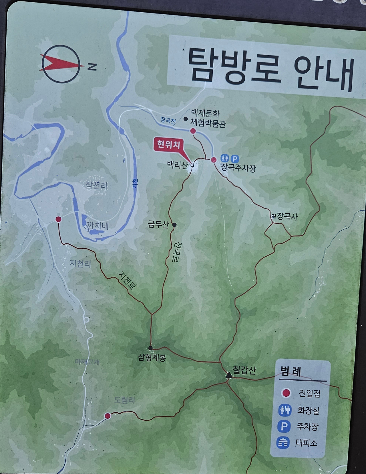 등산로는 도립공원을 안내하면서 이곳을 장곡로라고 하였다. 등산로 이름을 재미나게 명명해 놓았다. 칠갑로, 산장로, 사찰로, 휴양로, 지천로, 천장로, 도림로 등이다. 장곡로에는 백리산이 있고 금두산이 있다. 왜 이렇게 이름을 붙여놓았는지 모르겠다. 등산로는 도림공원이라서 그런지 등산로는 관리가 잘되고 있으며, 등산로를 따라 데크가 있고 의자가 있고 쉼터가 있다.