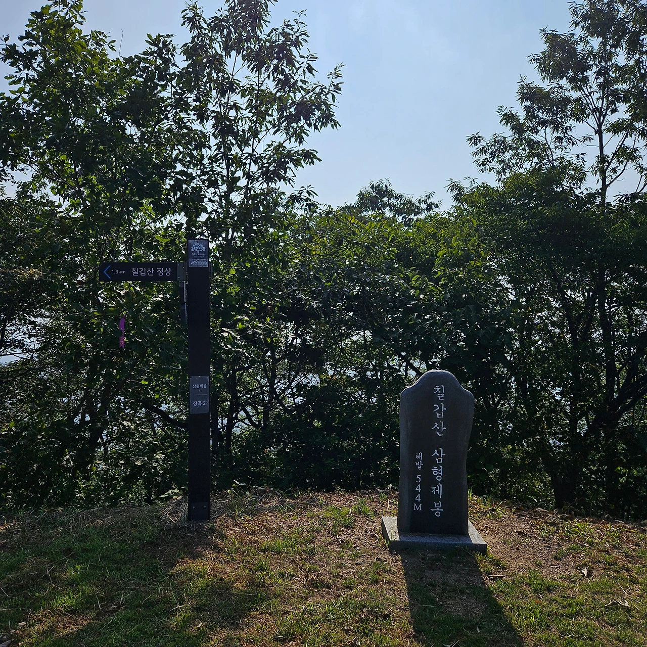 산을 오르다가 갑자기 정상이 열린다. 그리고 헬기장이 있다. 그곳이 칠갑산 삼형제봉이다. 강원도에도 삼형제봉이 있고 이곳에도 삼형제봉이 있다. 이곳이 삼거리다. 지천로와 장곡로가 만나고 칠갑산 정상으로 가는 길이 있다. 칠갑산 정상까지 1.3km다 그렇게 멀게 느끼지만 능선길을 따라 조금 내려갔다가 올라가는 것이다. 정상에서 삼형제봉 쪽으로 가다 희미한 오솔길로 꺾어져 비탈을 따라 내려가면 아흔아홉 골이 나온다고 한다. 지역 사람들은 ‘아니골’로 부르며, 태고를 간직한 듯한 울창한 숲을 만날 수 있다고 한다. 여기서 흔적을 찾아볼 수 없었다.