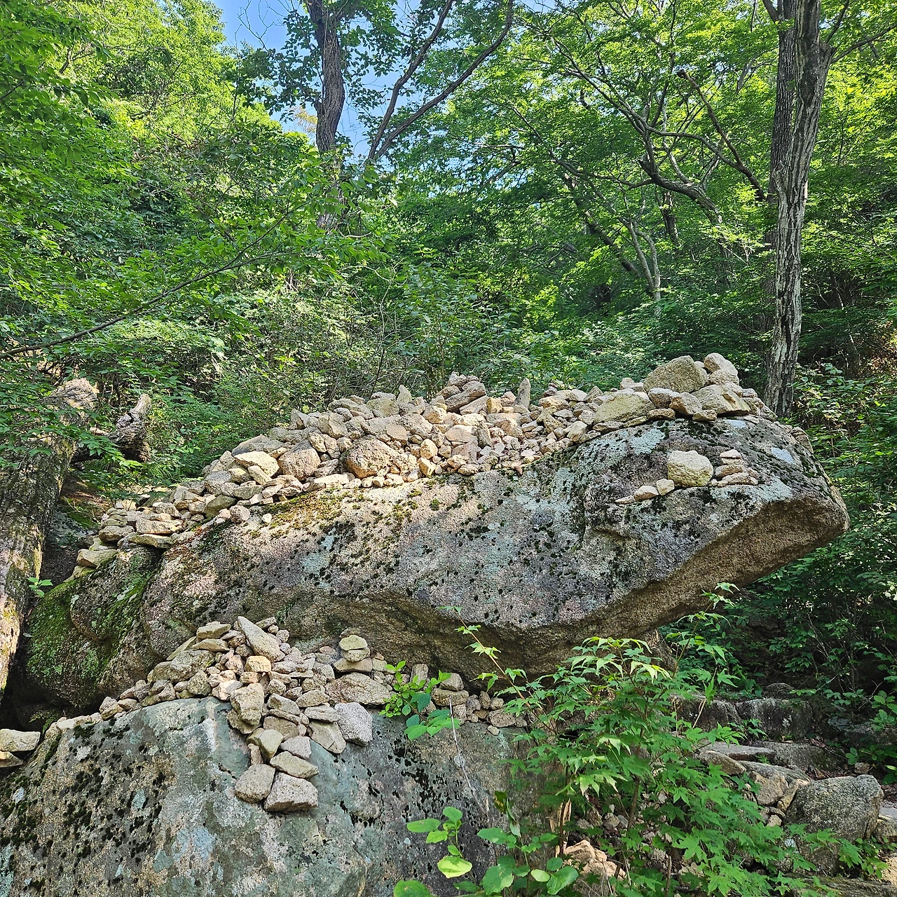 보현재에 도착하였다. 한고비를 올라선 것이다. 지금부터는 좀 더 여유를 갖고 오를 수도 있지만, 그늘에 앉아서 쉬고 있다. 해발고도도 600m를 넘어서고 있다. 처음시작은 300m 정도였는데 300m를 올라온 것이다. 더위가 서서히 고도를 올리면서 찬바람이 불기를 기도하면서 오른다. 그리고 계곡을 흐르는 물소리가 난다. 흐르는 물에 오르면서 흘린 땀을 씻고 또 오르니 냉골이라고는 하는 곳에 도착하였다. 몇몇이 쉬고 있다. 외국의 어느 산을 산행한 추억을 이야기하고 있다. 외국의 산을 트래킹 하는 비용도 만만치가 않다고 하였다. 그곳을 지나 두꺼비 바위가 있는 곳에 도착하였다. 이제 500m 남았다고 한다.