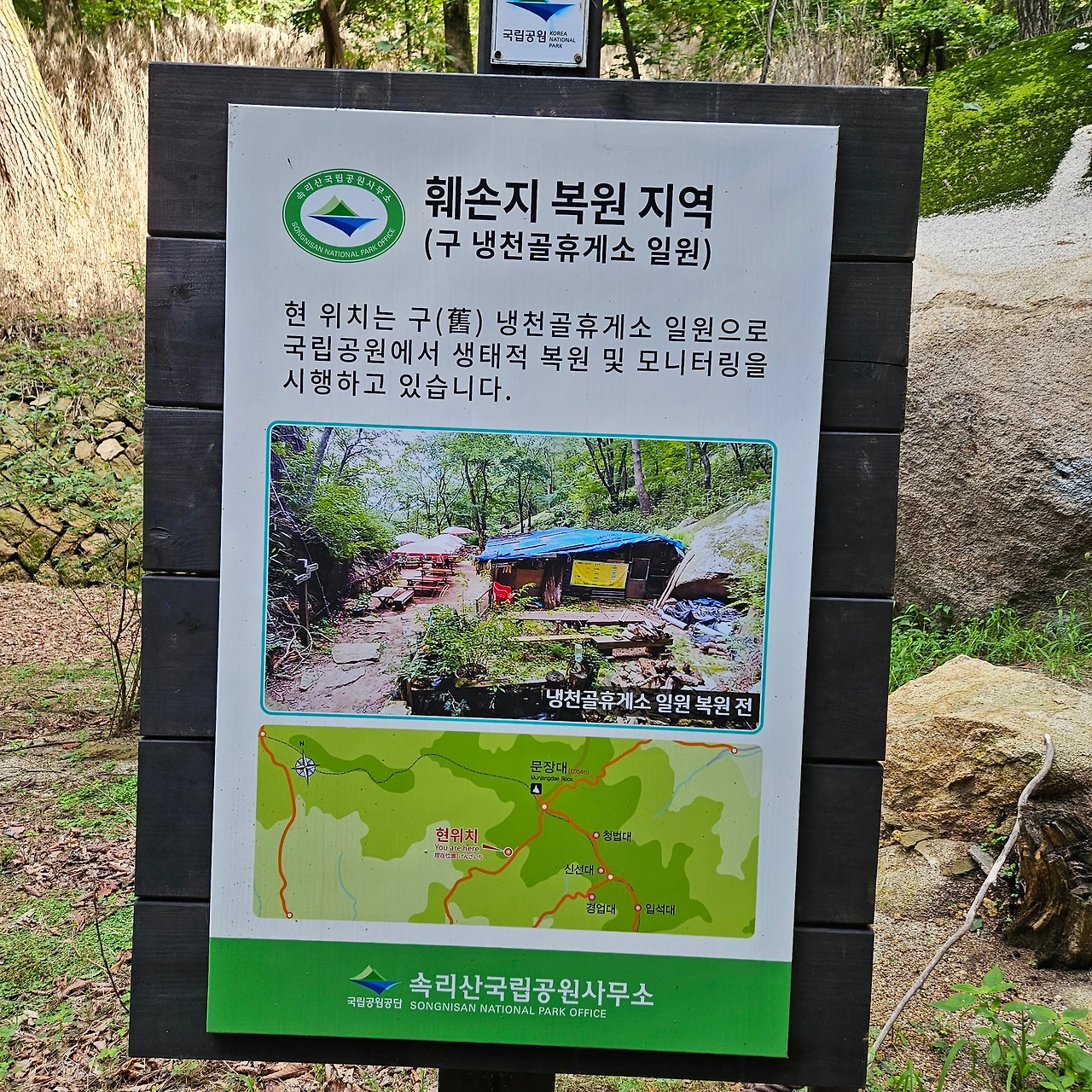 속리산에는 특이한 것이 있다. 민간이 운영하는 음식점이 있다. 용바위골과 신선대가 있다. 예전에는 2곳이 더 있었는데 국립공원공단에서 철거를 시켰다고 언론에 보도된 것을 보았다. 보현재와 냉골에 그러한 음식점이 있었는데 지금은 복원 중이라고 안내판이 되어 있다. 용바위골은 산을 오른 지 얼마 되지 않았는데 몇몇이 앉아 있다. 그들은 문장대에서 내려오는 사람들인 것이다. 오늘 이곳에 산악마라톤 대회가 있었는데 그들이 내려온 것이다. 산을 오르면서 산악마라톤을 한 사람들이 내려오면 비켜서서 기다려 주었다.