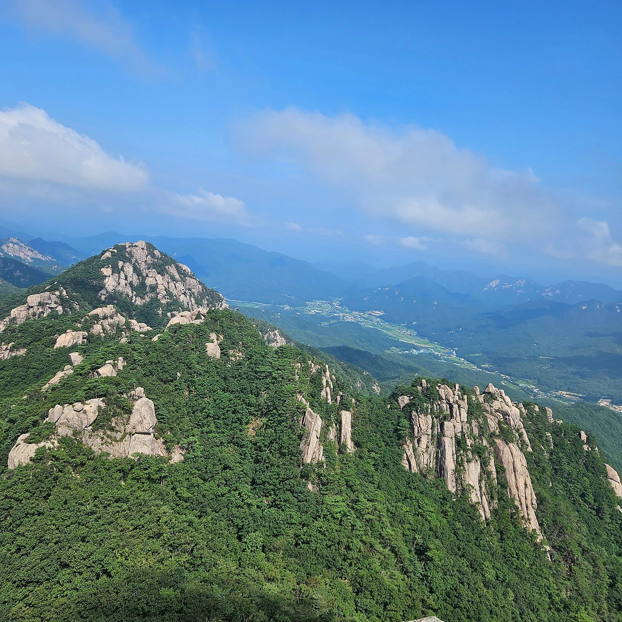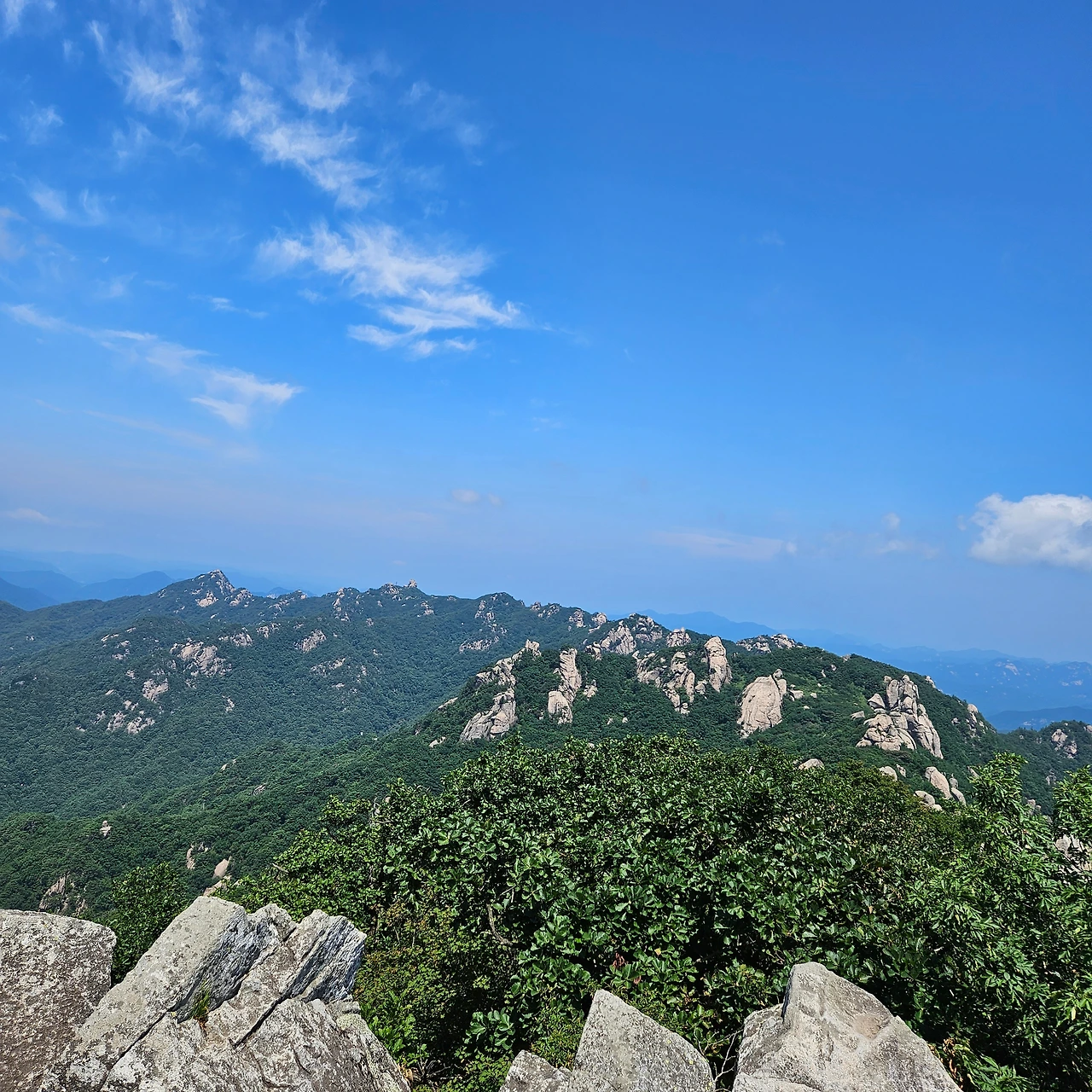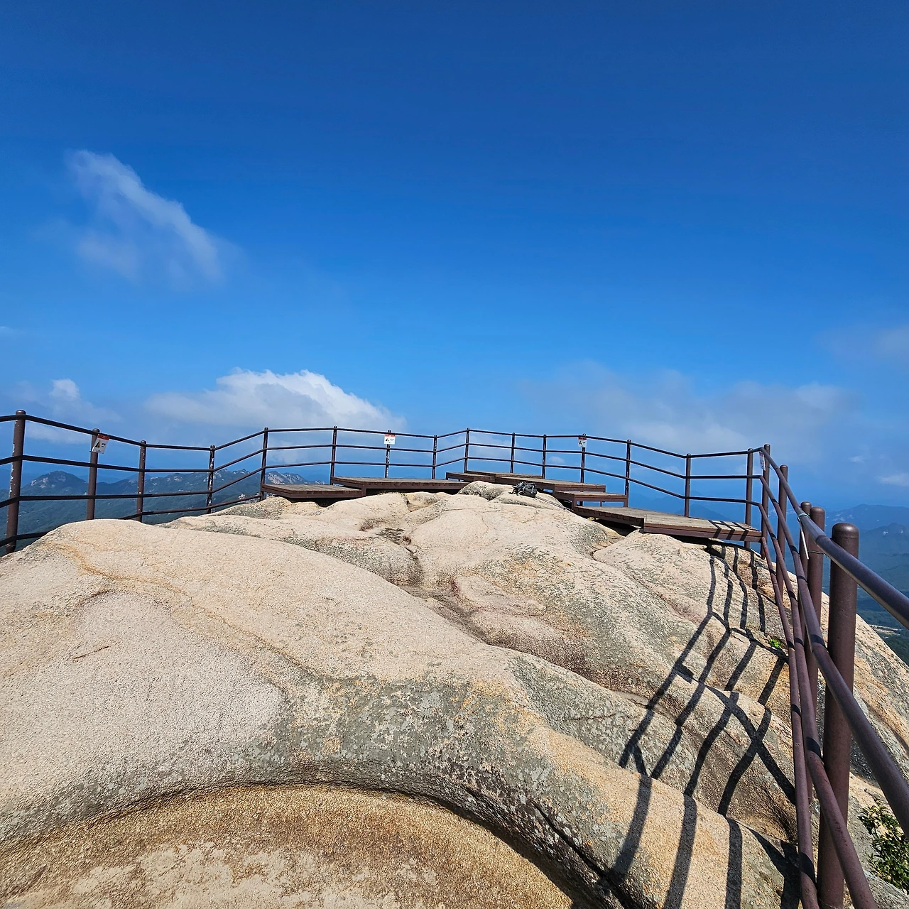고갯마루를 오르고 내리고 그리고 신선대를 오르는데 어떤 분이 계단에서 쉬고 있다. 힘겨운 것 같아서 말을 불일까 하였지만 다시 오르는 것을 보고 천천히 오르는 뒤를 따라 올라간다. 오르자마자 신선대 매점에서 물과 탄산음료를 사는데 5000원이다. 이것이 여기까지 들고 와서 판매한 비용이라고 생각한다. 물을 사드시는 분은 생명의 물이기 5000원도 감지덕지라고 보아야 할 것이다. 신선대의 바위 위에 올라가서 내가 온길을 돌아보면서 문장대까지 사진을 담는다.