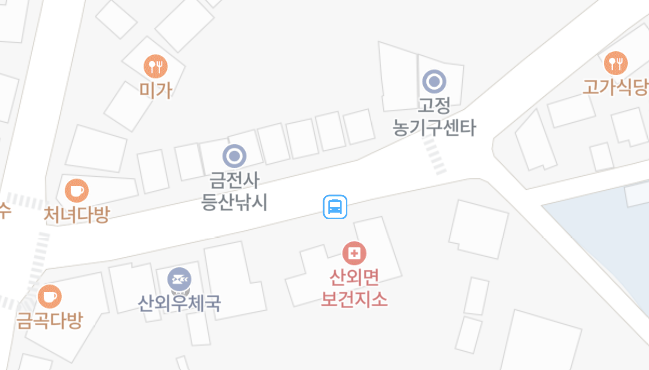 금곡에서 출발하는 버스를 확인하고 어느 곳에 정차하는지를 확인하기 위하여 인터넷을 검색하였으나 어느 곳에서도 알려주지 않았다. 밀양시외버스와 시내버스를 운영하는 회사에 전화하여 문의를 하니 삼거리란다. 사실 삼거리는 맞는데 산외면보건지소 앞이라고 하는 것이 정확하다. 이곳은 밀양 시외버스터미널에서 출발한 버스가 15-20분이 경과하면 도착하는 곳이다. 그래서 밀양시청 홈페이지에서 출발하는 시간을 확인하고 이곳에서 버스를 기다리기로 하였다.