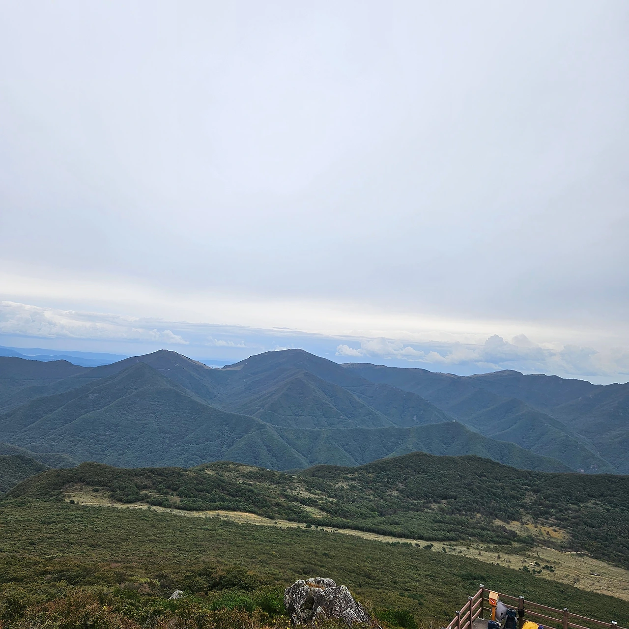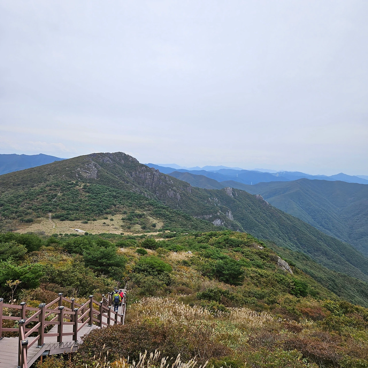 중봉을 지나고 예전에 친구들이랑 영남알프스를 걸을 때 알바를 하였던 계단을 바로 앞에 두고 헤매지 않고 바로 계단으로 들어선다. 끝없이 내려가는 계단이 언제쯤 끝날지 모르겠다. 능동산까지 가는 길은 편하다면 편하다고 할 수 있고 어려우면 어려울 수도 있다. 능동산이 어렵게 느끼는 것은 거리가 3km 정도 되고, 700m 고개까지 내려갔다가 980m 봉우리를 올라가는 것인 만큼 힘들다고 하여야 할 것이다. 데크를 올라가는 데 앞에 가는 등산객들이 끊임없이 오르는 데크를 오르면서 힘들다고 하였다.