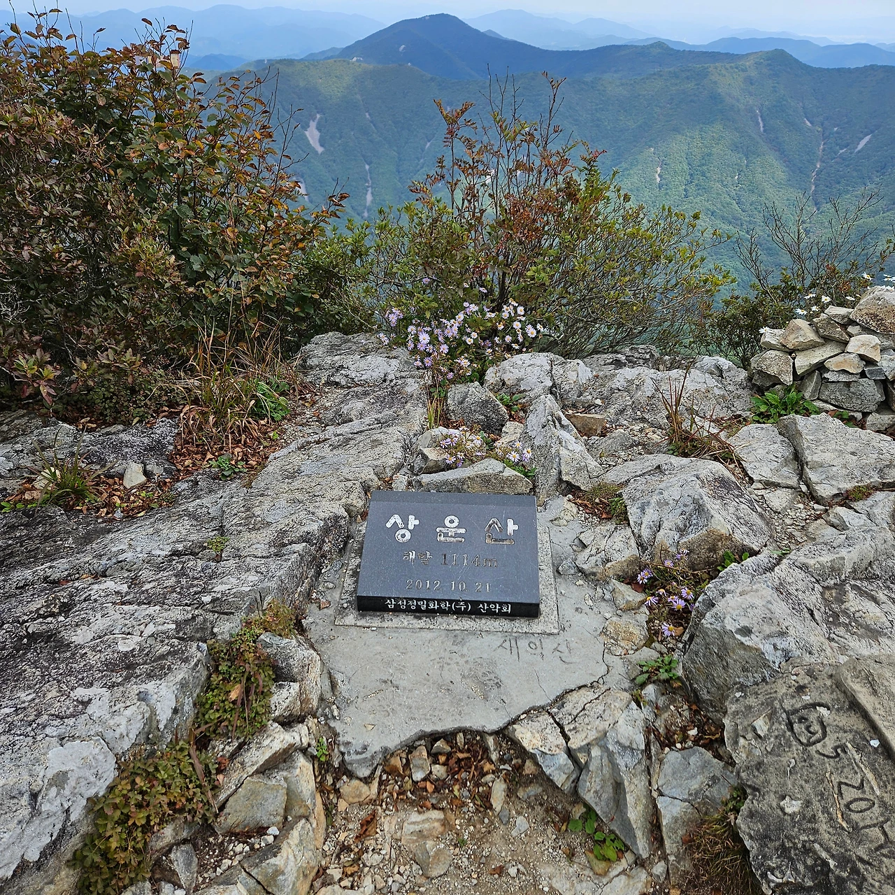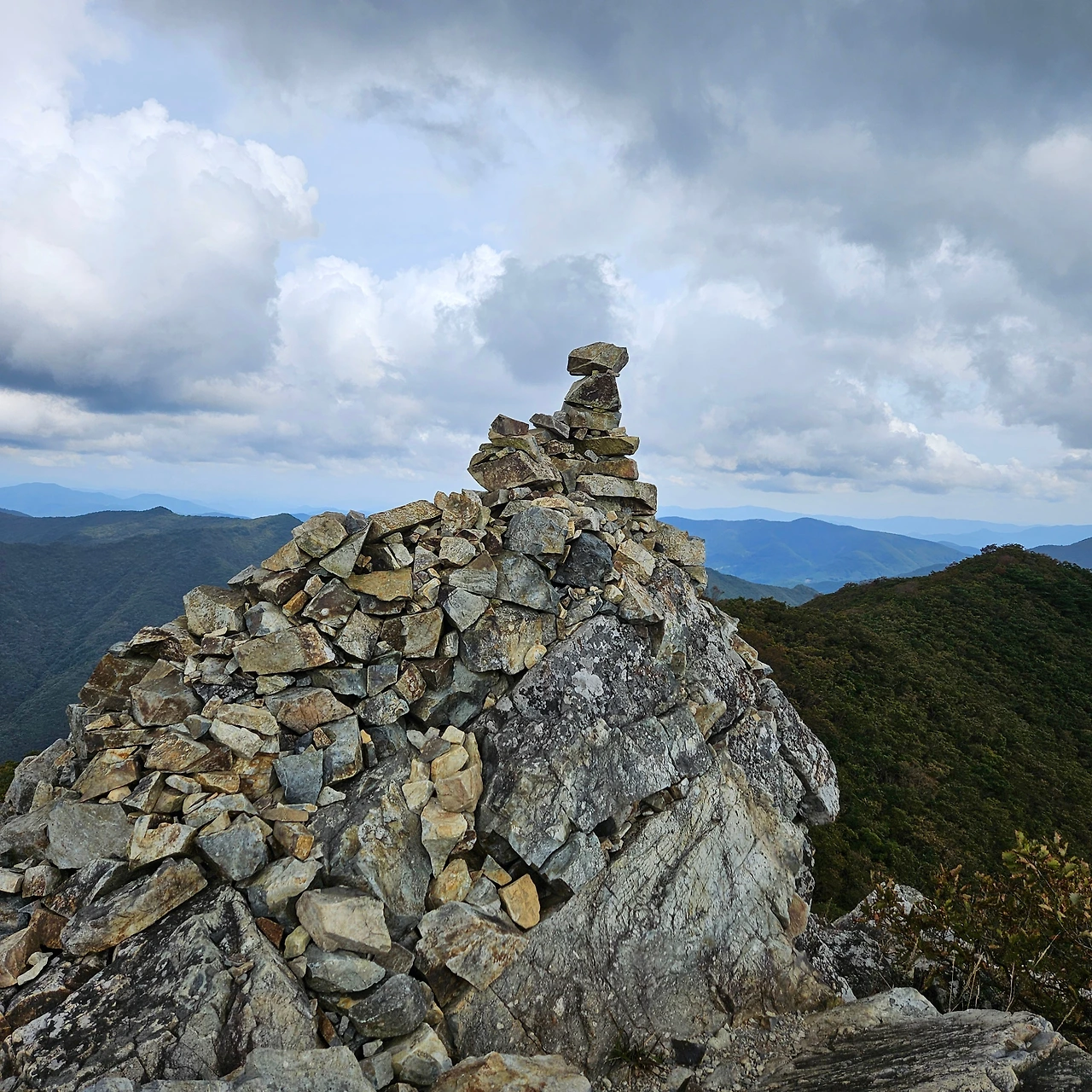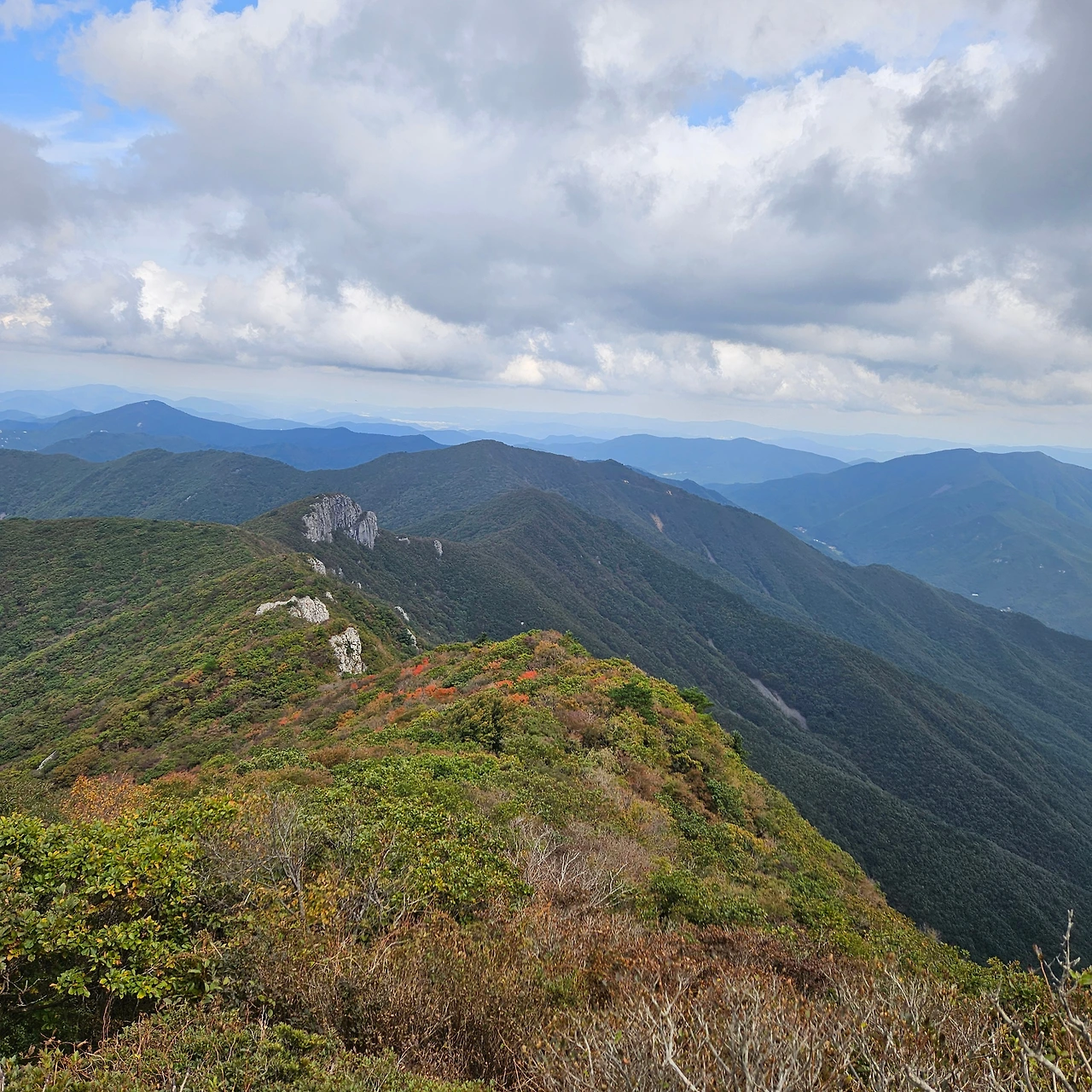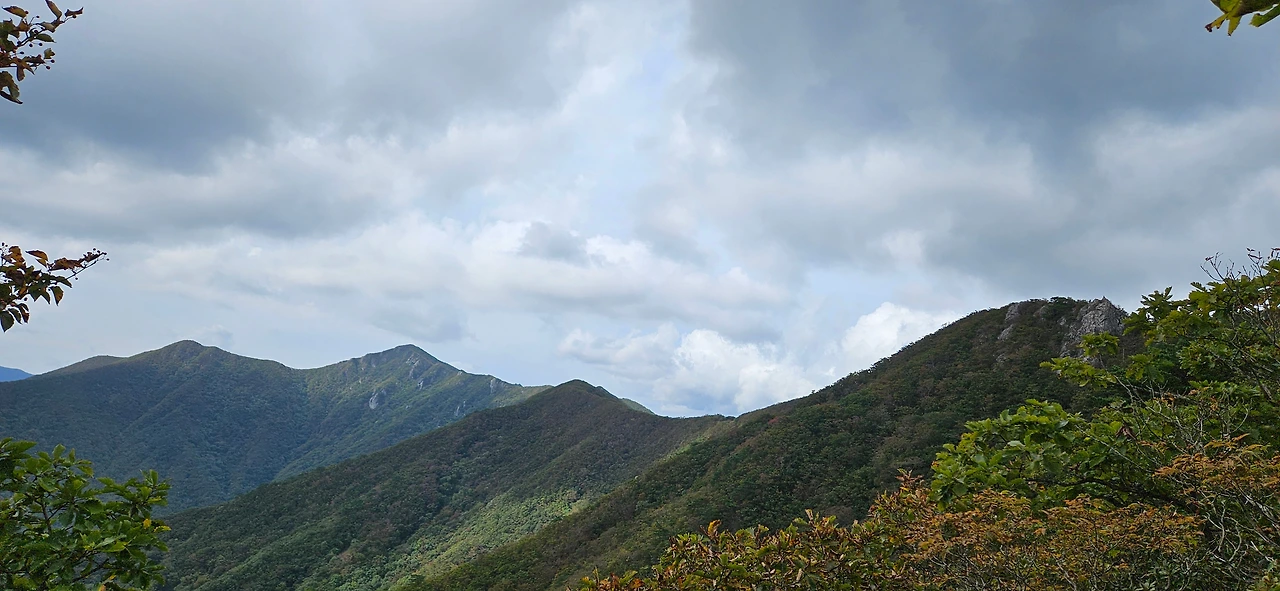 쌀바위를 뒤편으로 난 등산로를 따라 오르면 쌀바위를 우회하고 능선을 오르고 가지산 정상에 도착한다. 설악에 단풍이 시작되었다는 얘기를 들었는데 가지산 정상에도 단풍이 들었다. 그리고 우리가 올라온 길을 돌아보니 감회가 새롭다. 그리고 우리가 가야 할 길을 보니 심란하다. 이제 올라온 길이 8km 정도인데 가야 할 길이 20km가 넘는다. 10월에는 오후 6시가 되면 어둠이 찾아온다. 그 생각을 하니 발걸음이 빨라지는데 발은 천천히 움직일 수밖에 없게 가파른 내리막 돌길이다. 마음만 바쁠 뿐이다.