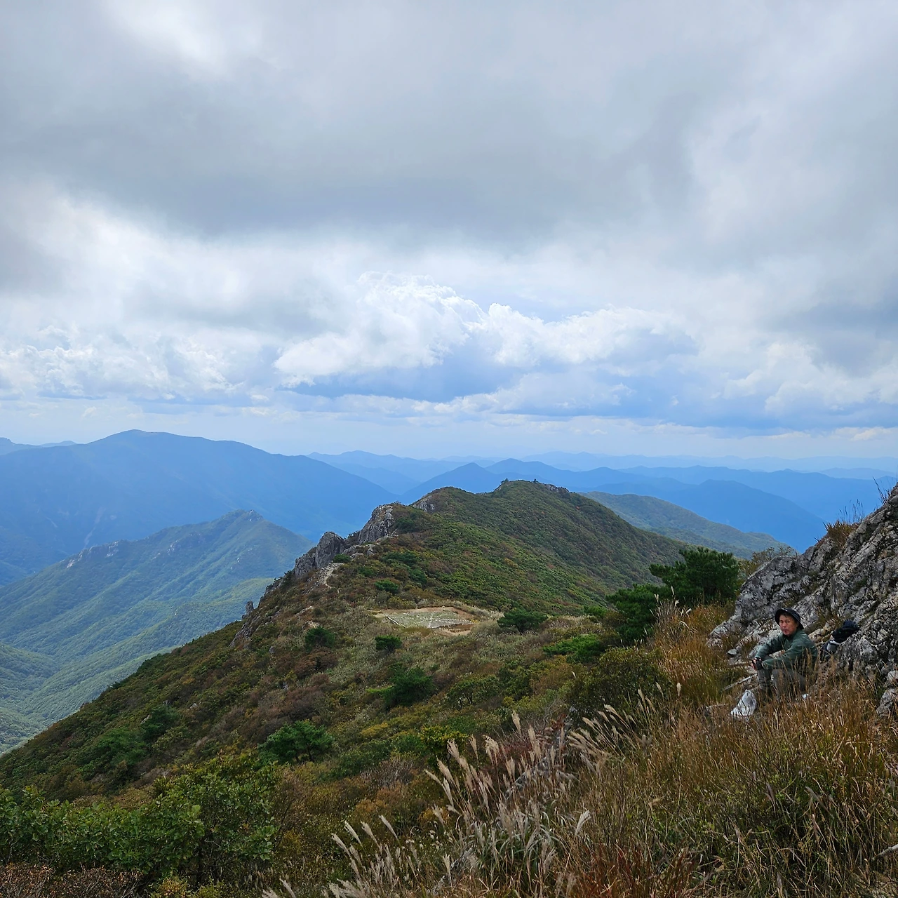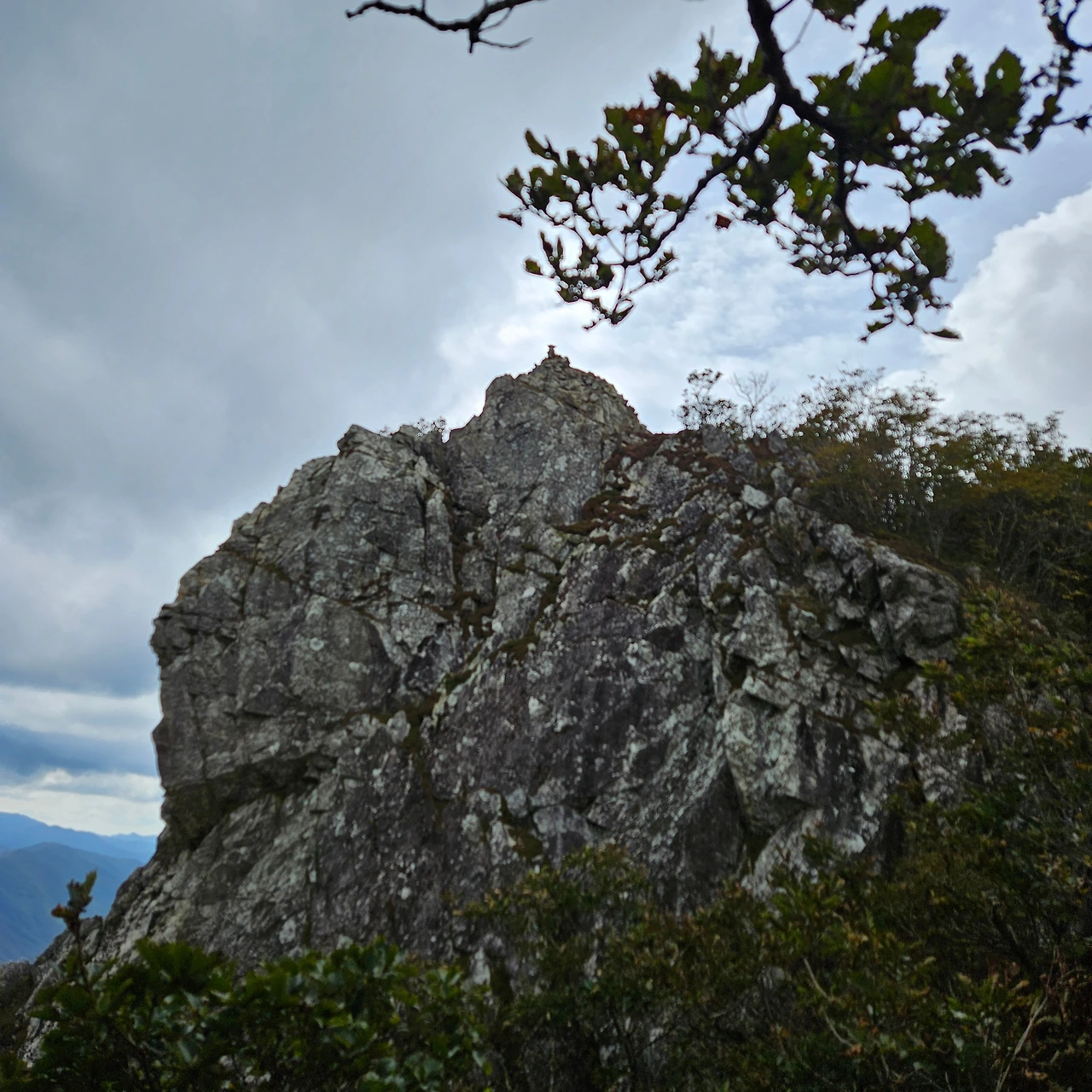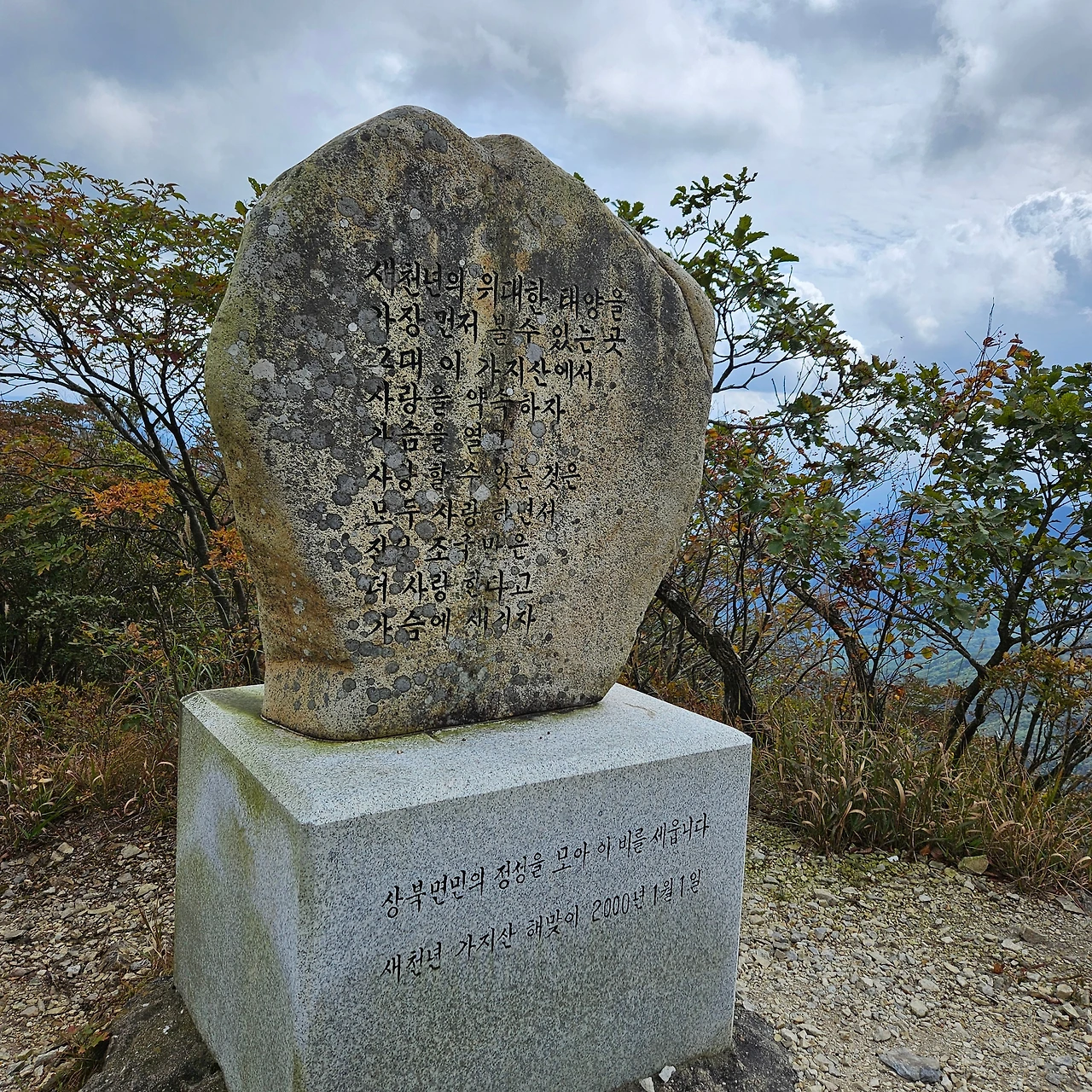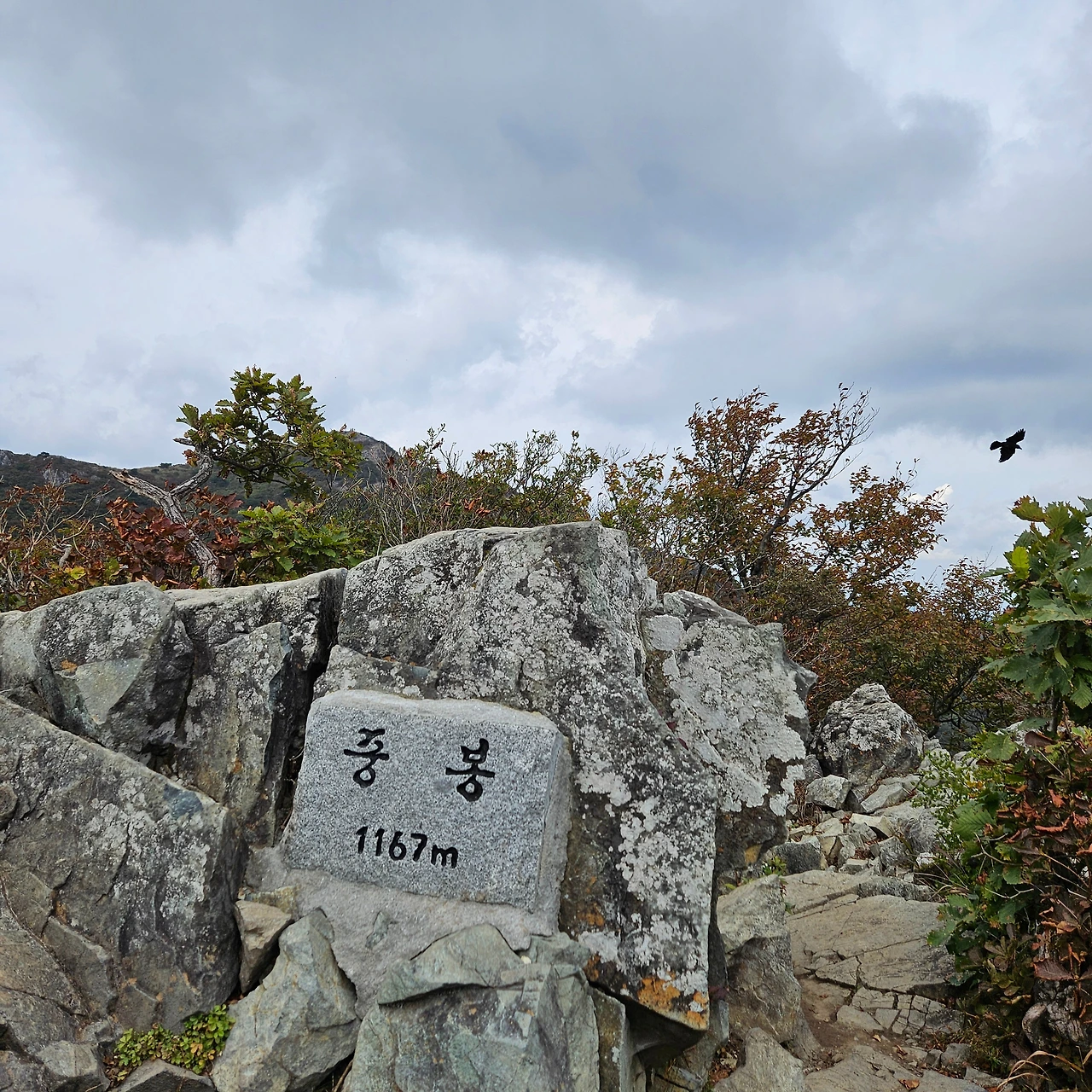 쌀바위를 뒤편으로 난 등산로를 따라 오르면 쌀바위를 우회하고 능선을 오르고 가지산 정상에 도착한다. 설악에 단풍이 시작되었다는 얘기를 들었는데 가지산 정상에도 단풍이 들었다. 그리고 우리가 올라온 길을 돌아보니 감회가 새롭다. 그리고 우리가 가야 할 길을 보니 심란하다. 이제 올라온 길이 8km 정도인데 가야 할 길이 20km가 넘는다. 10월에는 오후 6시가 되면 어둠이 찾아온다. 그 생각을 하니 발걸음이 빨라지는데 발은 천천히 움직일 수밖에 없게 가파른 내리막 돌길이다. 마음만 바쁠 뿐이다.