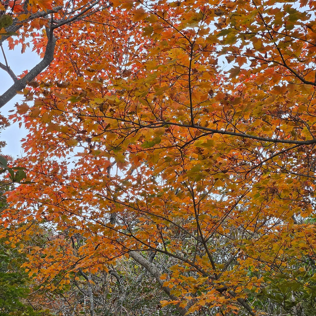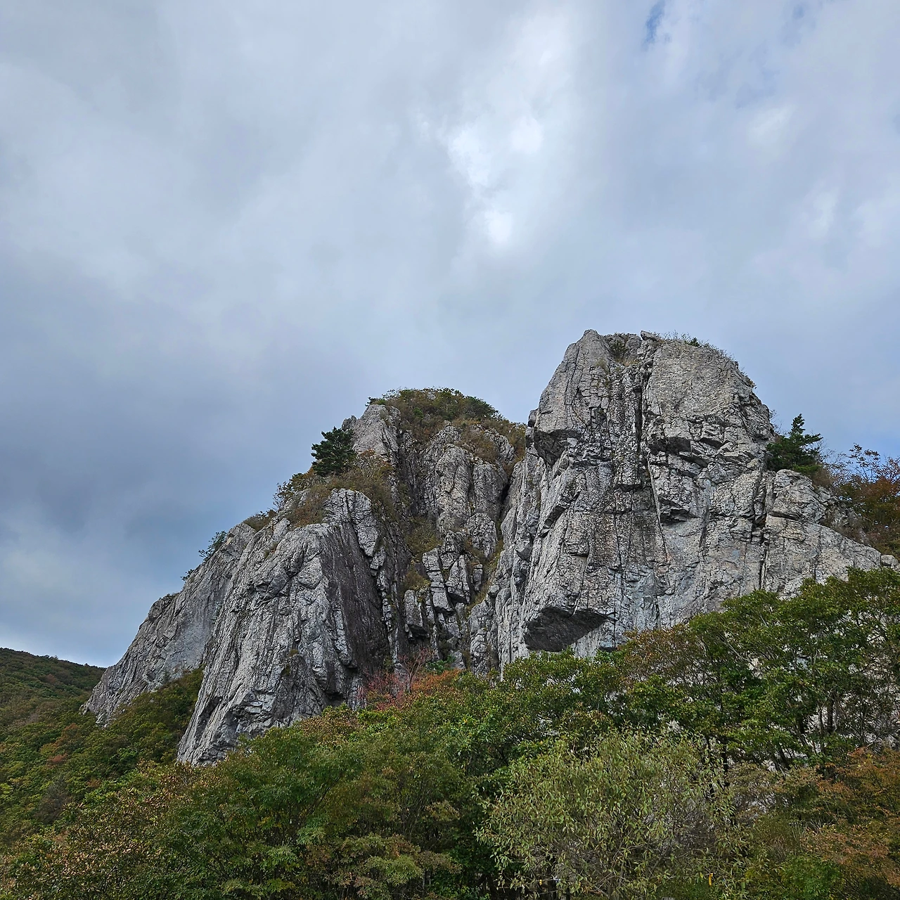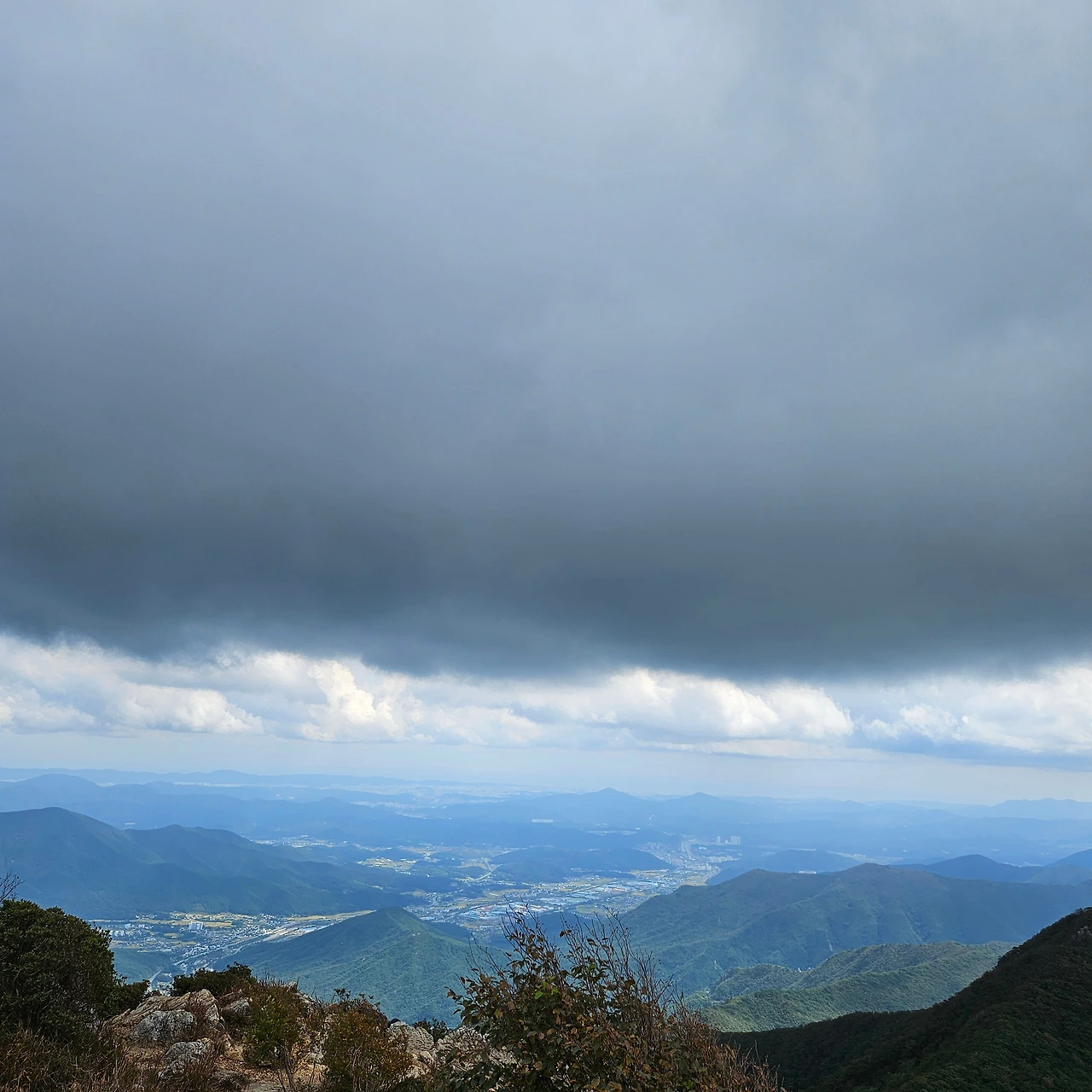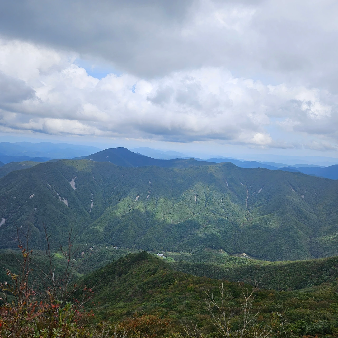 쌀바위를 뒤편으로 난 등산로를 따라 오르면 쌀바위를 우회하고 능선을 오르고 가지산 정상에 도착한다. 설악에 단풍이 시작되었다는 얘기를 들었는데 가지산 정상에도 단풍이 들었다. 그리고 우리가 올라온 길을 돌아보니 감회가 새롭다. 그리고 우리가 가야 할 길을 보니 심란하다. 이제 올라온 길이 8km 정도인데 가야 할 길이 20km가 넘는다. 10월에는 오후 6시가 되면 어둠이 찾아온다. 그 생각을 하니 발걸음이 빨라지는데 발은 천천히 움직일 수밖에 없게 가파른 내리막 돌길이다. 마음만 바쁠 뿐이다.