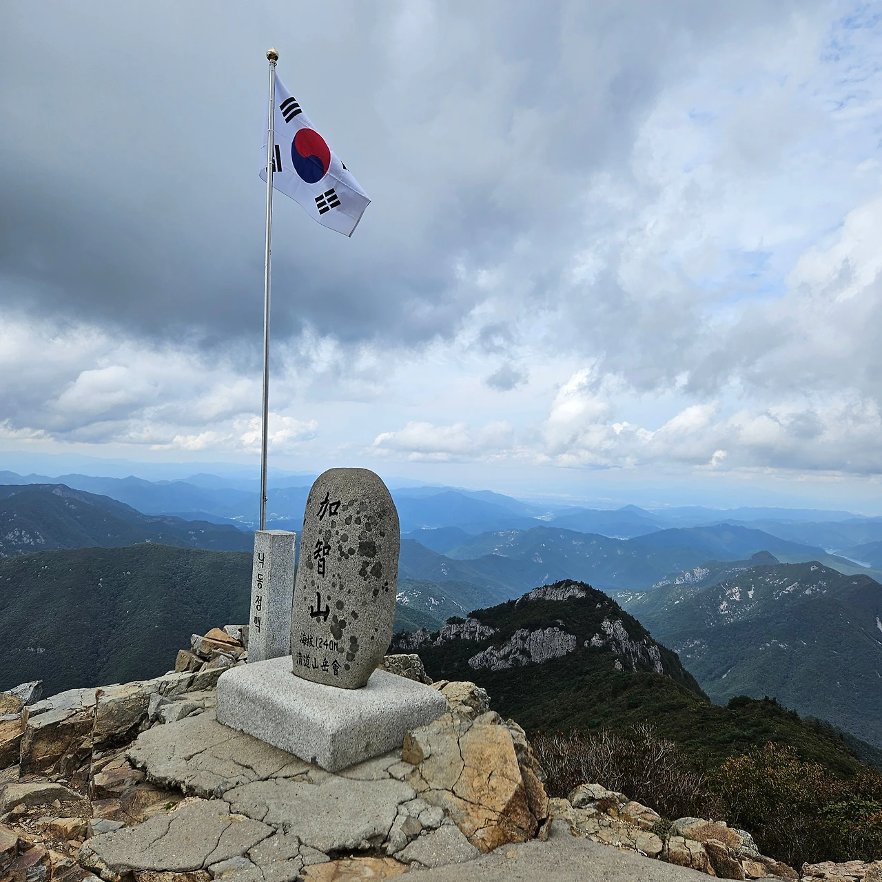 가지산 정상에서 인증샷을 남긴다. 가지산 정상에는 청도군에서 설치한 정상석도 있고 울주군에서 설치한 정상석도 있다. 울주군에서 설치한 정상석은 영남알프스의 같이 알리고 있다. 석남터널 쪽에서 올라온 사람들이 대다수이고 우리가 올라온 방향으로 하산을 하고 있다. 울주군청에서 안내하고 있는 등산로도 석남사-석남고개-가지산-쌀바위-상운산-귀바위-석남사다. 이 등산로가 6시간이다. 우리는 3시간에 걸쳐서 올라왔고 이제는 내려갔다. 멀리 재약산까지 가야 한다.