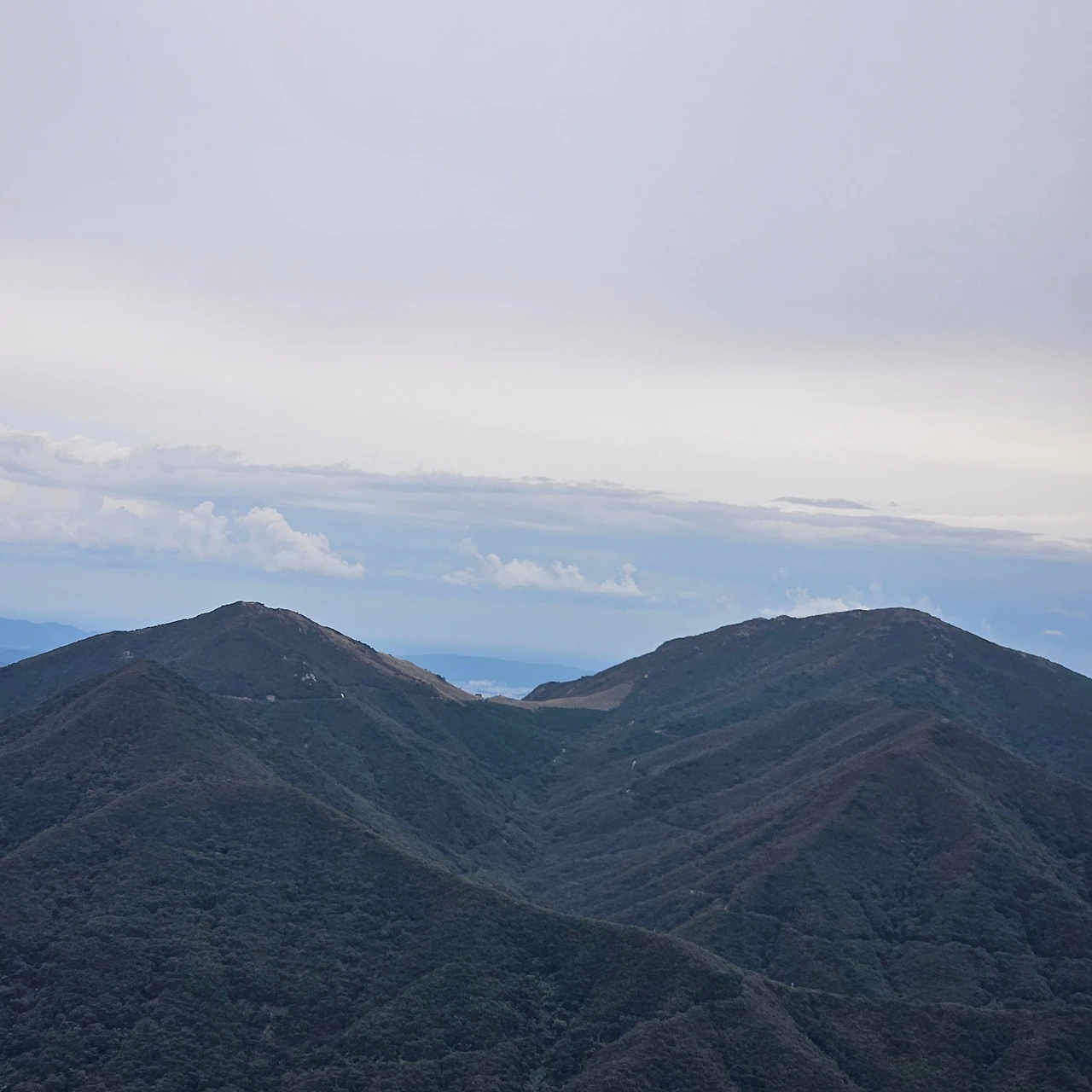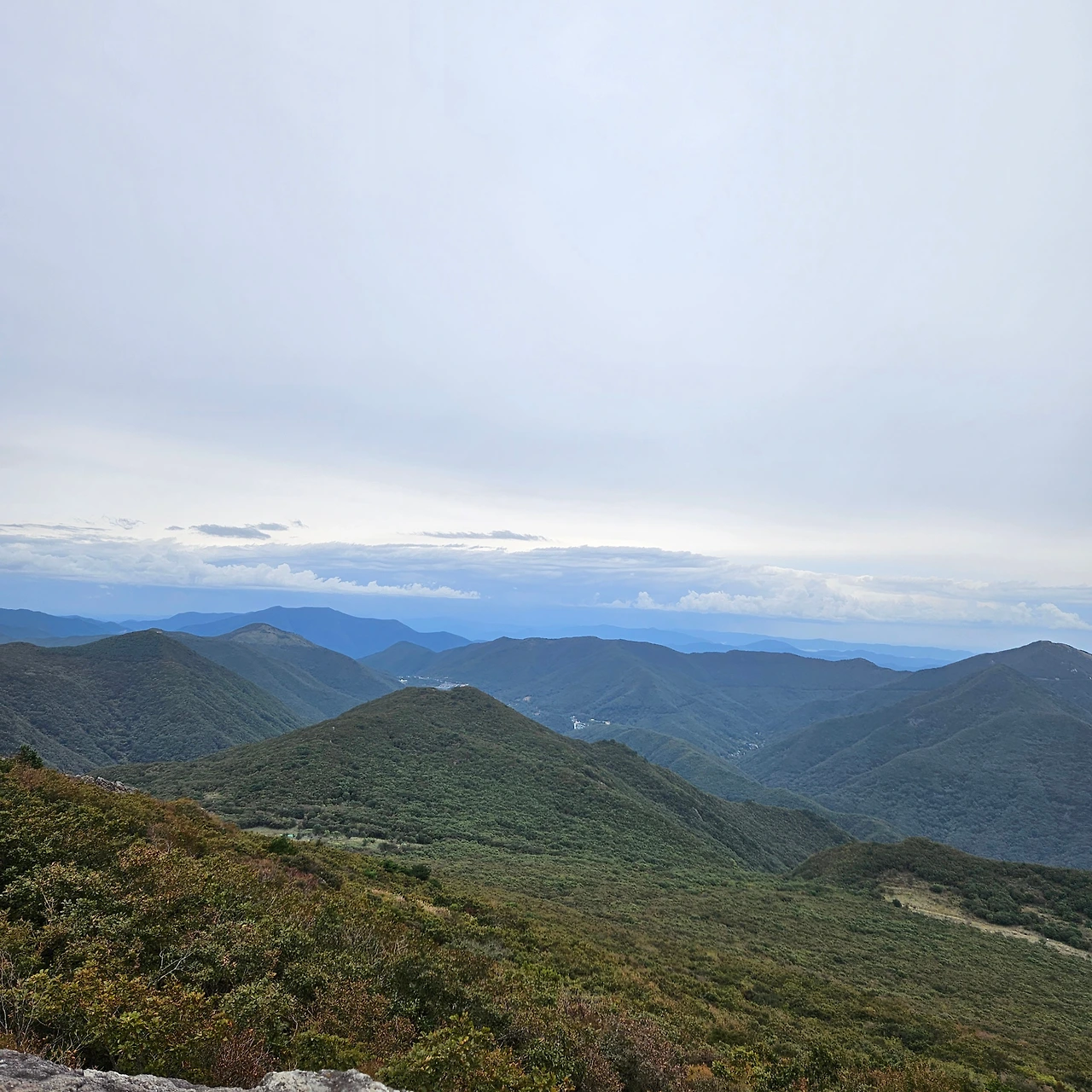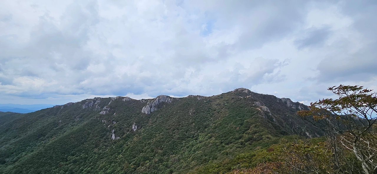 풍광도 없이 오르고 오른다. 갑자기 임도를 만나다. 임도와 등산로는 이웃하면서 계속 같이 이동을 한다. 귀바위 근처를 가면서 임도는 아래로 등산로는 정상을 가리킨다. 귀바위를 만나기 전에 평탄한 등산로를 만나면서 해발고도를 확인해 보니 1000m를 넘어섰다. 1시간 30분을 즐기차게 오른 결과 우리는 1000m를 오른 것이다. 귀바위를 보고 멀리 가지산을 같이 본다. 그리고 조금 더 오르면 상운산이 나타난다. 상운산은 영남알프스의 9봉에 속해 있지 않지만 해발이 1114m이다. 어쩌면 영남알프스의 가지산의 한 봉우리처럼 보여서 영남알프스의 9봉에 속하지 않았을 것이다.