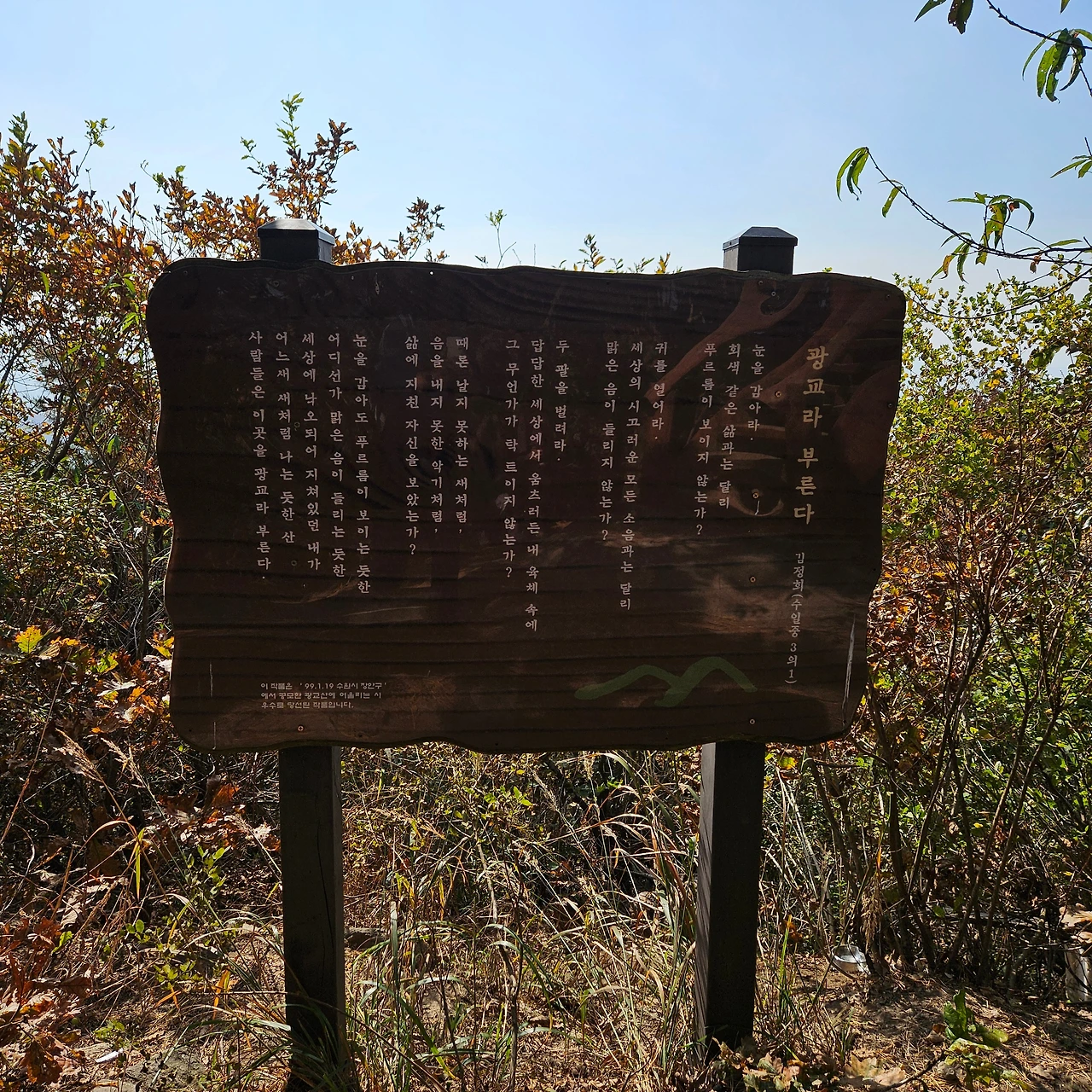 학교를 다닐 때 팔달산과 광교산을 오르내렸는데, 팔달산은 현재 수원 화성의 정상이고 누구나 오르는 산이고 산책길이다. 등산이라고 하는 이름 붙여진 산은 광교산이다. 용인, 수원, 의왕에 걸쳐 있는 광교산 백운산을 이곳 근처에 있는 사람들은 근교산으로 보고 서울에 있는 사람들이 청계산을 가듯이 간다. 그래서 오늘은 수원의 광교산을 간다. 광교산을 3년 전쯤 걸어보았는데, 오늘은 짝꿍이 동행하였다. 광교산은 고려 태조 왕건이 산에서 광채가 솟구치는 모습을 보고 '부처님의 가르침을 주는 산'이라 해서 광교산이라 이름을 붙였으며 수원시와 용인시의 경계를 이루는 산으로 수원시를 북에서 감싸안고 있는 형상을 한 수원시의 진산이다.