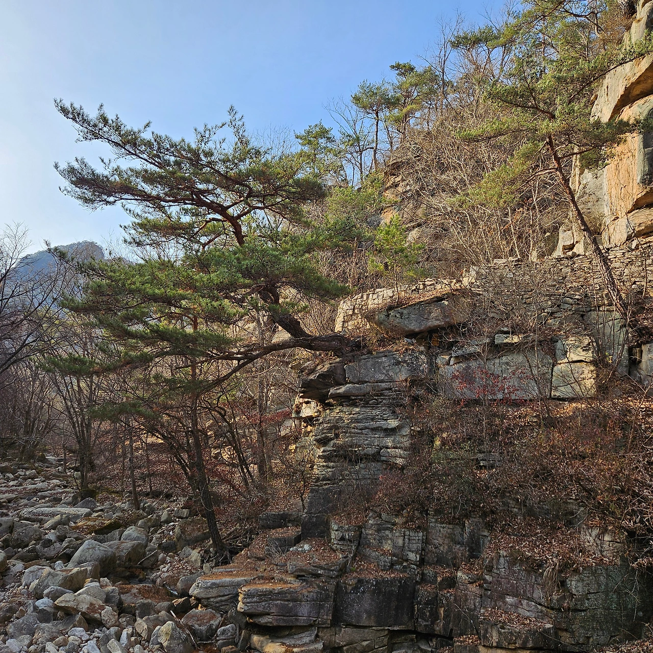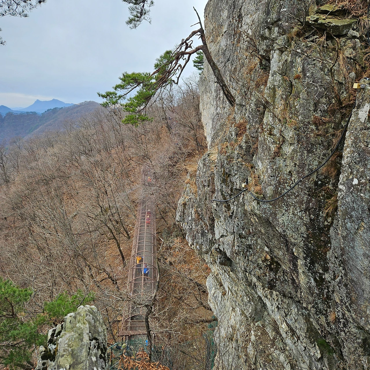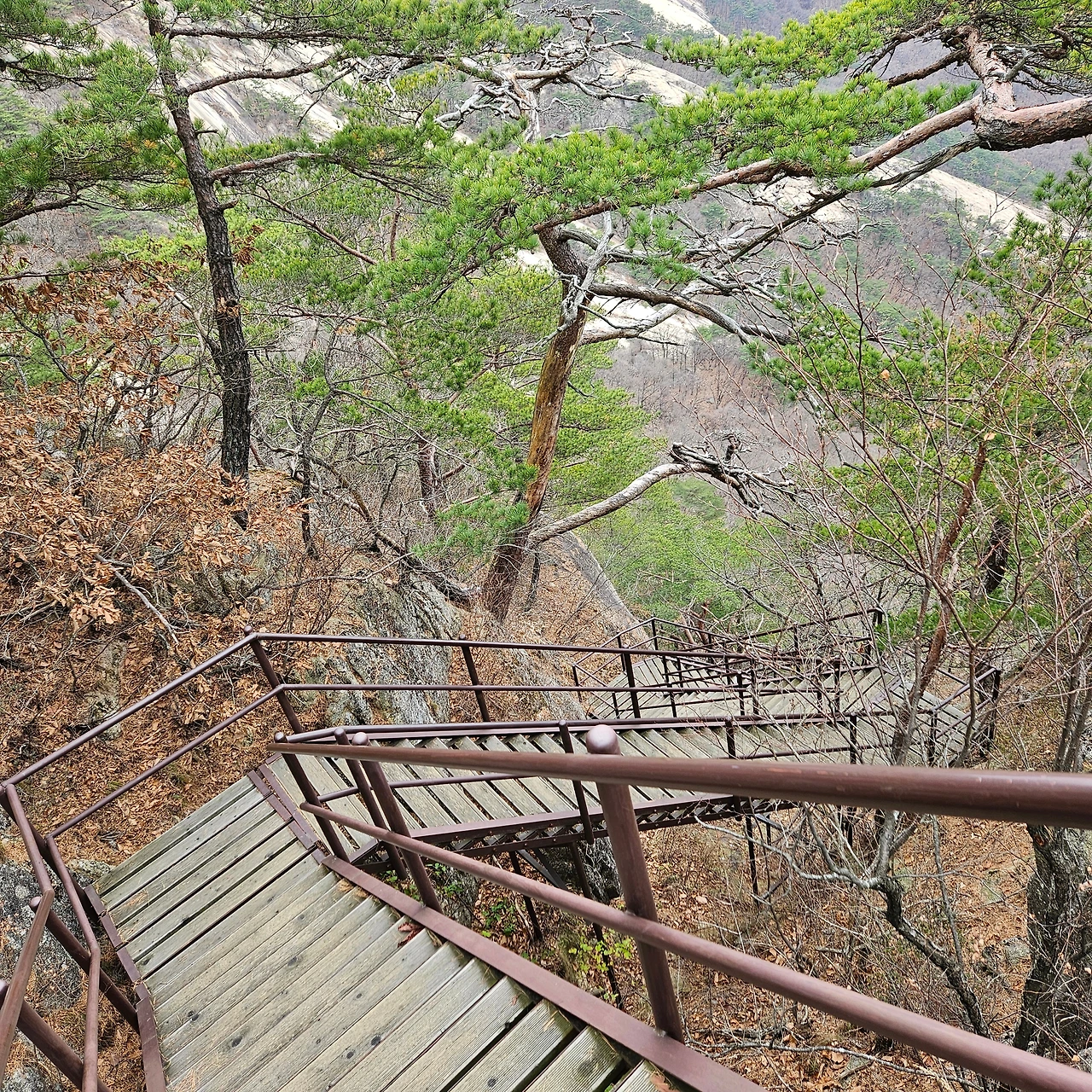 산을 올라오는 사람들이 많다. 대부분이 신륵사쪽에서 올라오고 있다. 내려가면서 데크를 보니 만개의 계단아 저절로 생각이 난다. 10층이상의 높이를 계단을 통해 오르면 영봉 정상이라고 올라오는 사람들이 물어보면 답변을 한다. 영봉 밑을 지나면서 돌이 떨어지는 것을 피하기 위하여 철망을 만들어 놓은 것을 보고 세심함에 감탄을 한다. 영봉아래를 지나면서 옛 등산로와 울타리가 훼손된 것을 보면 낙석의 위험을 알 수 있다. 영봉을 오르면서 아름답게 보았던 등산로에 들어섰다. 하산길이라서 더욱 아름답다고 해야 할 것이다. 영봉의 그 암릉이 보이는데 앙상항 나뭇사이로만 보일 뿐 사진으로 담을 수 없다. 송계로 내려가는 동창교 안내판이 있고 안전산행 쉼터가 있지만, 언제 물을 열지 모르게 잠겨 있다. 코로나 시절 사람들이 모이는 것을 없애기 위하여 닫아 둔 것 같은데 그것이 아직도 닫혀있다고 보아야 할 것이다. 이제는 겨울이다. 추위와 바람에서 쉬고 픈 등상객들을 위하여 문을 열어야 될 것 같다.