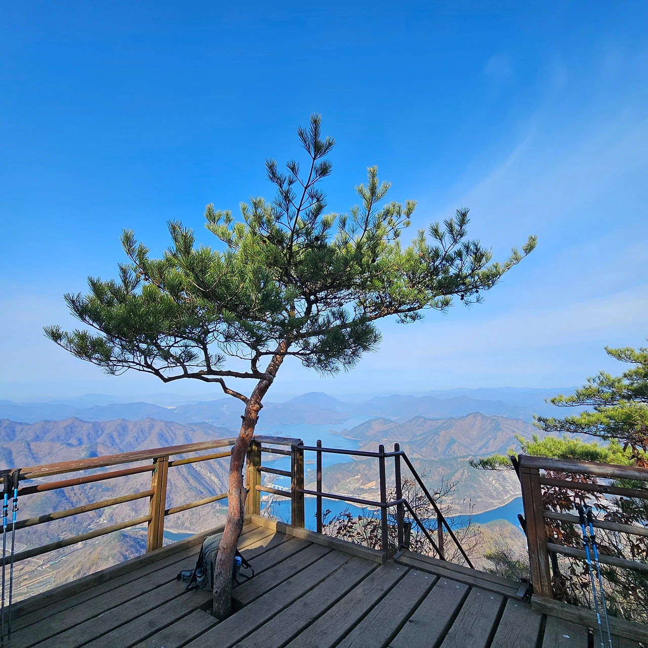 이제는 본격적인 산행의 시작이다. 사실 수산리 입구에 자동차를 세우고 이곳까지 2km 정도 걷는 길도 해발을 상당히 높이고 있지만 이곳까지는 준비운동으로 보고 이제 본격적인 산행을 시작한다. 월악산은 1만 개의 계단이라고 한다. 그 계단을 걷다가 보면 어느새 산 정상이고 산행이 끝이 난다고 하였다. 오늘도 그 길이 시작된 것이다. 보덕암을 지나자마자 오르막이 시작된다고 보아야 할 것이다. 산입구에서 추워서 옷을 많이 입고 온 사람들이 옷을 하나둘 벗어서 배낭 속에 넣고 있다. 배낭이 두툼해지고 있다. 하봉을 오르기 위하여 쉼 없이 오른다고 보아야 할 것이다. 조망이 나타나고 있지만 떨어진 낙엽사이에서만 보일 뿐이다. 탁 트인 전경은 없다. 어느새 오르다 보면 등산로 없음이라 표시가 되어 있는 지역에 도착한다. 예전에는 하봉을 오르지 못하고 우회하였는데 지금은 국립공원공단 측에서 데크를 설치하여 오를 수 있게 해 놓았다. 오르면서 뒤를 돌아보면 멋있는 경치를 볼 수 있다. 그 모습을 담기 위하여 하나둘 데크에 서 있다. 그리고 전망대가 있다. 소나무가 중심을 잡고 있고 그 아래로 충주호가 멋진 경치를 폼내고 있다.