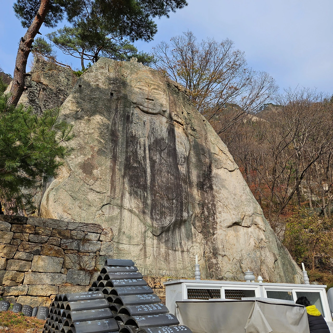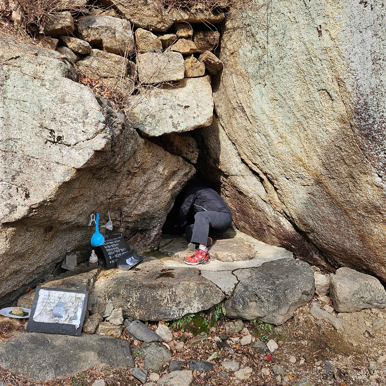 미륵불로 내려가는 계단이 가파르다. 조심스럽게 내려갈 뿐이다. 바위들이 움직이는지 확인할 수 있는 장치들이 설치되어 있다. 안전한 산행을 도모하고 사람들이 다치지 않게 준비를 하는 것이다. 미륵불에 도착하였다. 신라말 고려초에 유행하였던 미륵사상이 여기에도 있는 것이다. 마애타자의 전설이 여기에도 있고 덕주공주의 전설도 있다. 미륵불 암자의 삼성각 밑에 있는 샘터가 있는데 그 샘터의 물을 먹기 위하여는 스스로 머리를 숙여야 한다. 그 샘터의 물을 먹는 사람들이 등산객도 있고 거주하는 스님도 있다. 스님의 요사체로 물을 전달하기 위한 호스가 있는데 어디에서 세는지 소리가 나고 있다. 이것이 지인에게 공덕을 쌓게 했다.