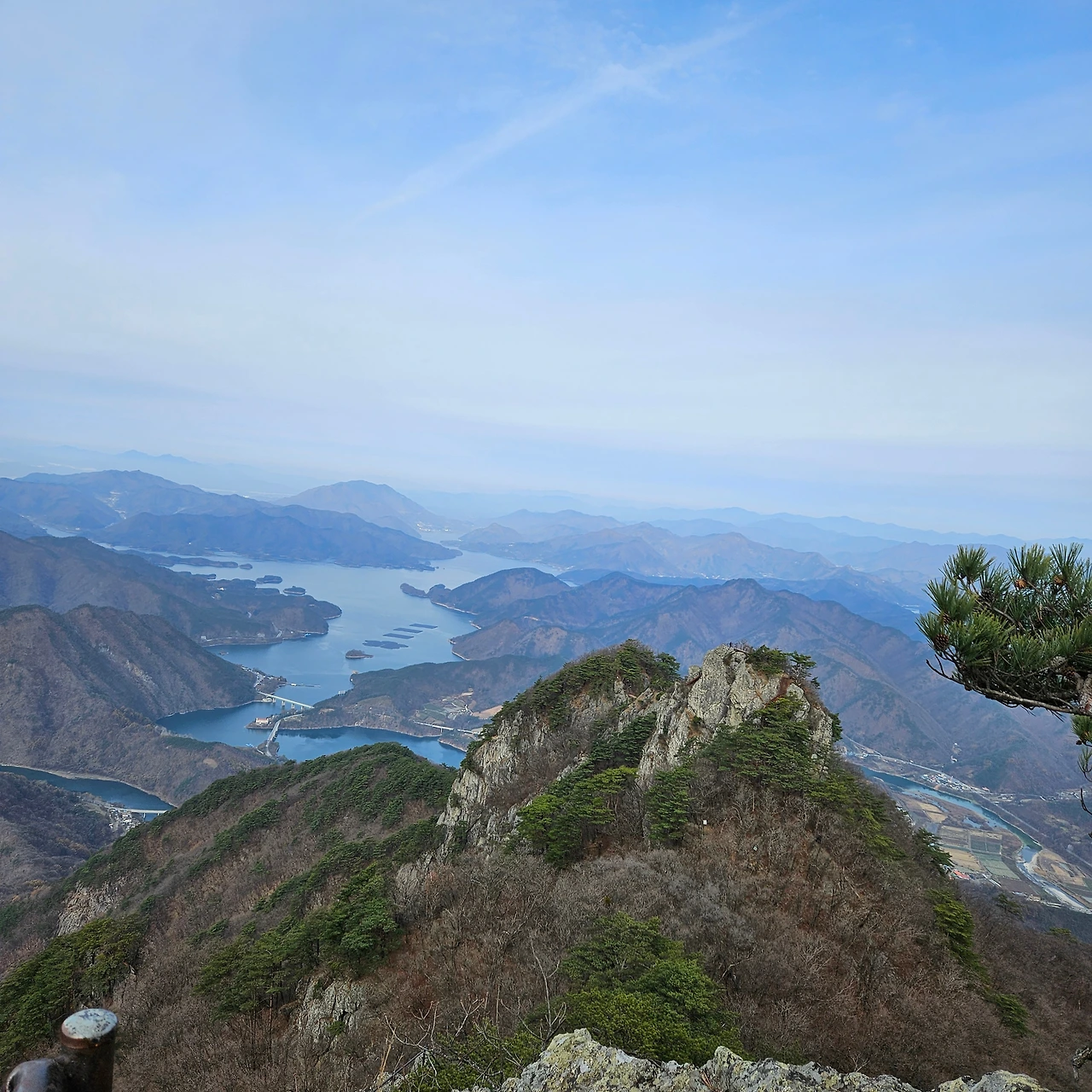 중봉이다. 예전에 무서운 철계단이 있었는데 어느새 안전한 데크길로 변모되어 있다. 그 철계단이 나에게는 공포였는데 이제는 그렇지 않다. 모든 사람들이 철계단을 오르면서 한 발짝 오를 때마다 오른쪽이 아닌 왼쪽으로 걸어서 올라갔는데 그렇지 않다. 그 중봉을 그렇게 쉽게 오르고 다시 뒤를 돌아 하봉과 함께 충주호를 담는다. 오늘은 앞으로 방향보다 뒤로 돌아서서 사진을 담는다고 보아야 할 것이다. 앞으로의 방향은 거의 없고 뒤로 돌아서서 올라온 길을 돌아본다.