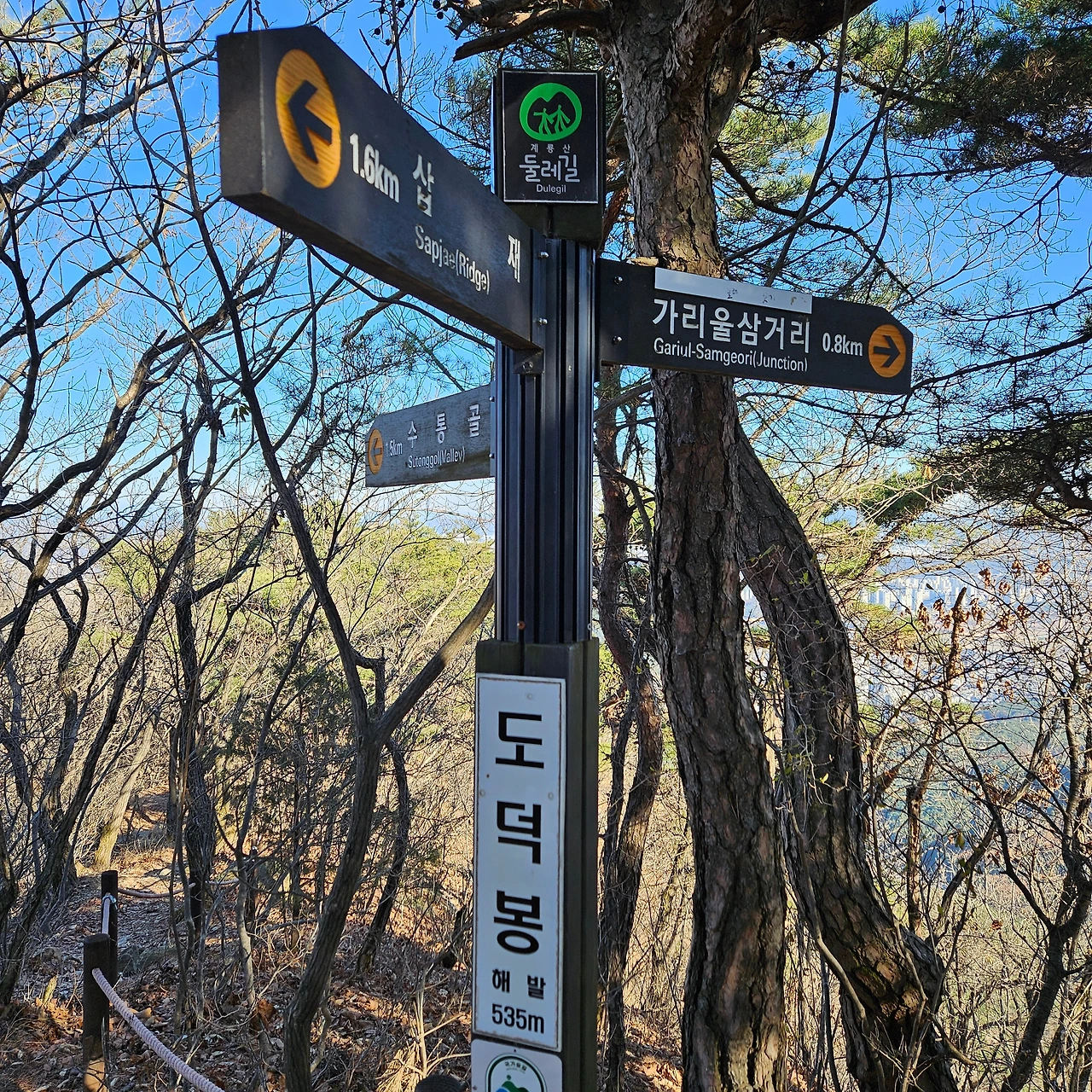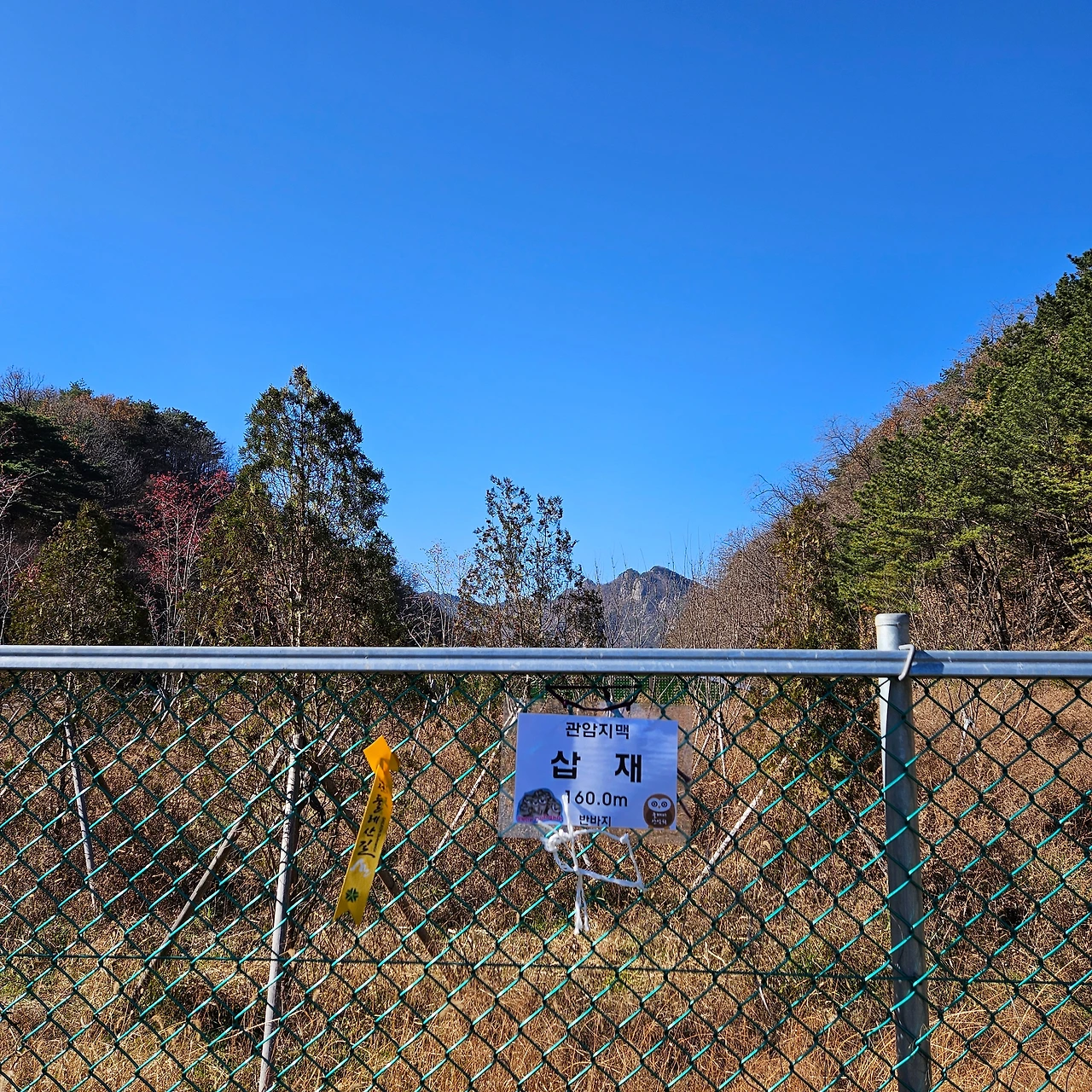 삽재다. 예전에는 도로를 가로질러 건너야 했으나 생태통로를 만들어 놓아 누구나 쉽게 건널 수 있다. 생태통로라고 하지만 한쪽에 문이 설치되어 있어 동물들이 쉽게 지나다닐 수는 없을 것 같다는 지인의 의견이다. 삽재 생태통로를 벗어나면 이제는 국립공원지역이다. 국립공원에서 등산로를 표시해 두었고 나머지는 등산로가 아니라는 표시를 해두었다. 길을 잃어버릴 염려는 없다. 우리가 466m에서 내려와서 다시 올라가야 하고 4시간 정도 걸어왔으므로 체력이 떨어졌는데 도덕봉 535m를 올라야 하므로 힘이 든다고 할 수 있다.